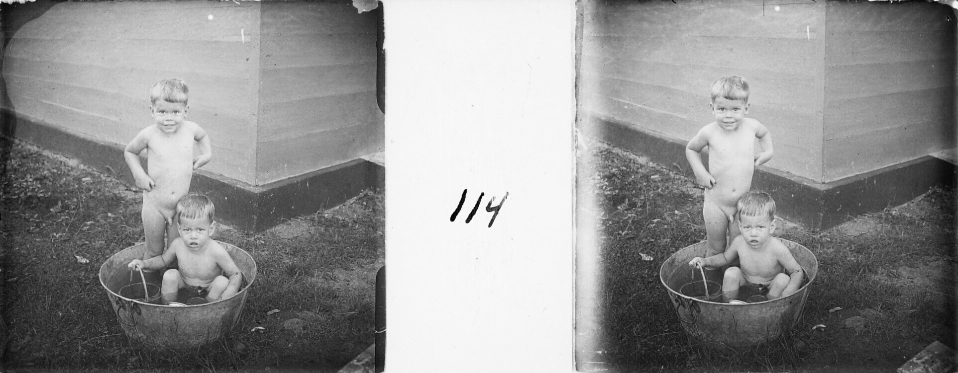 De broers Henk en Hans Japing in een wastobbe, Olehleh