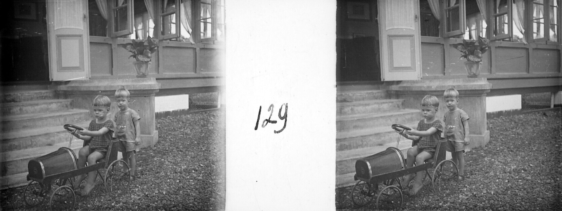 De broers Henk en Hans Japing met een trapauto voor ...