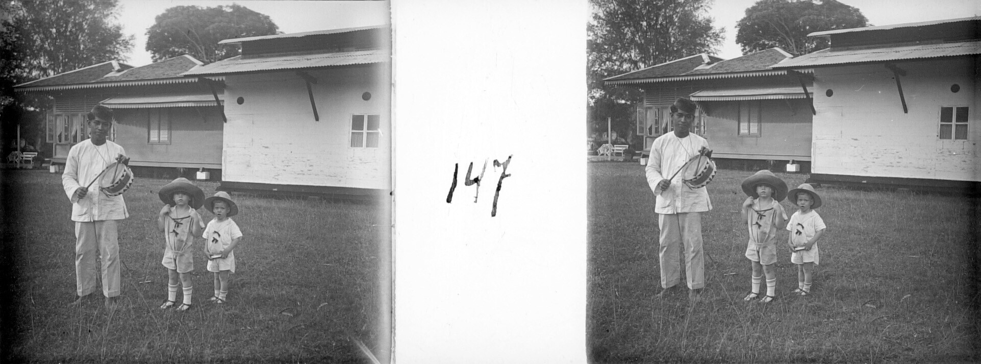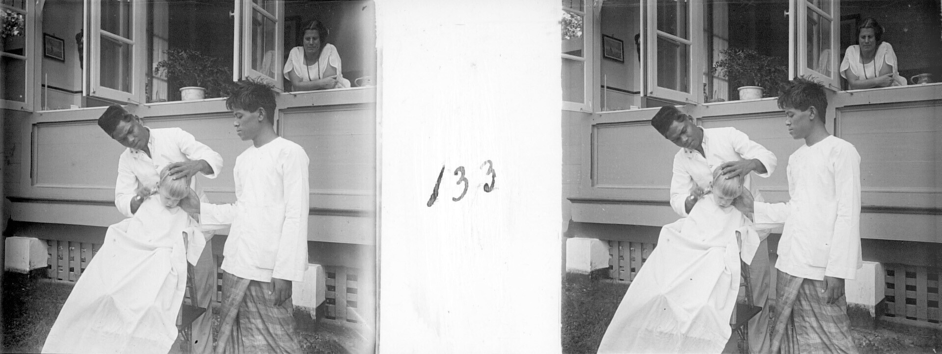 Gretchen Japing met haar zonen Henk en Hans en huisp...