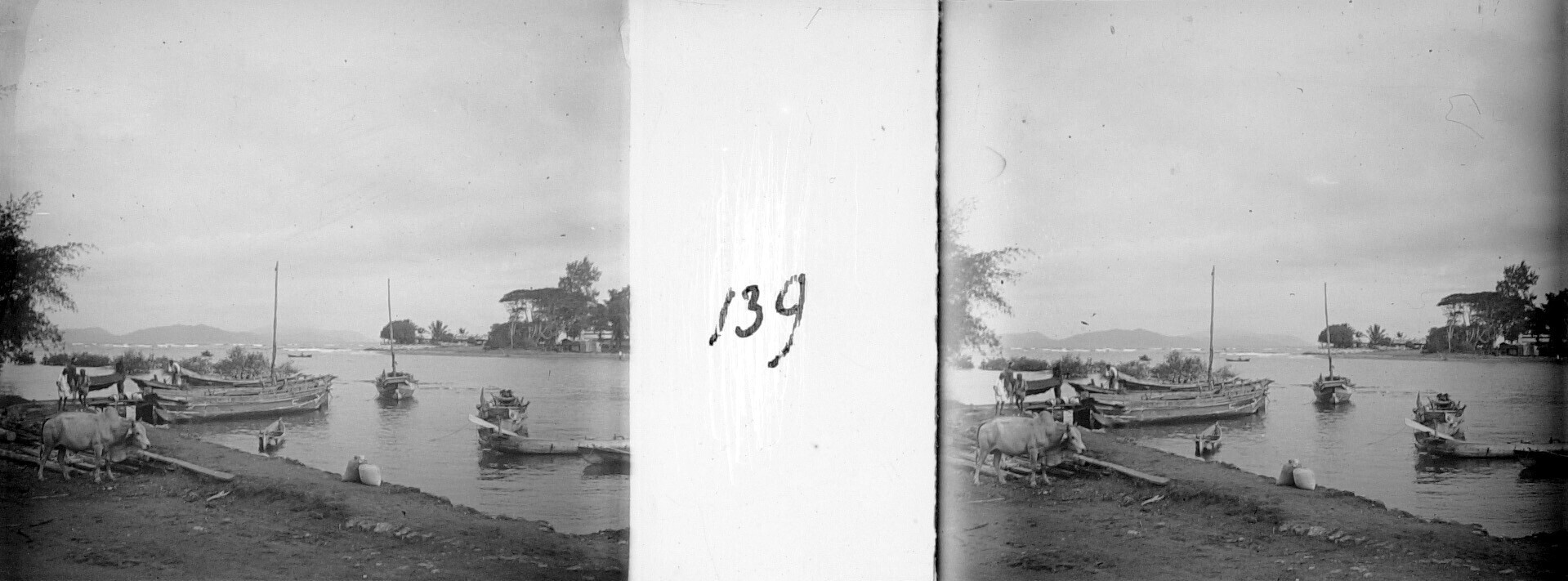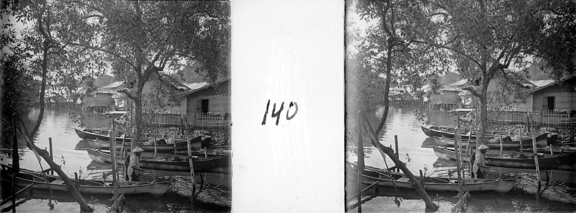 Riviergezicht met paalwoningen en prauwen