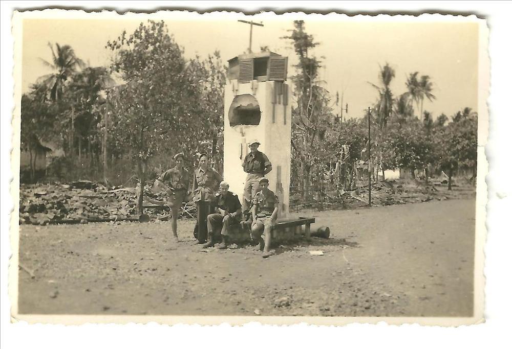 KNIL solaten voor kapot uitkijktorentje (?), Gombong...