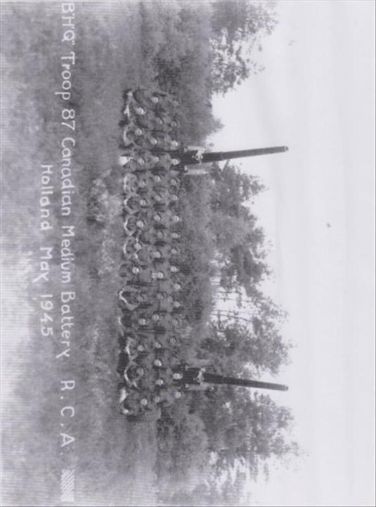 Foto van 45 militairen en een hondje opgesteld voor ...