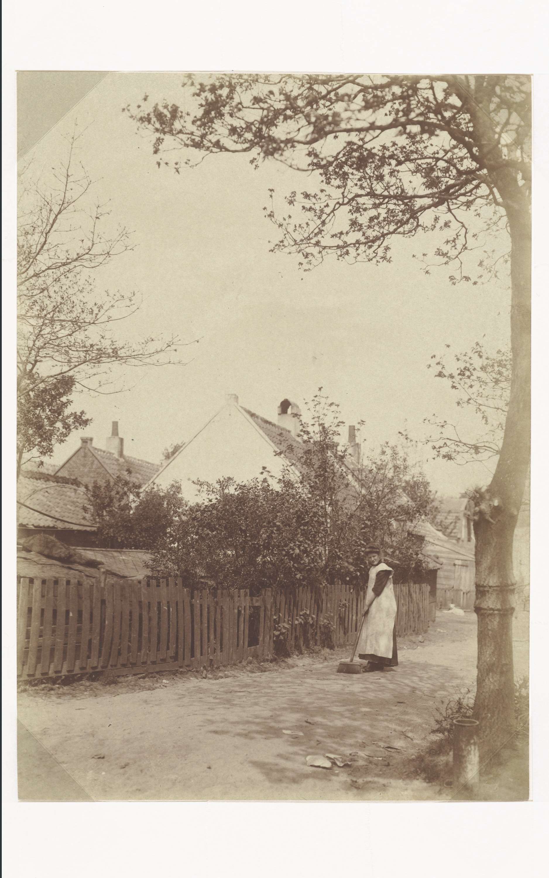 Vrouw in werkschort veegt het erf