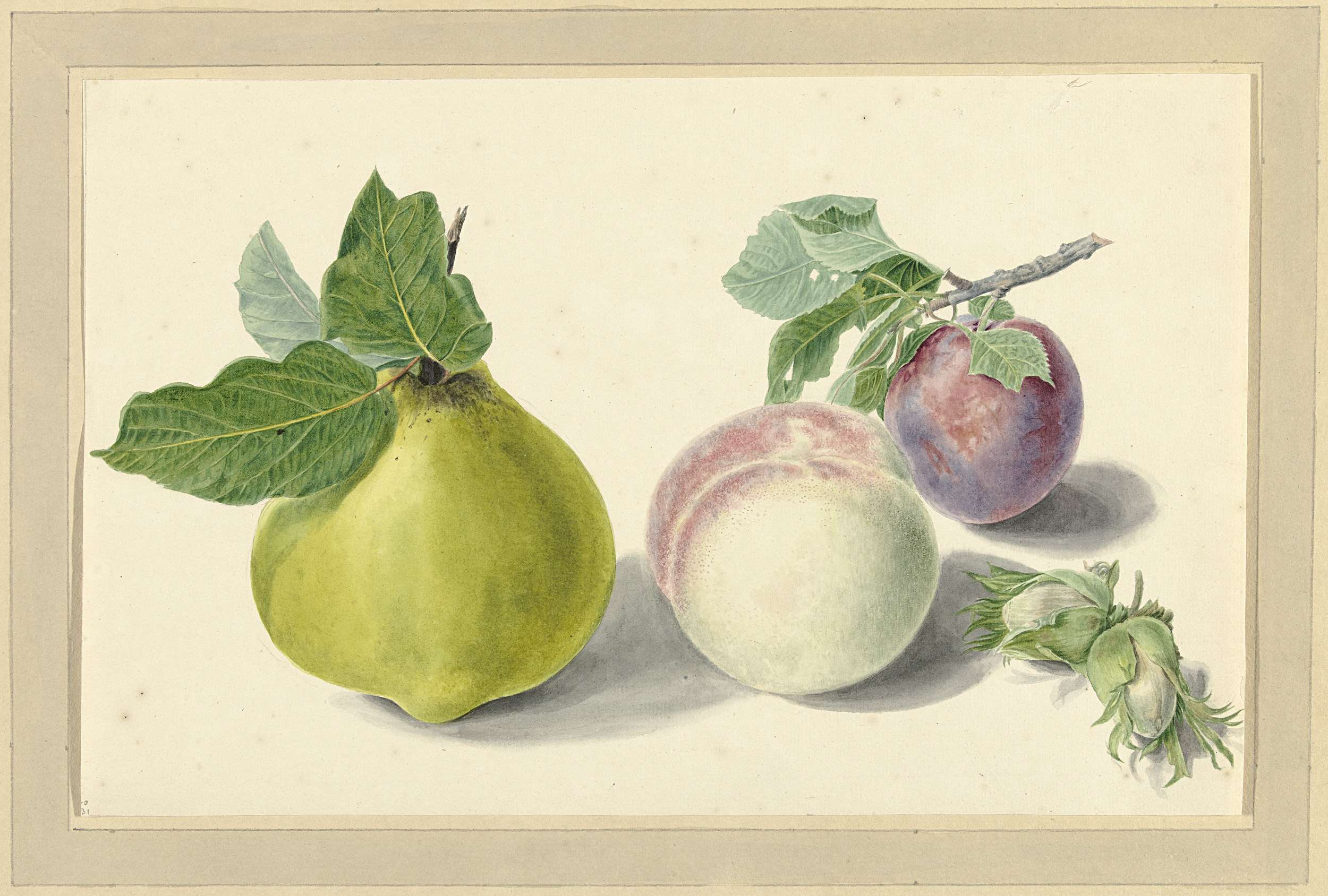 Perzik, een pruim met blad en een paar noten