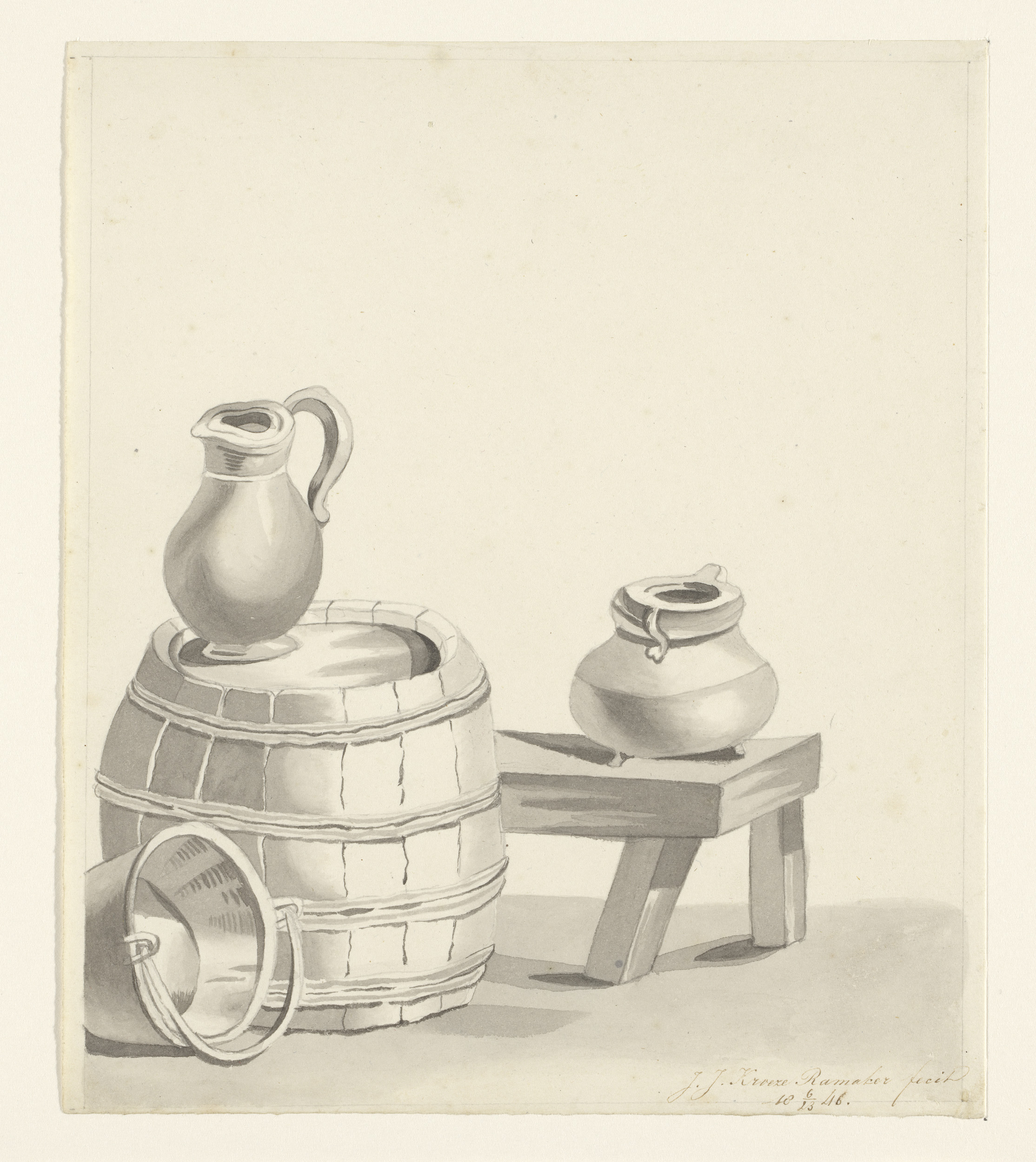 Stilleven met ton en kruiken