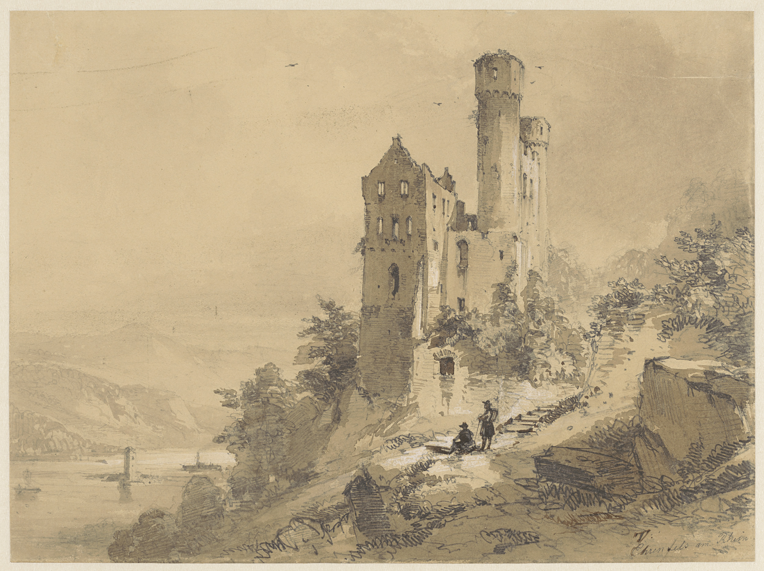Wandelaars bij de ruïne Ehrenfels aan de Rijn