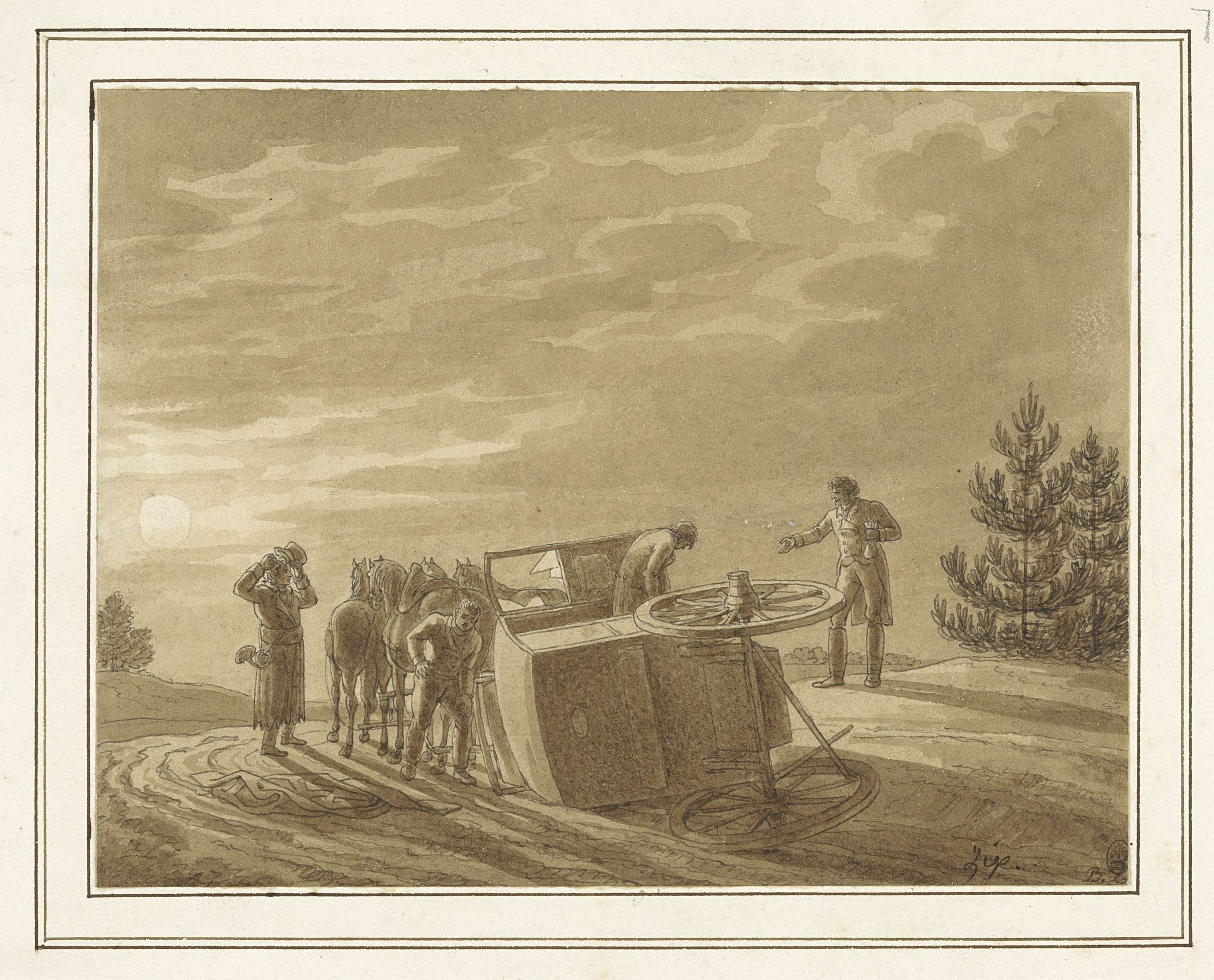 Reizigers bij omgevallen koets in landschap bij maan...