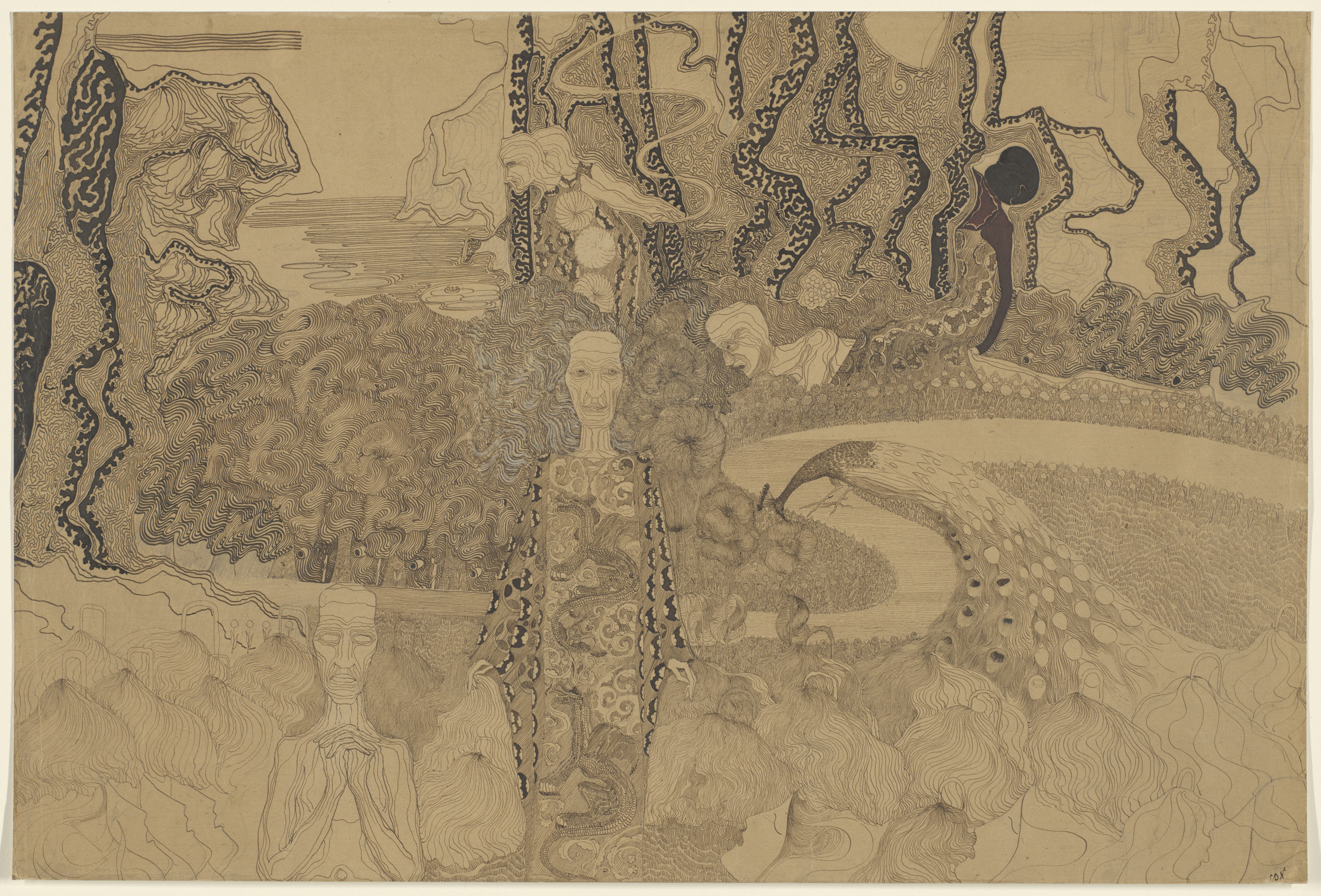 Allegorische voorstelling met figuren en een pauw in...