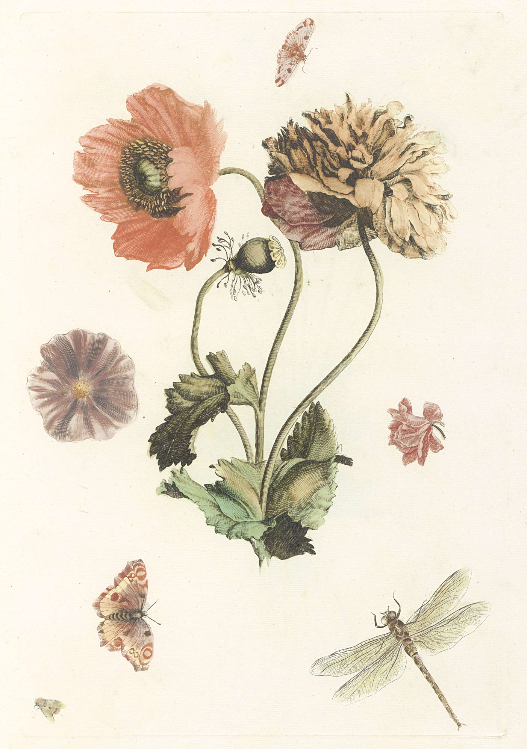 Drie papavers, twee vlinders, een vlieg en een libelle