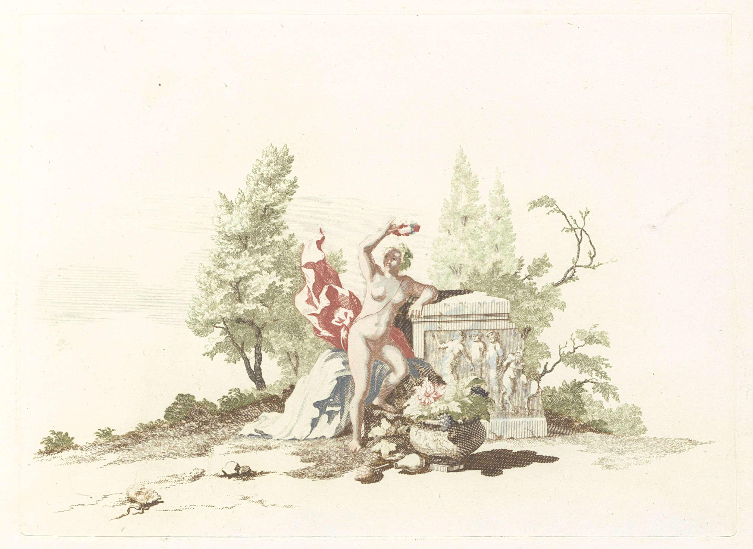 Naakte vrouw met een lauwerkrans bij een monument