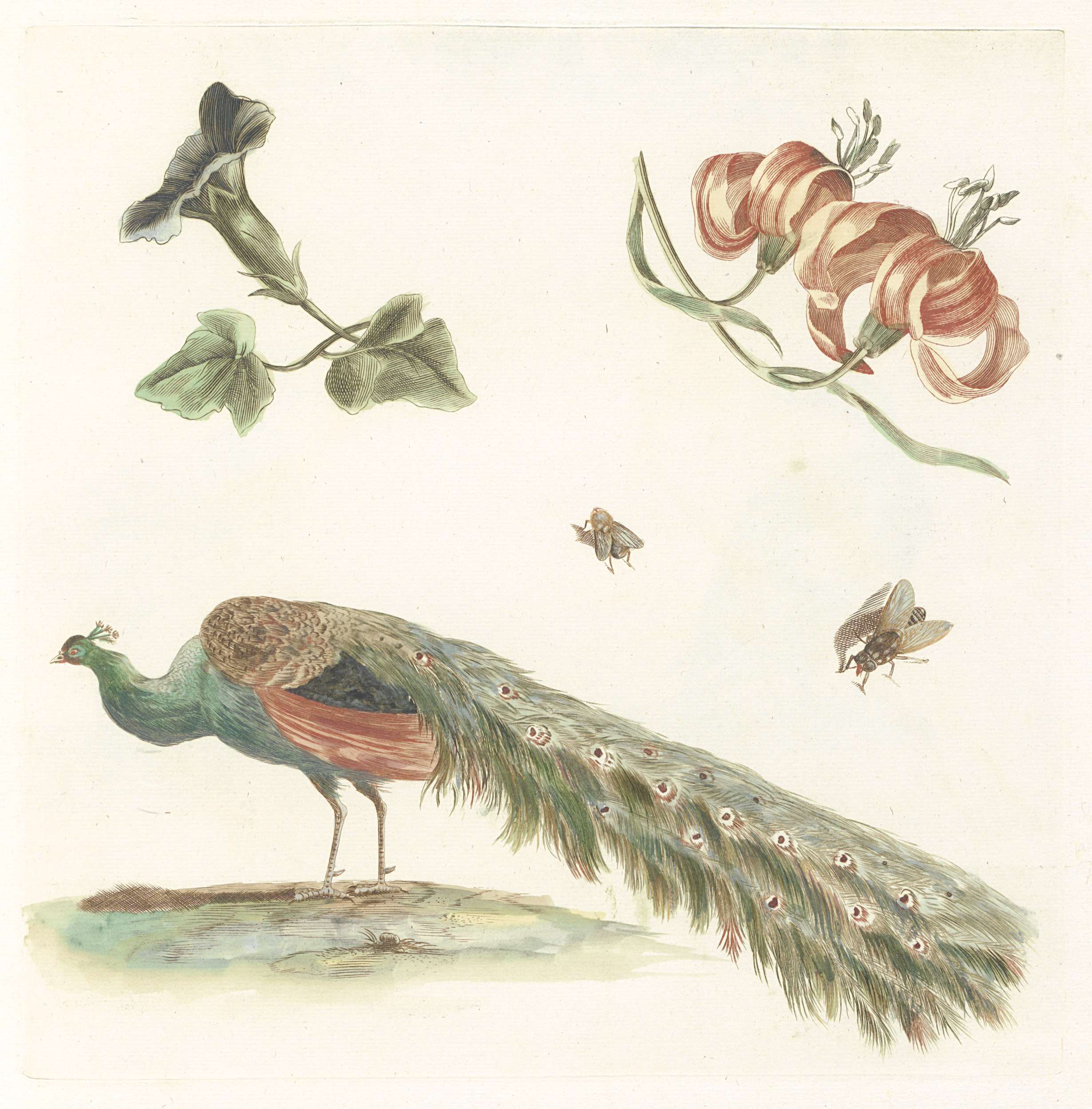 Winde, lelies, twee vliegen en een pauw