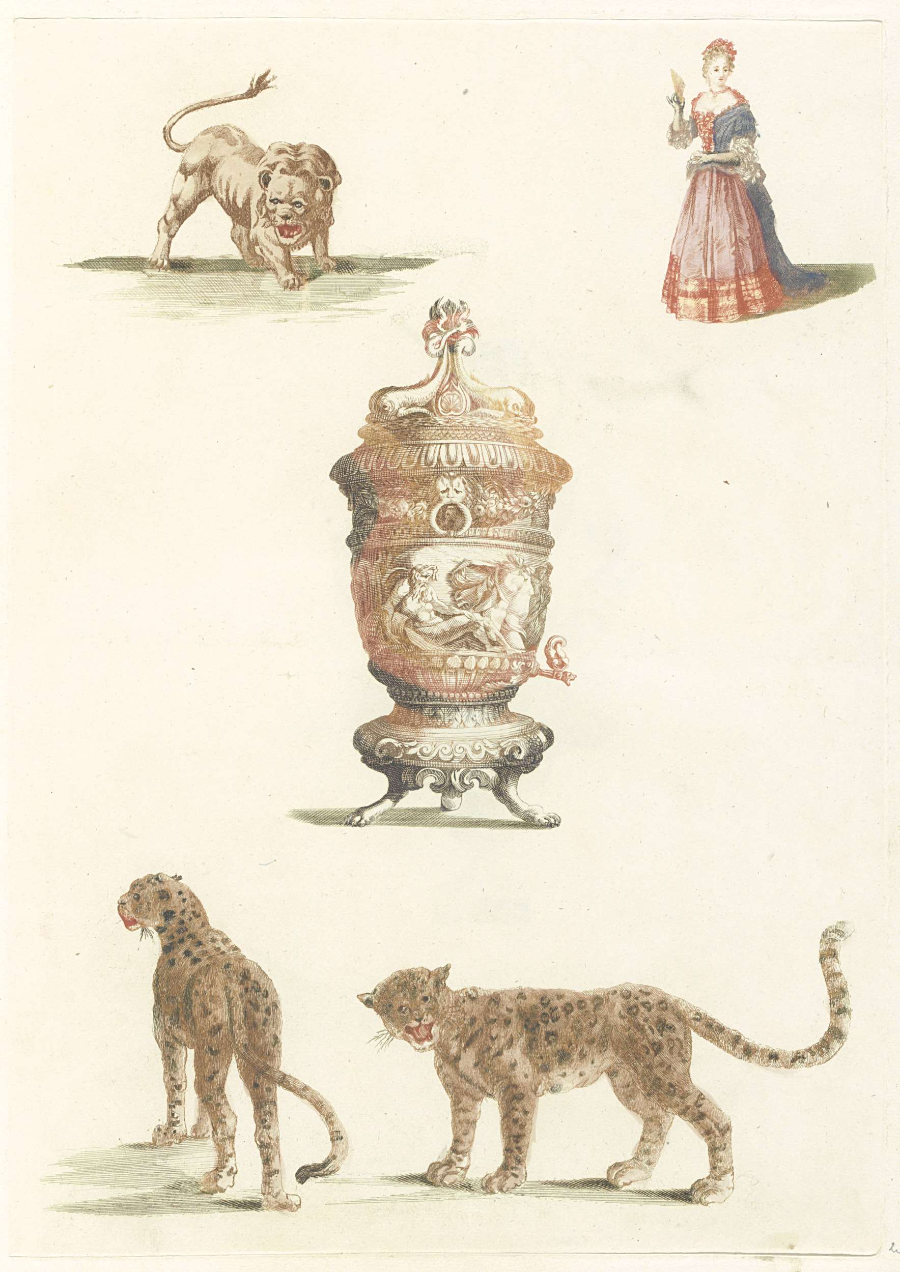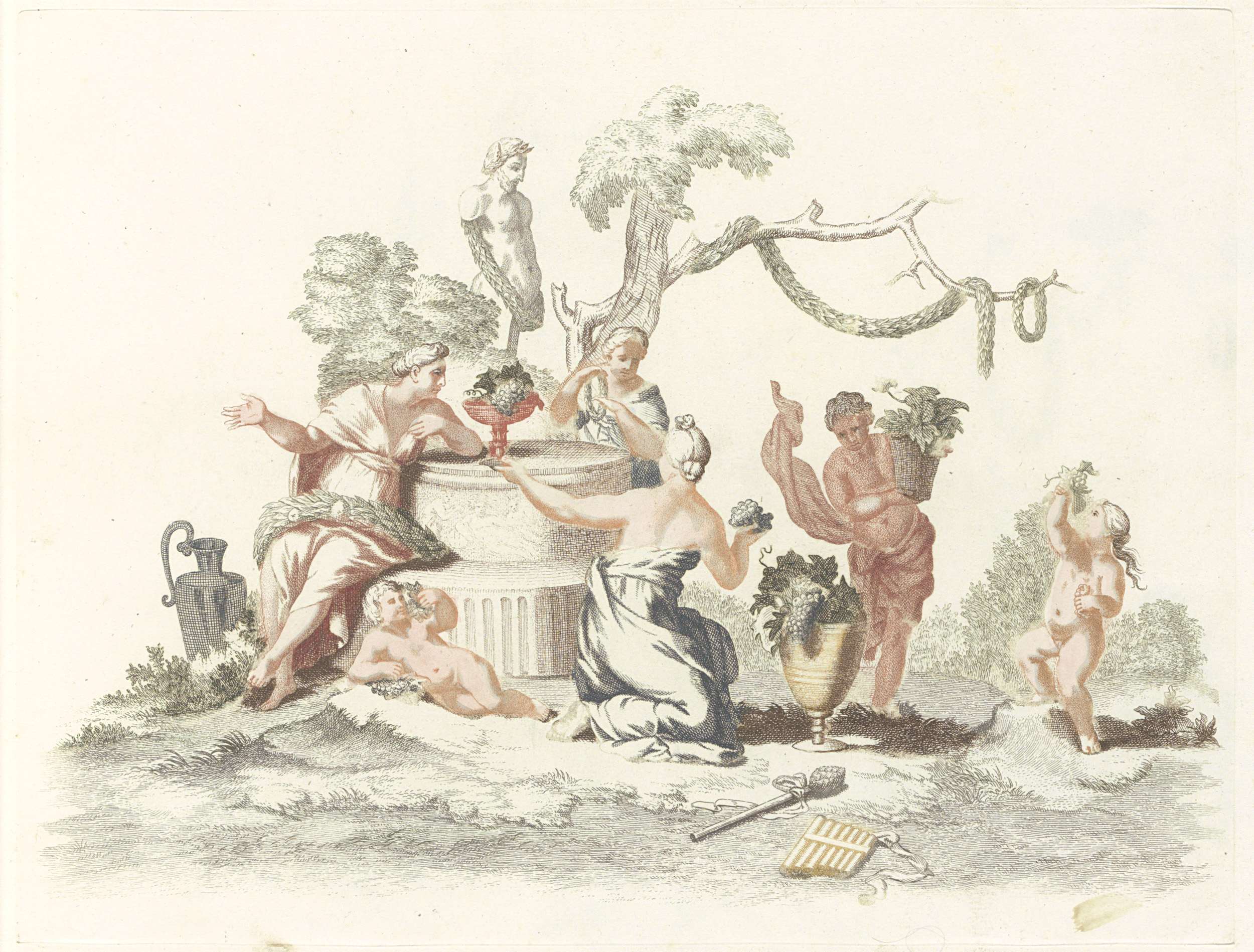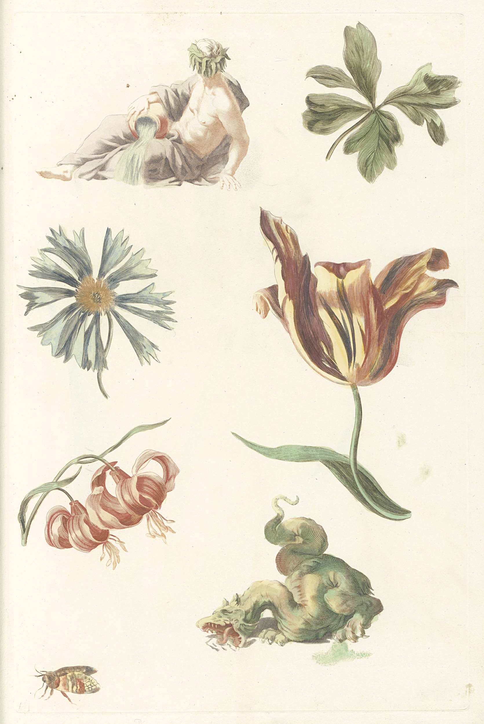 Riviergod, een draak en vier bloemen