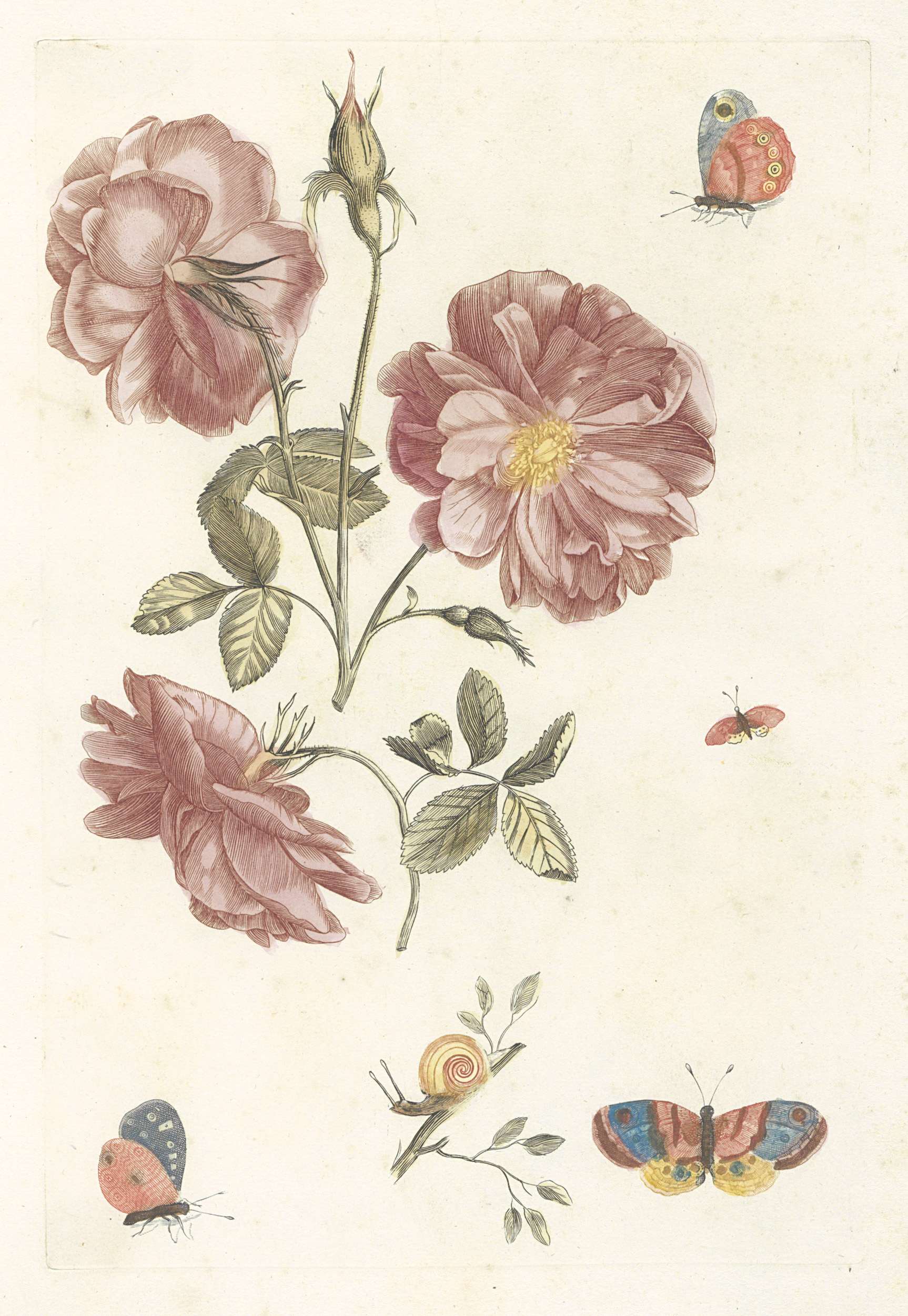 Twee takken met rozen, vier vlinders en een slak