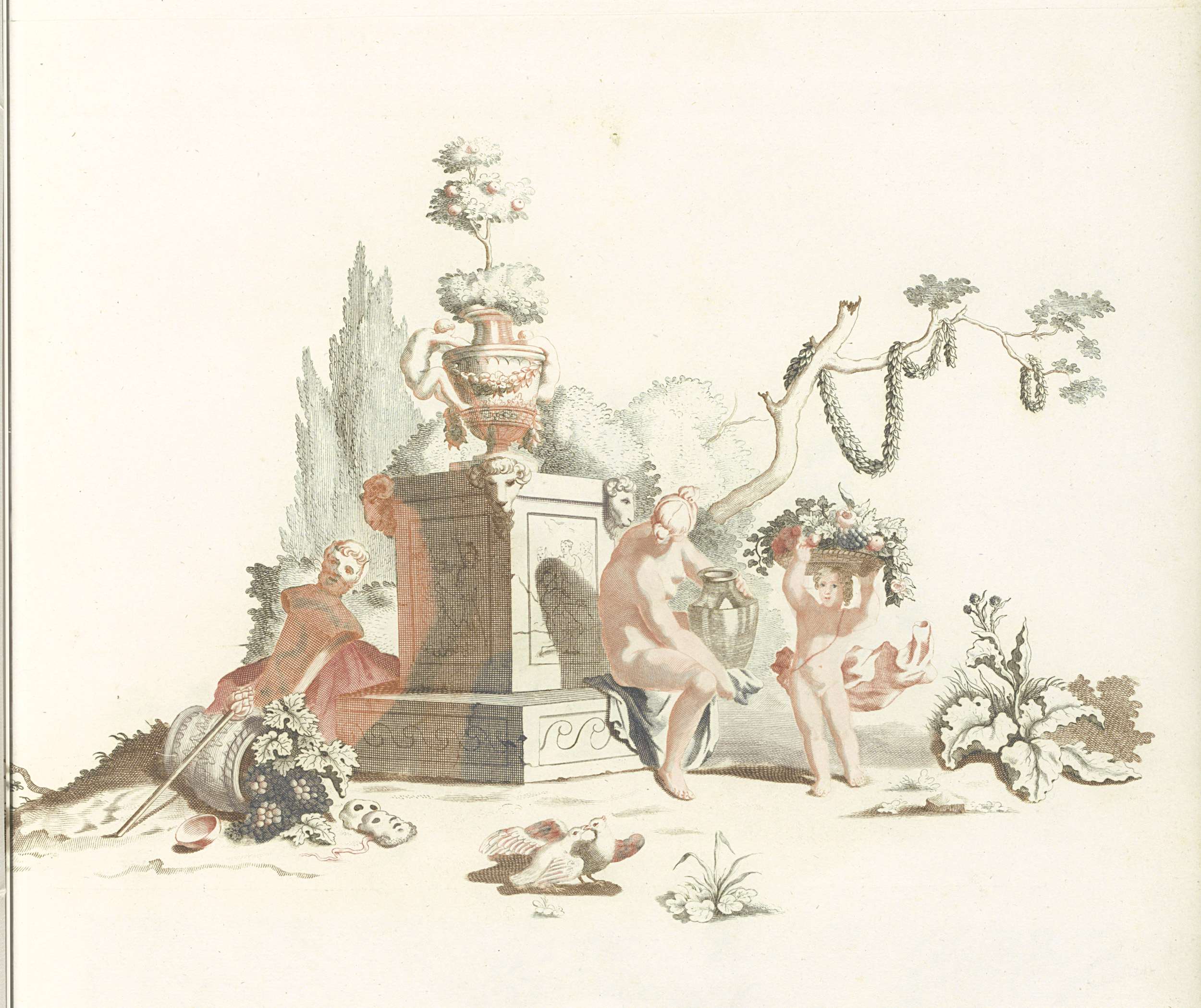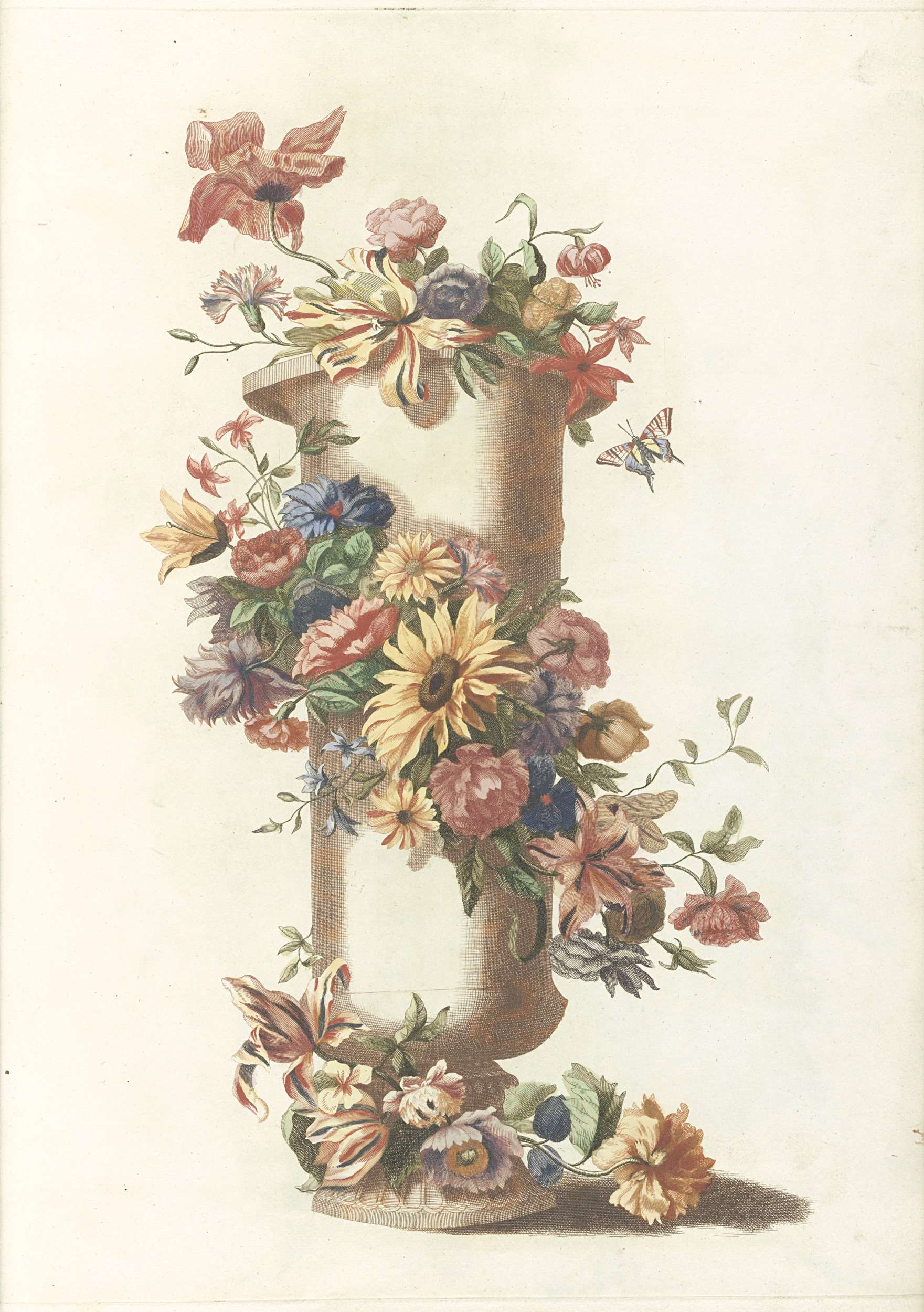 Vaas omgeven door bloemenguirlande
