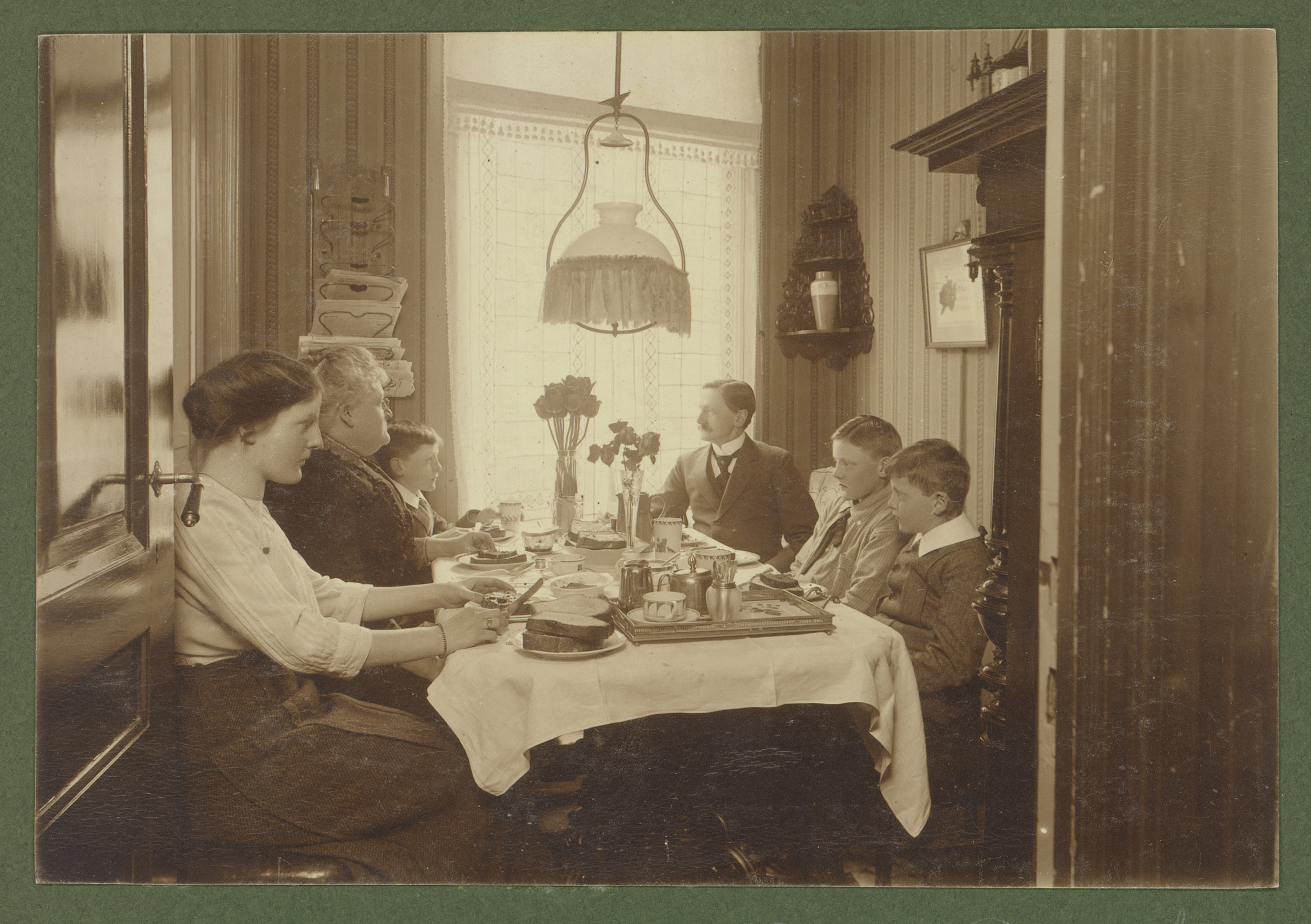 Groepsportret van zes leden van de familie Vermeulen