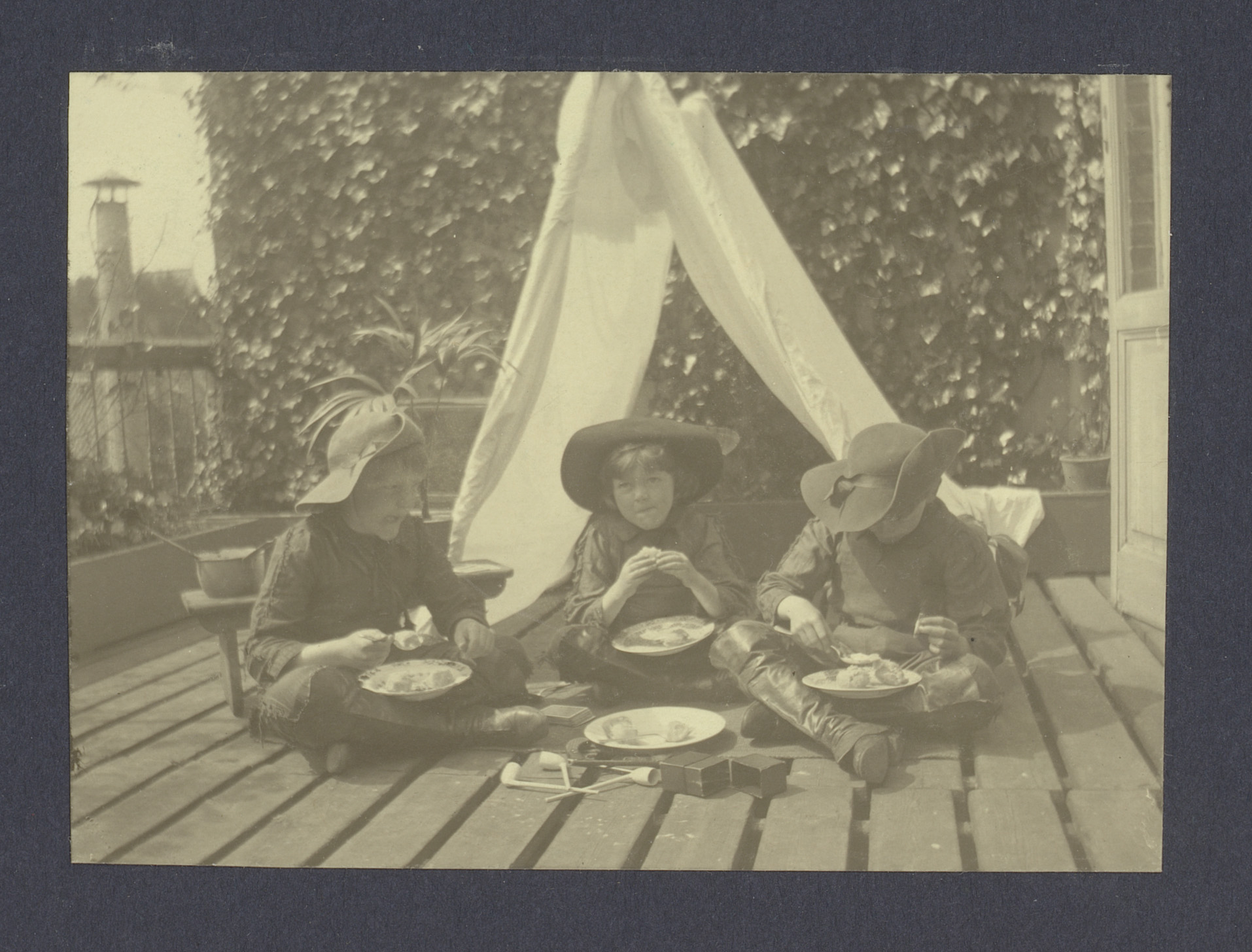 Drie jongens in verkleedkleren eten een boterham in ...