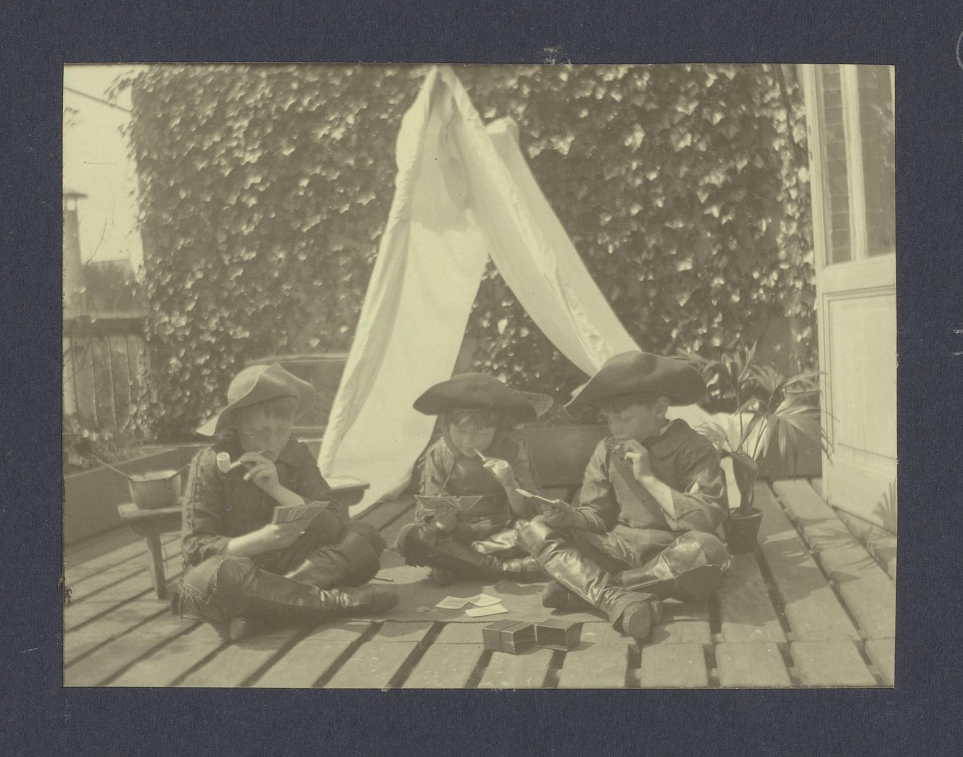 Drie jongens in verkleedkleren spelen met speelkaart...