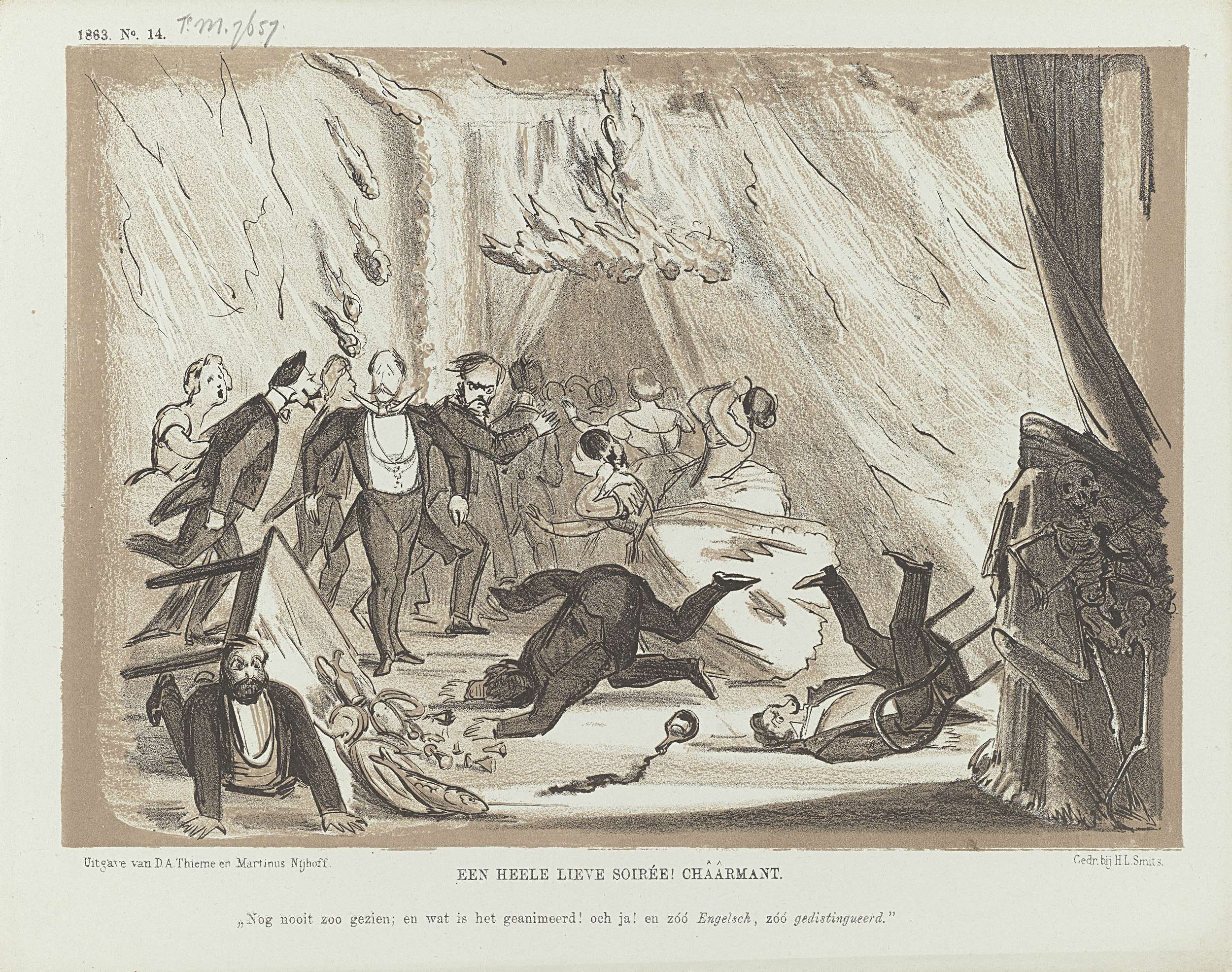 Spotprent op de brand op een bal in Den Haag, 1863