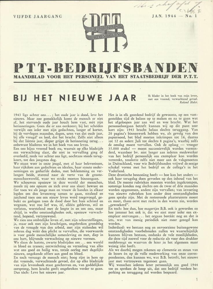 PTT Bedrijfsbanden, vijfde jaargang no 1, januari 1944