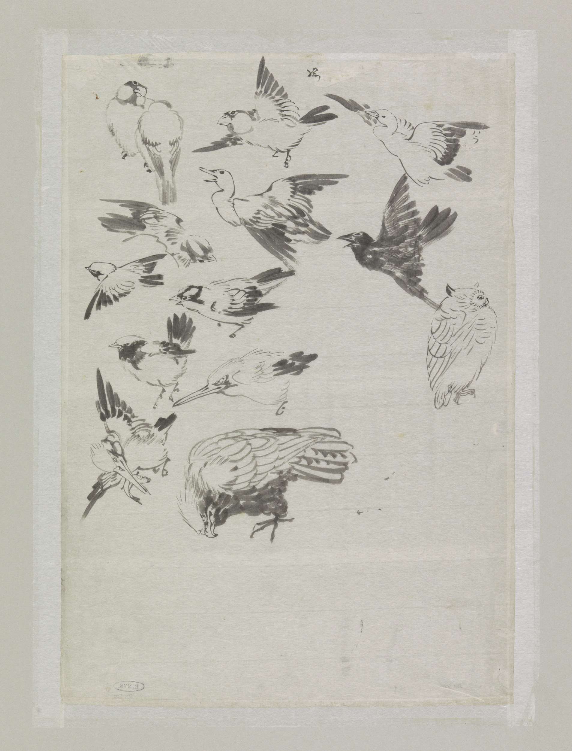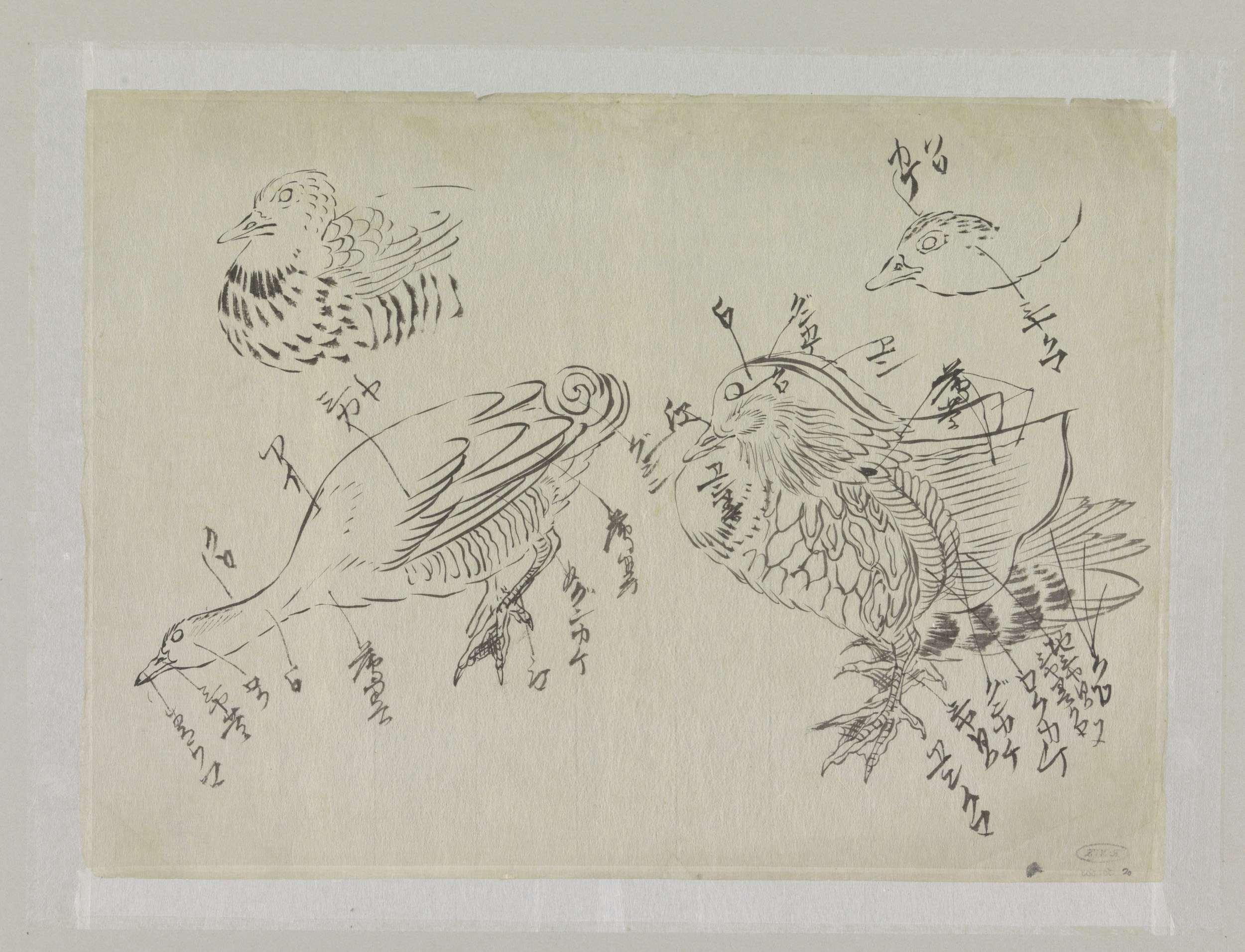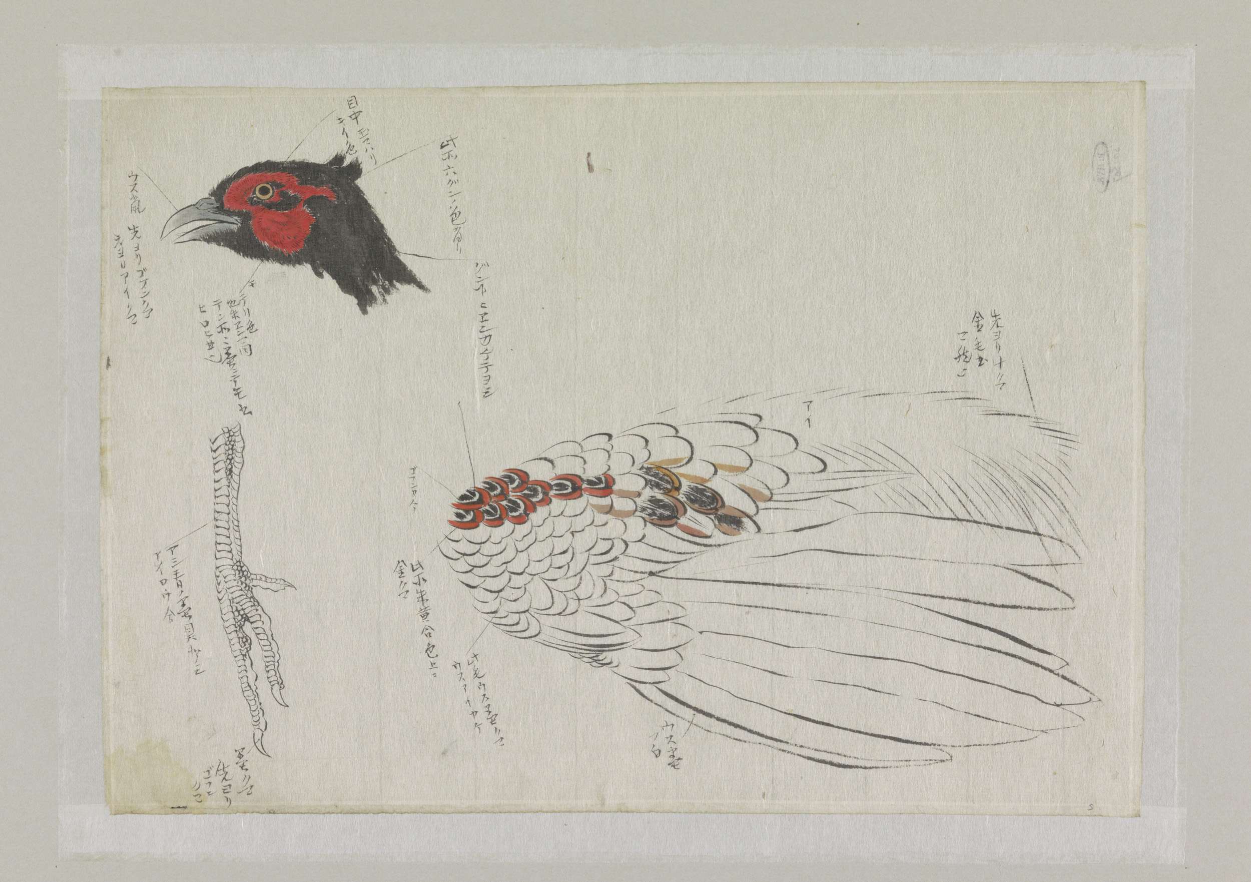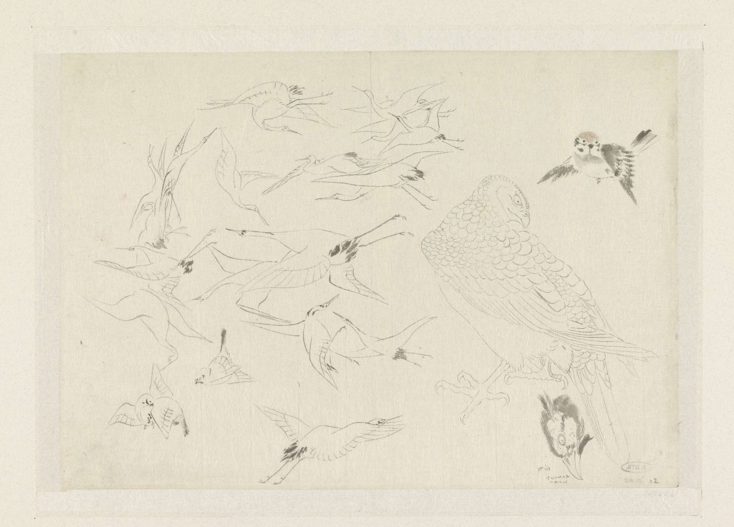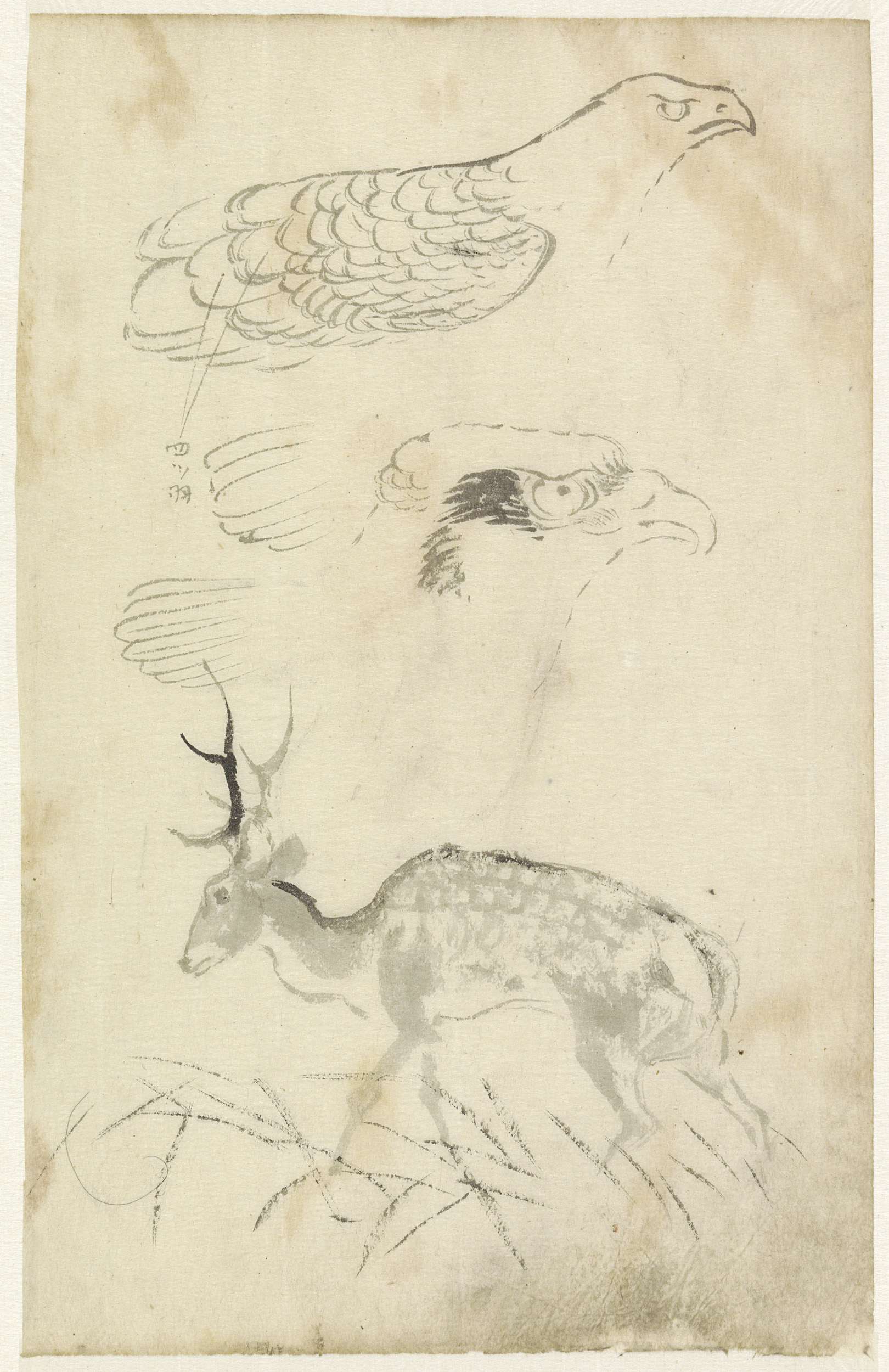 Schetsblad met reebok in struikgewas en twee haviksk...