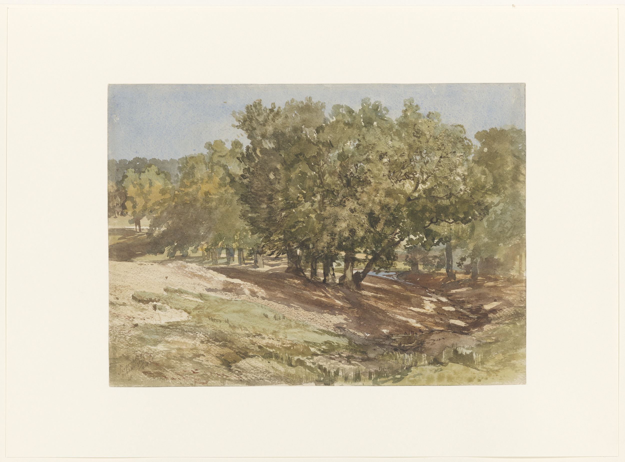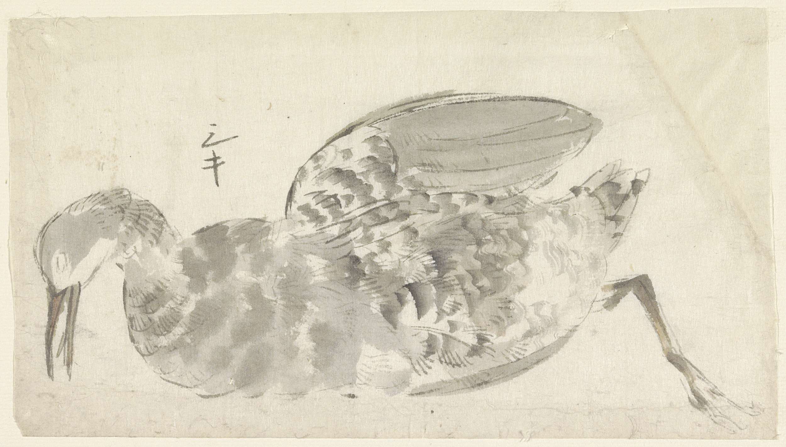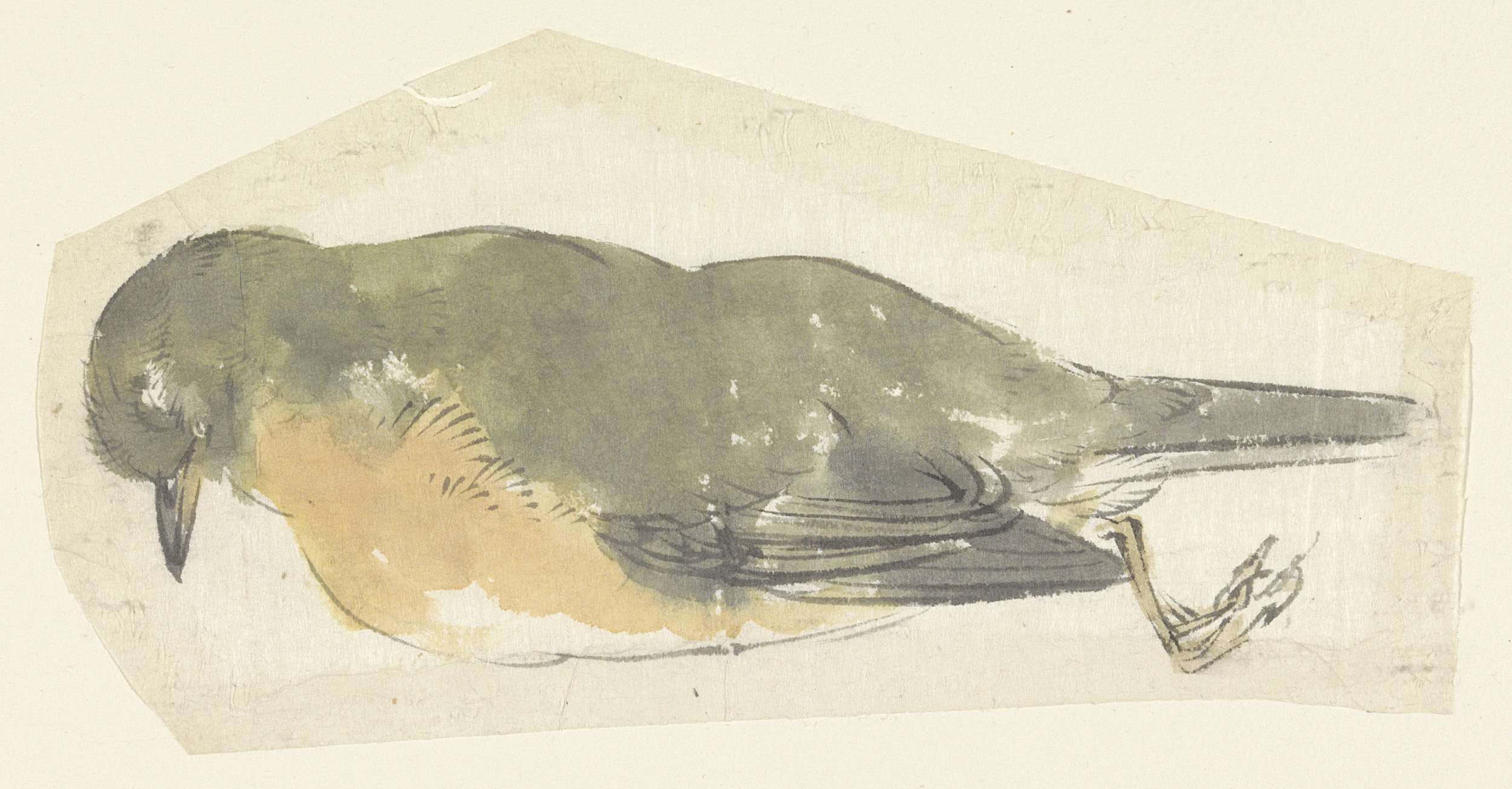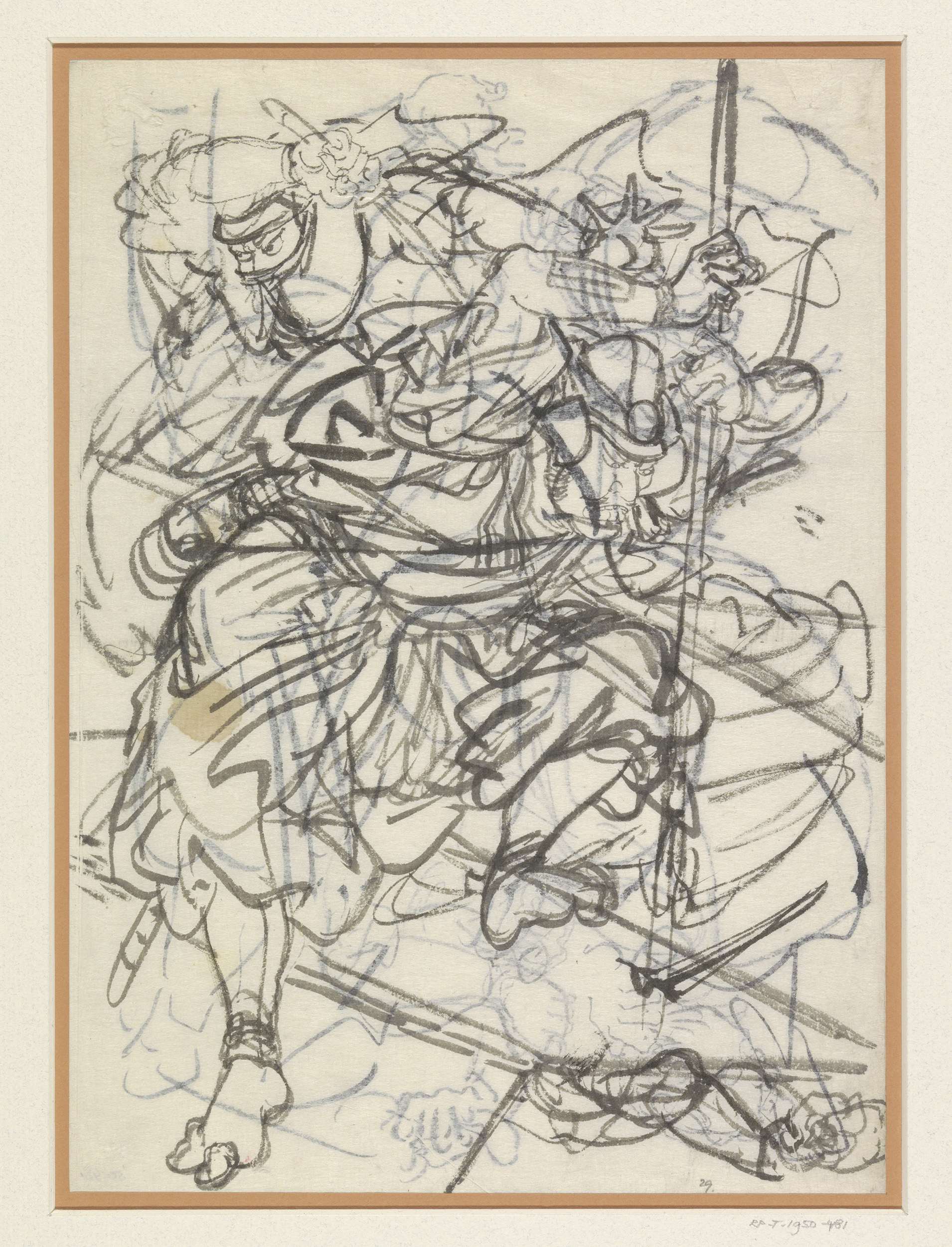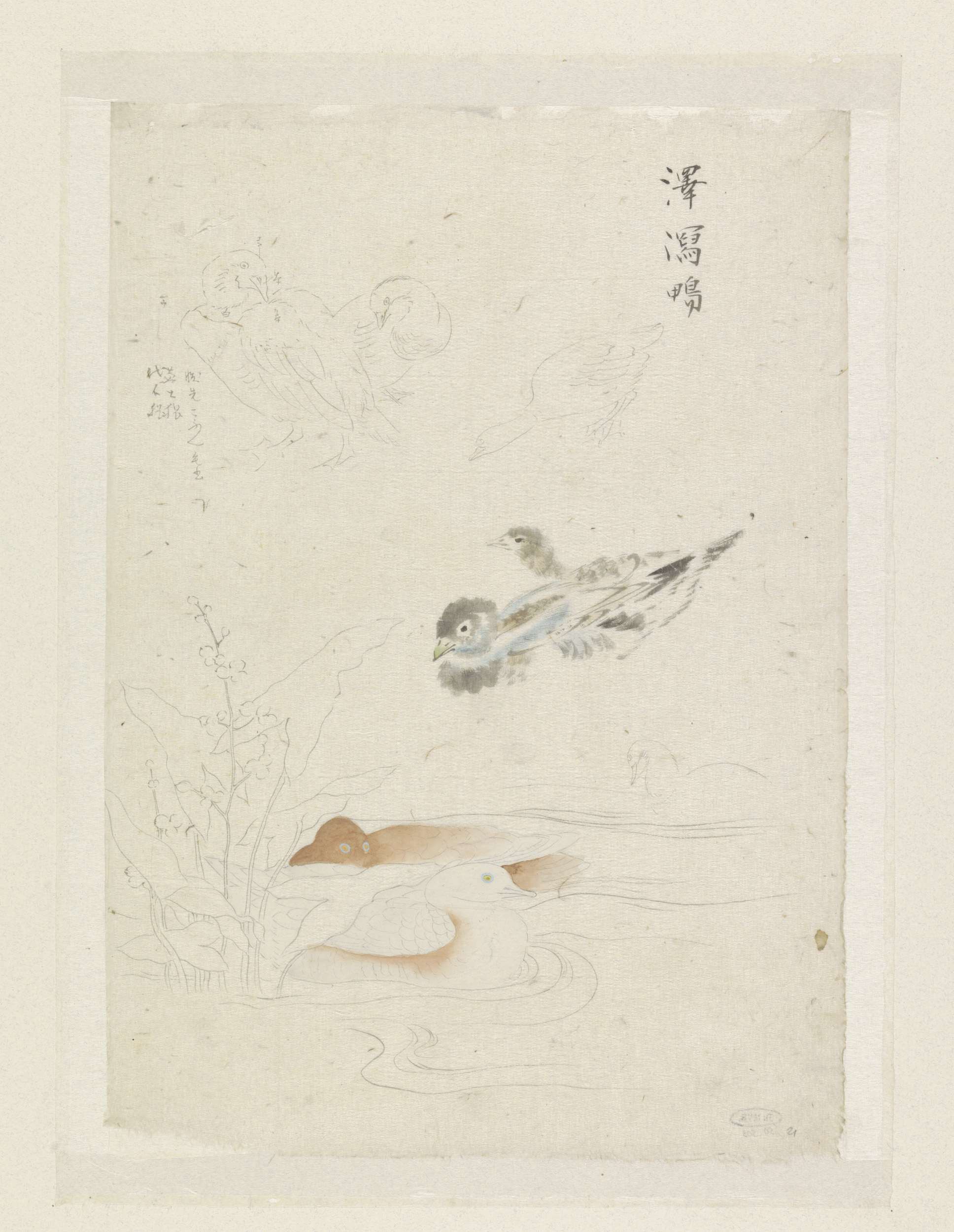 Schetsblad met reebok in struikgewas en twee haviksk...