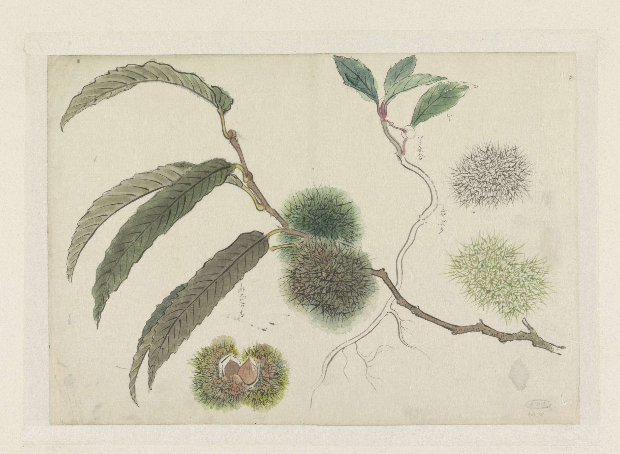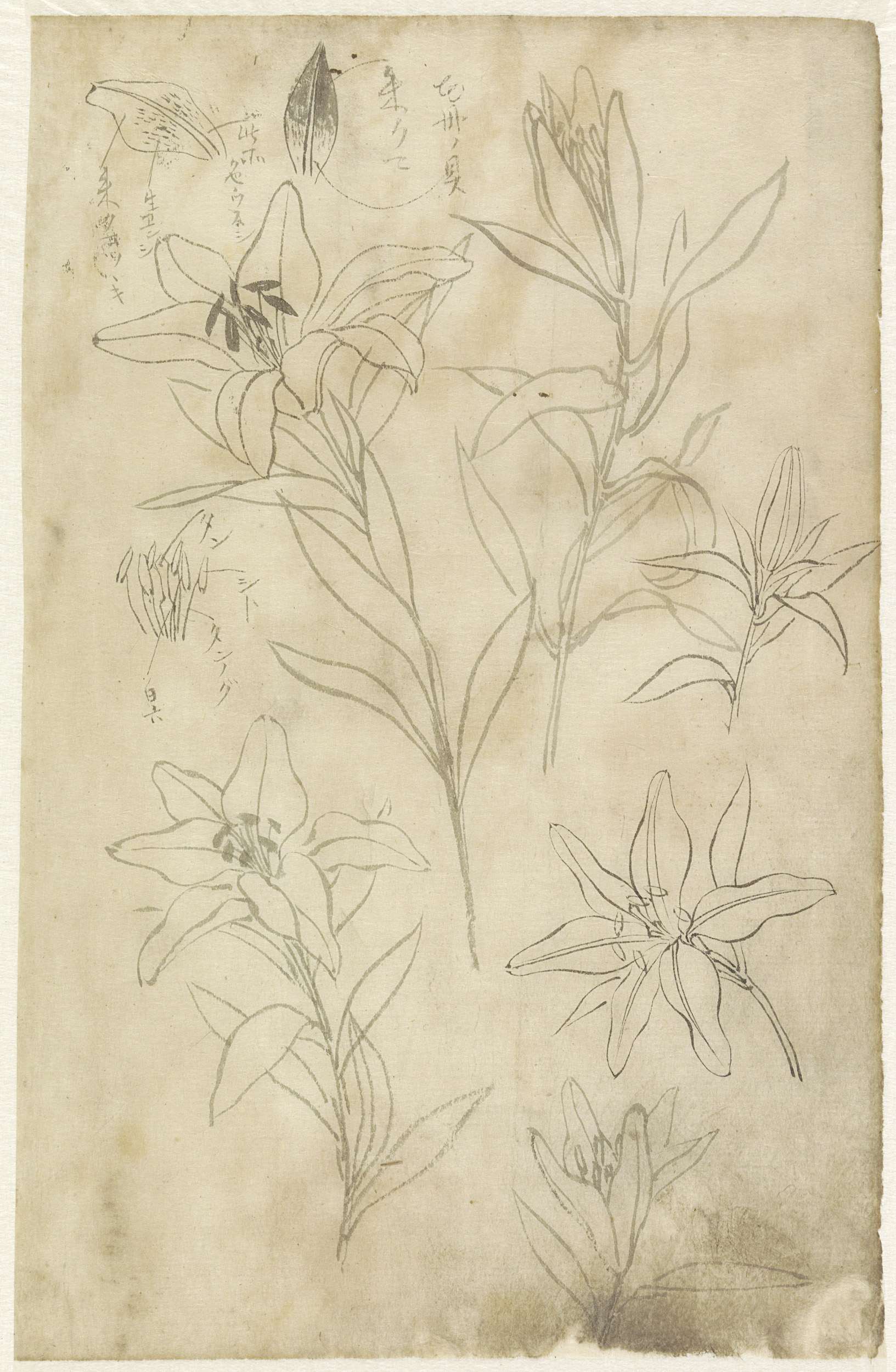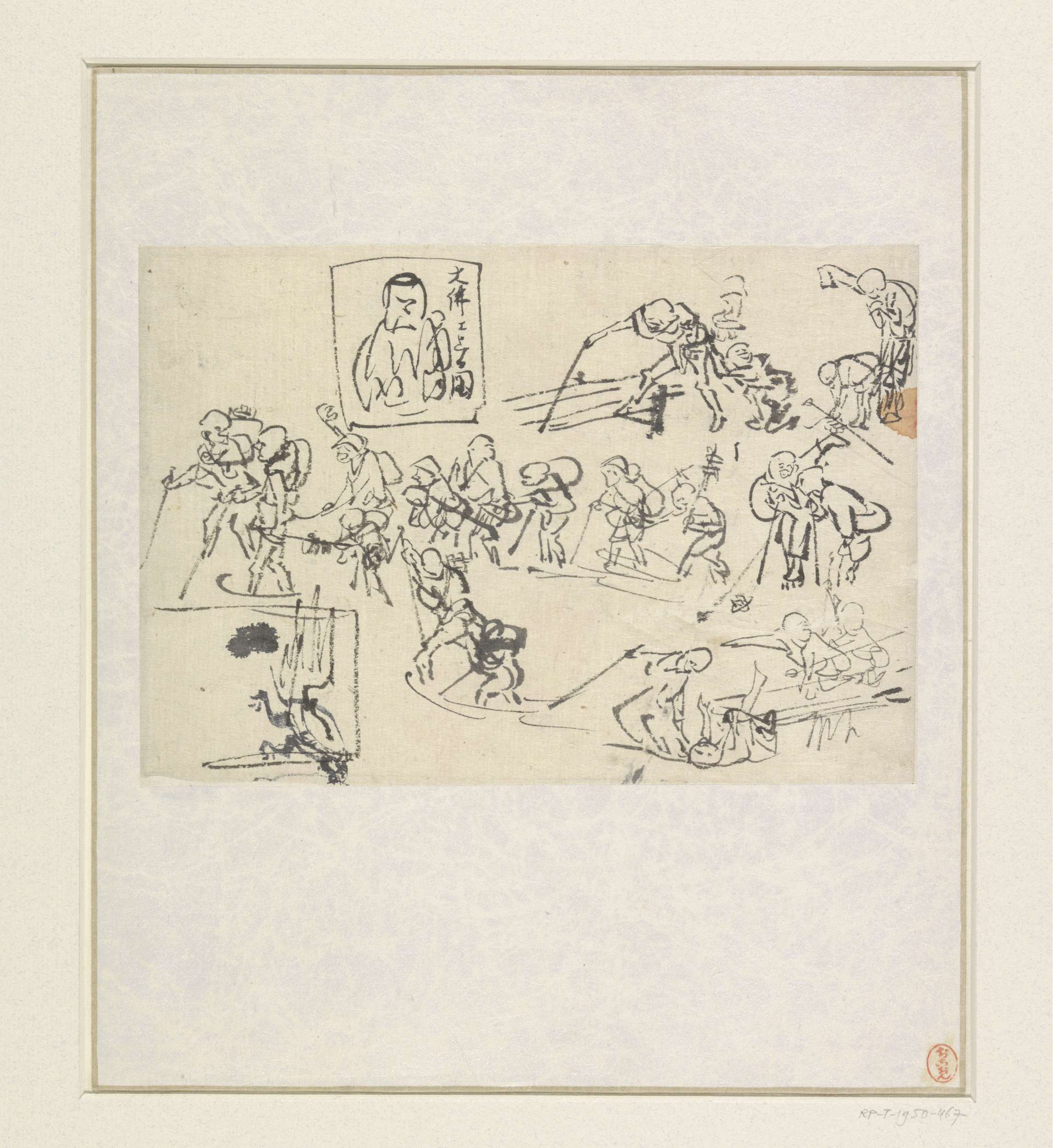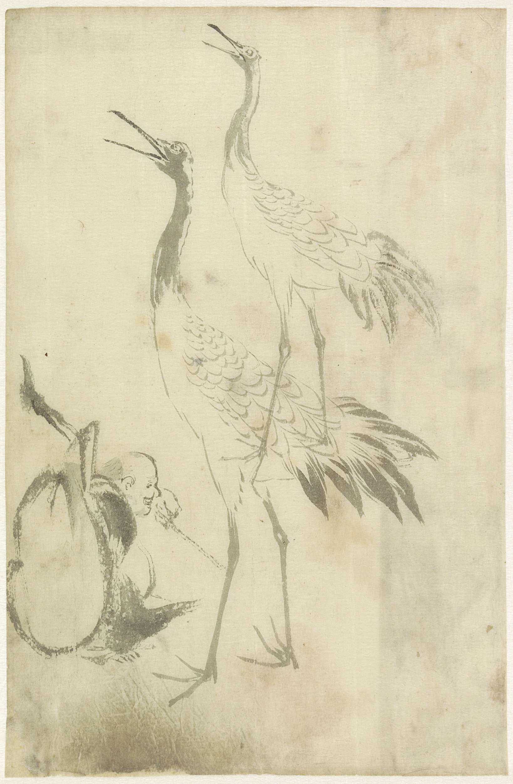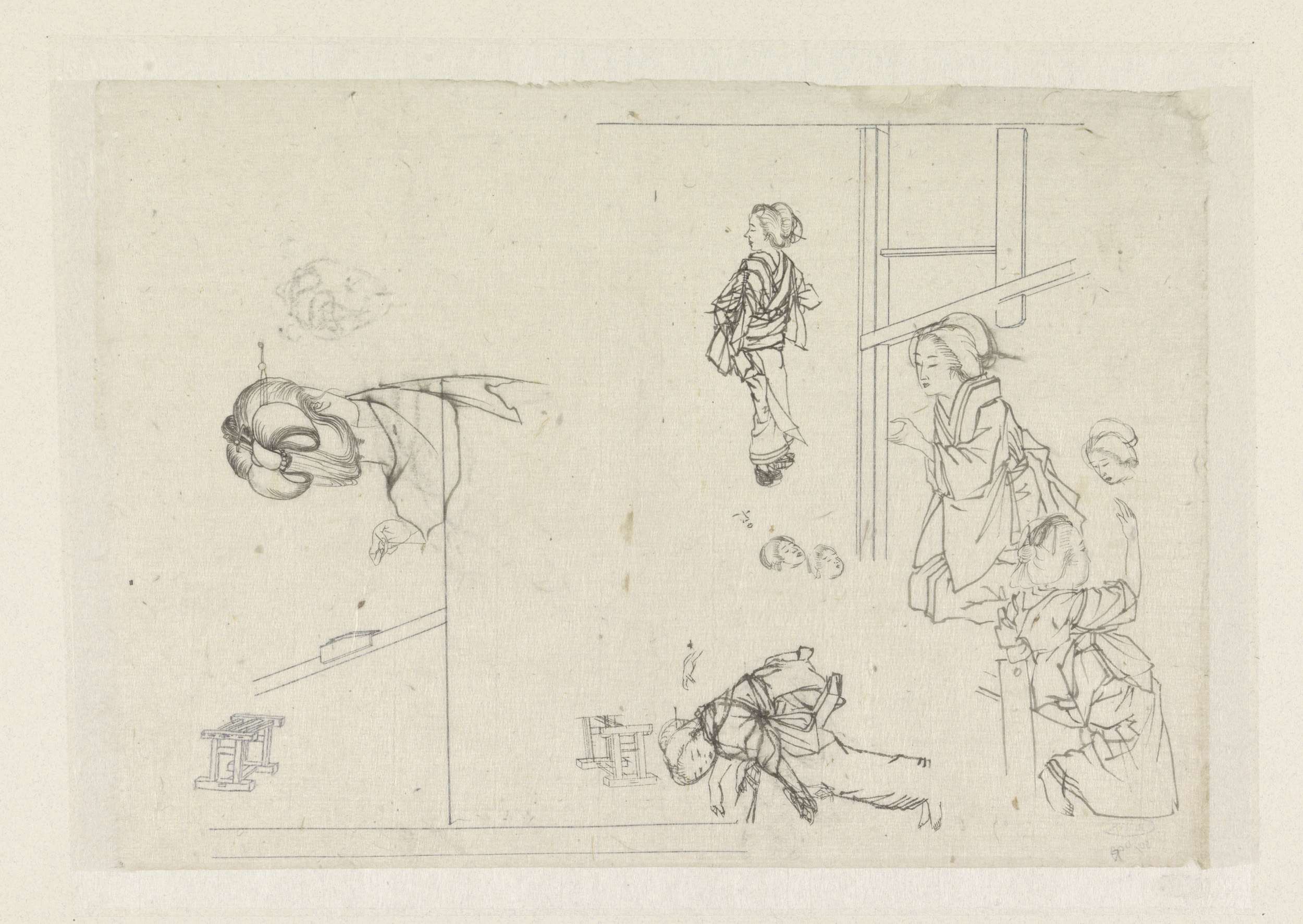 Schetsblad met reebok in struikgewas en twee haviksk...