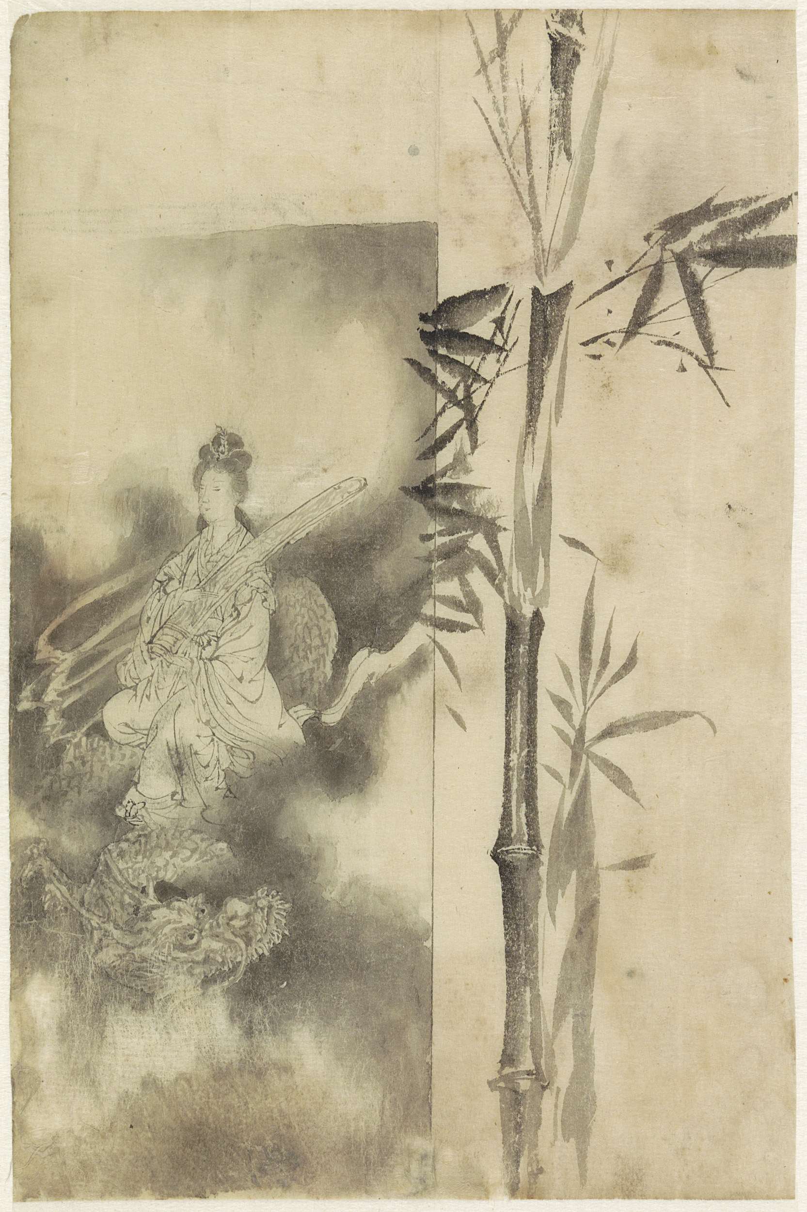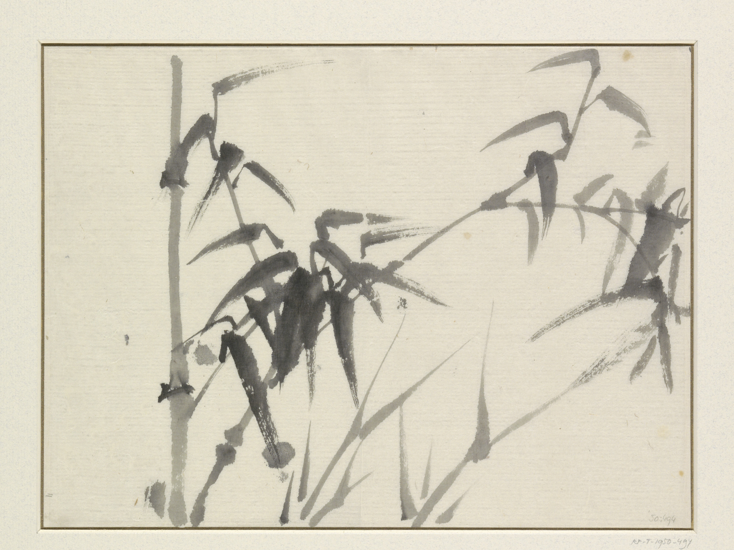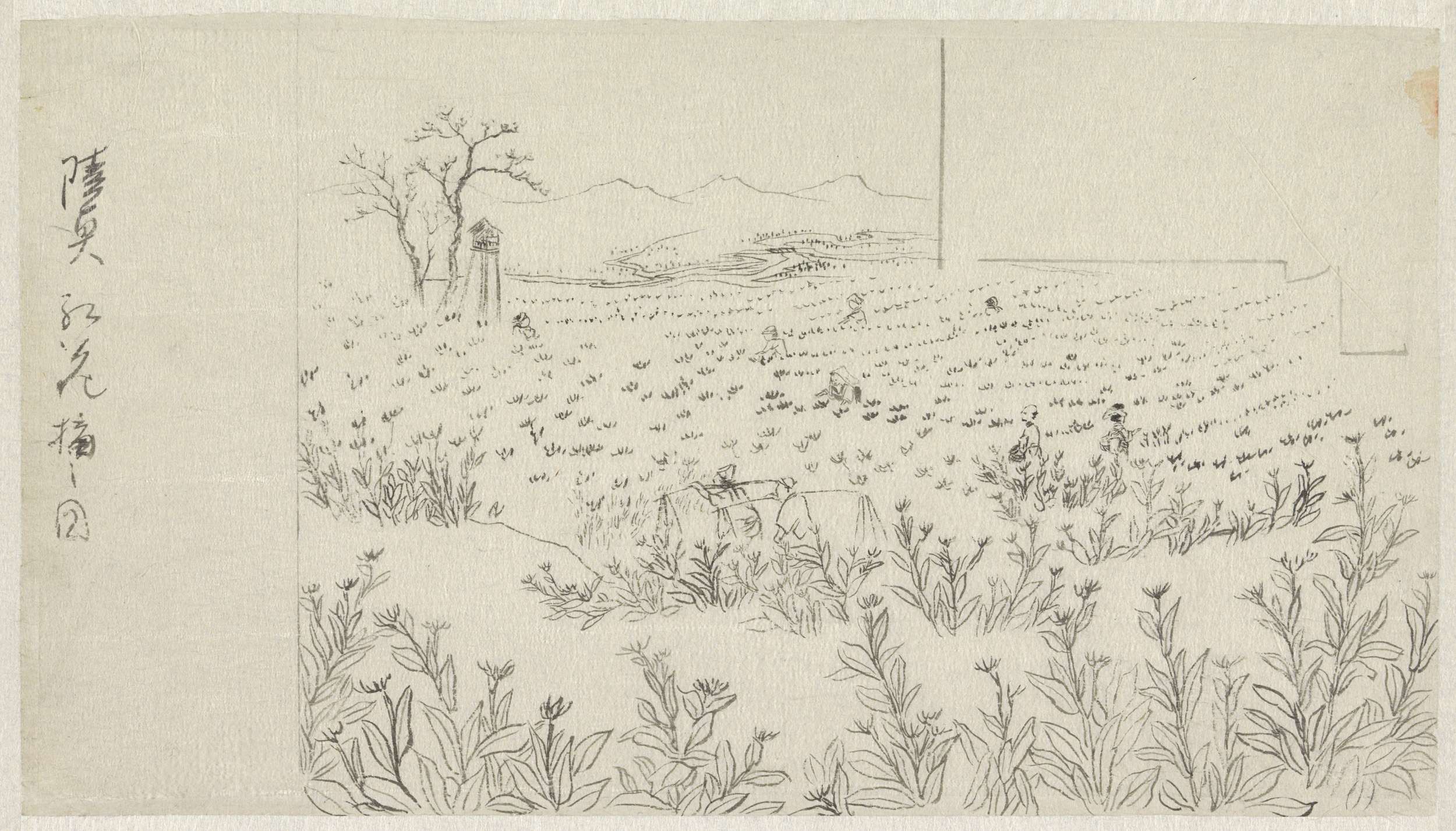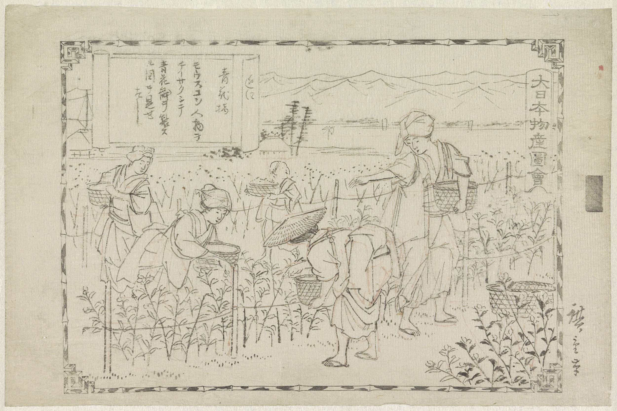 Theeplukkers op het land in een imitatiebamboe omlij...