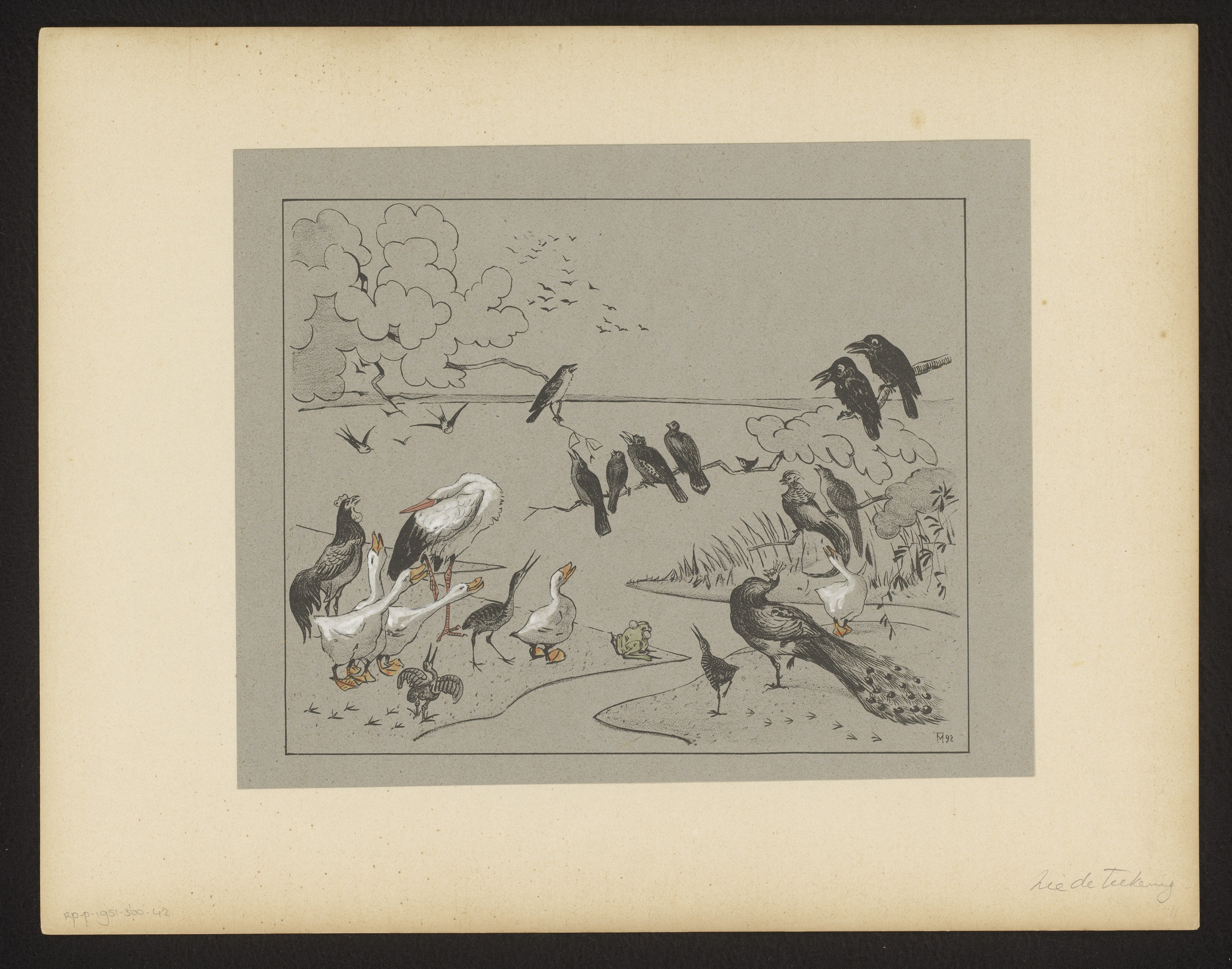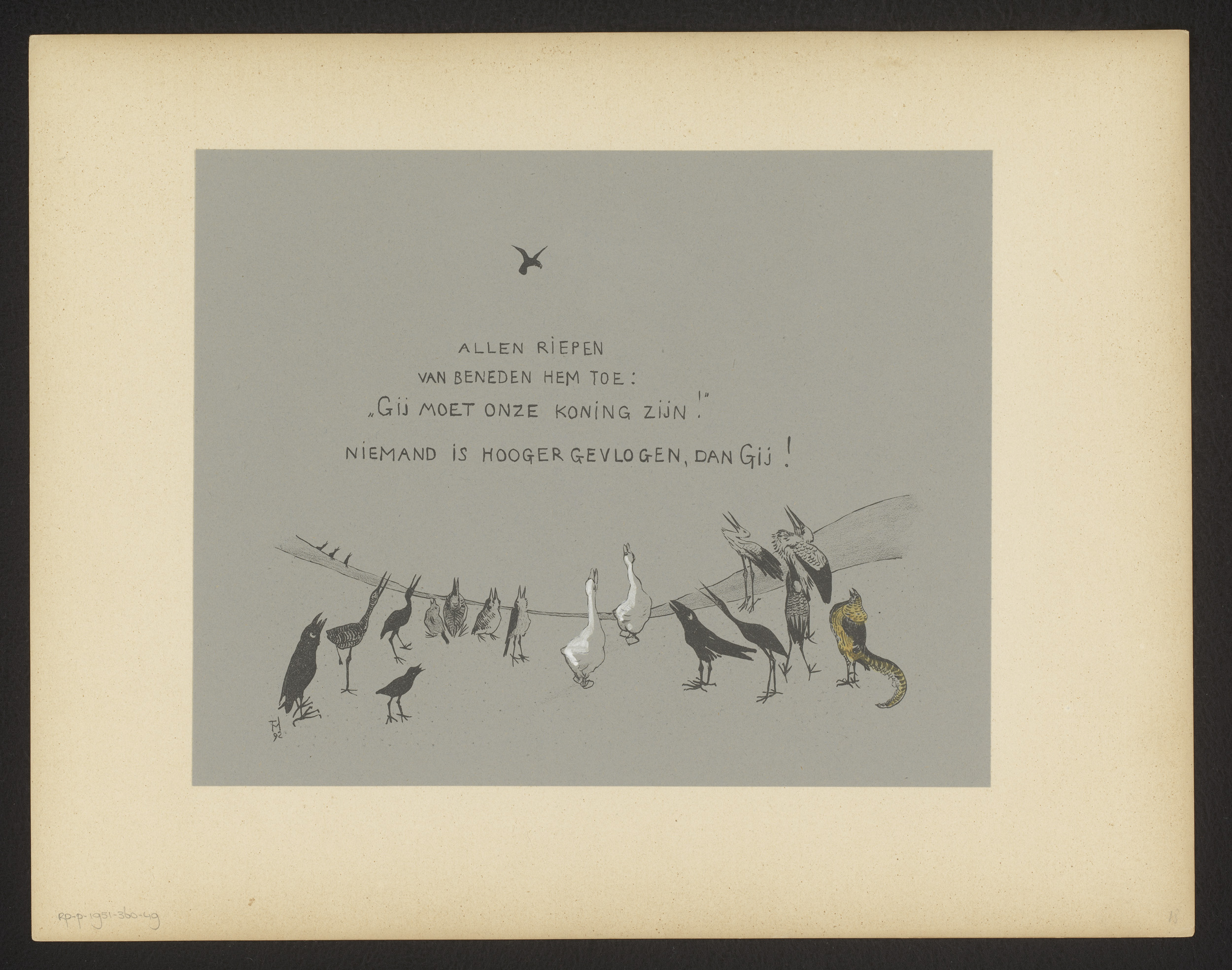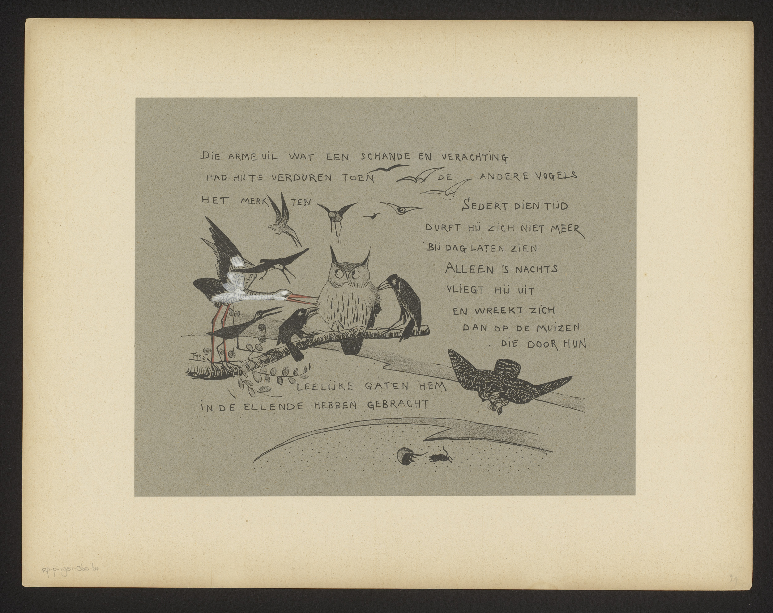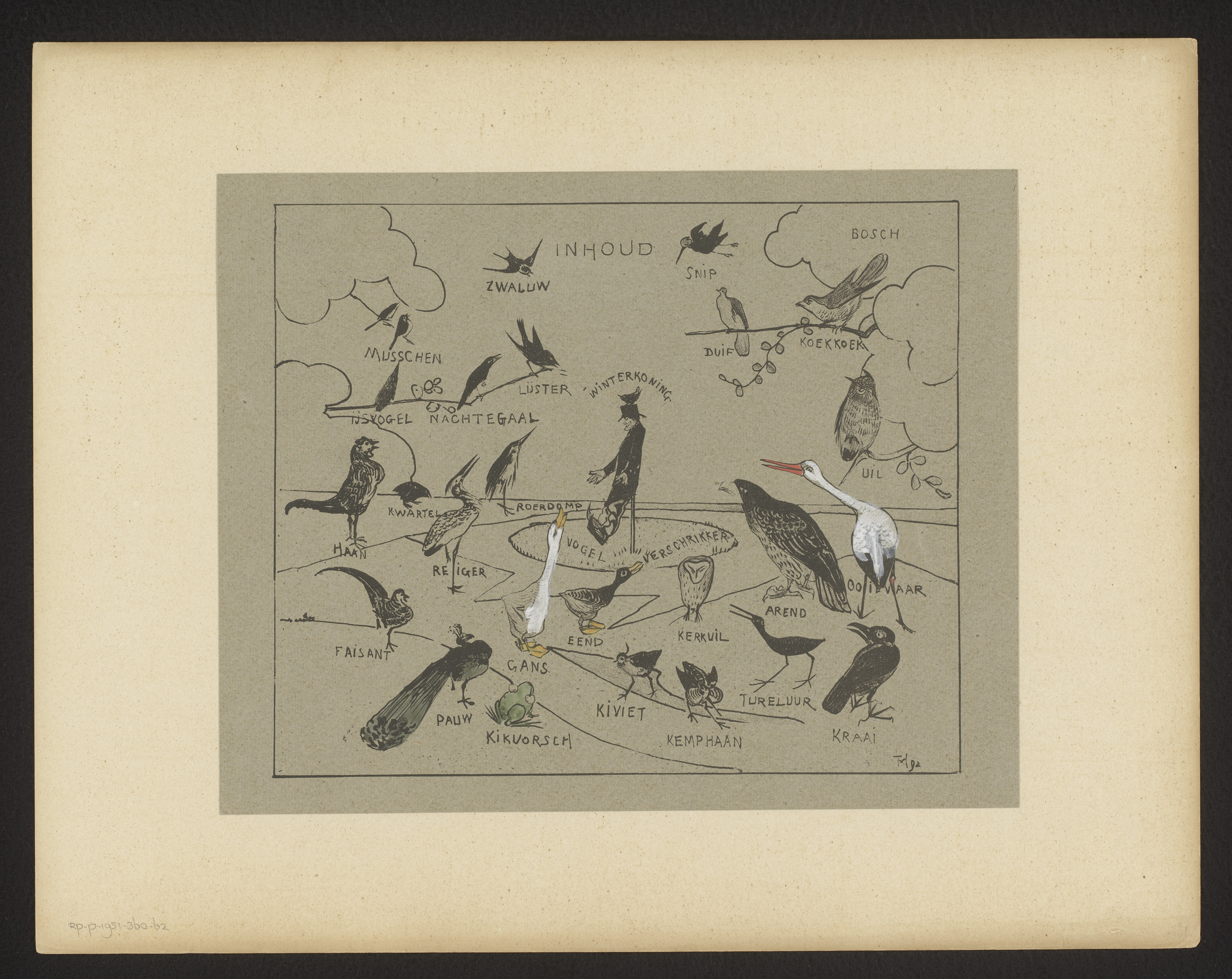 Tekstblad met onder andere pauw, uilen, reiger en ro...
