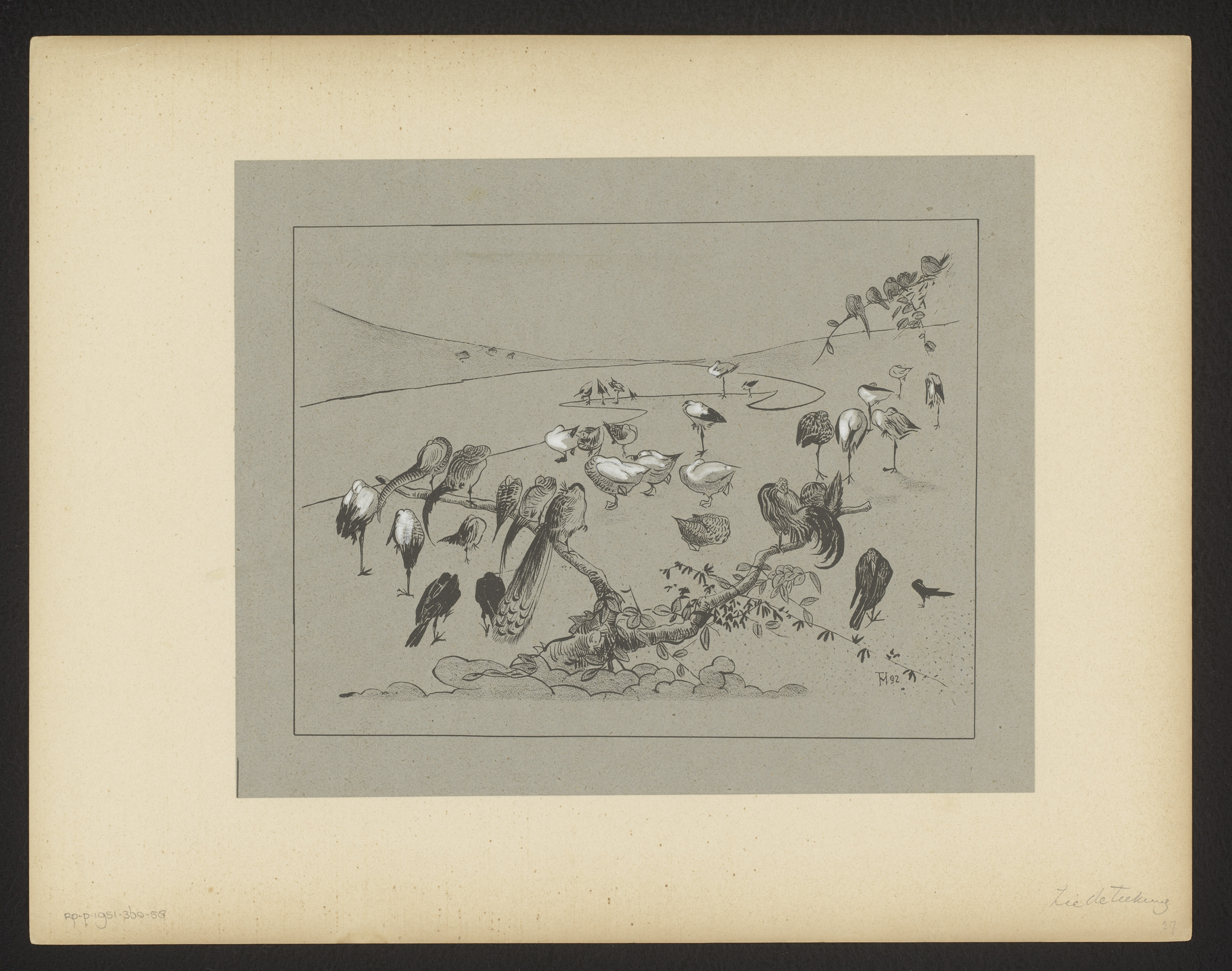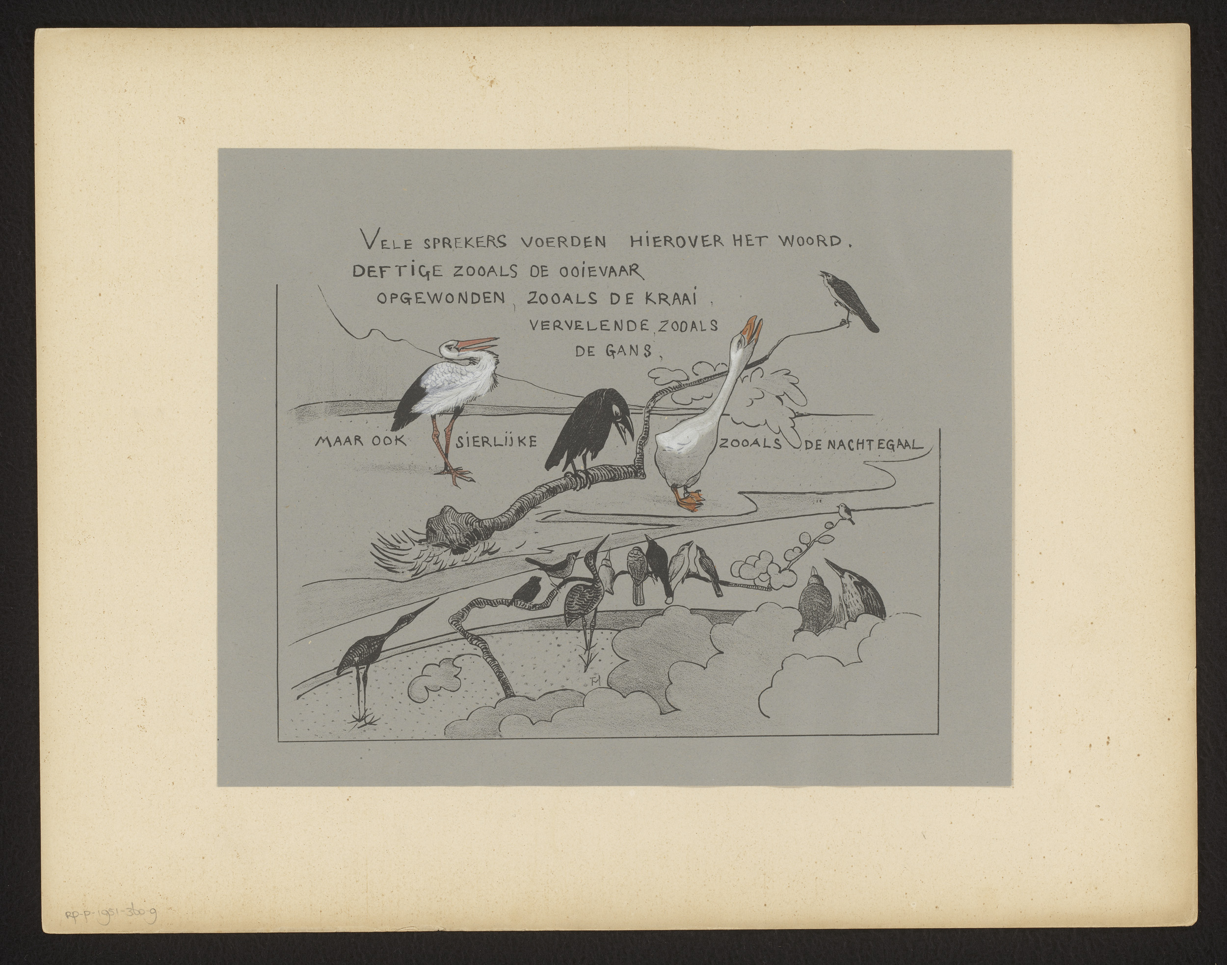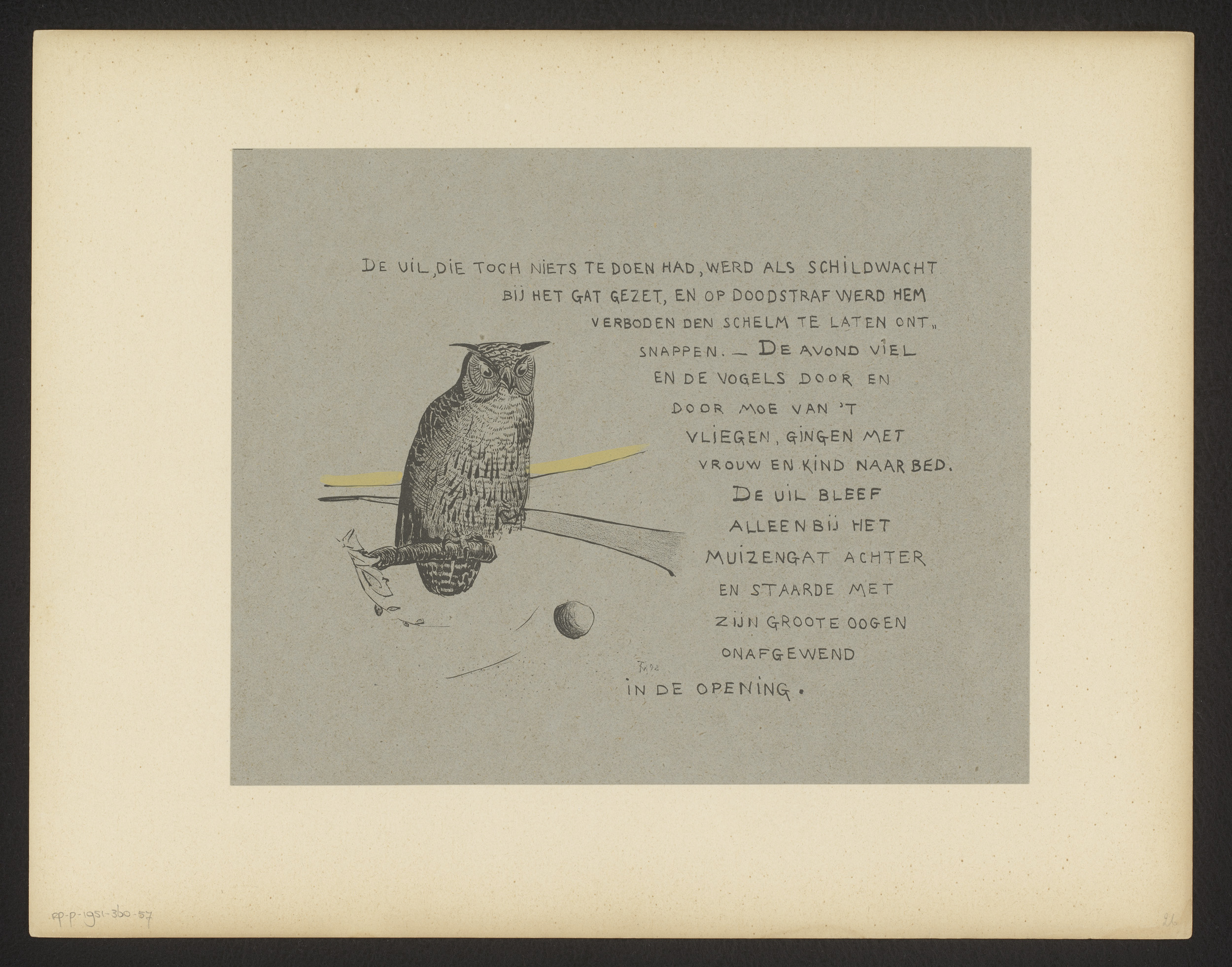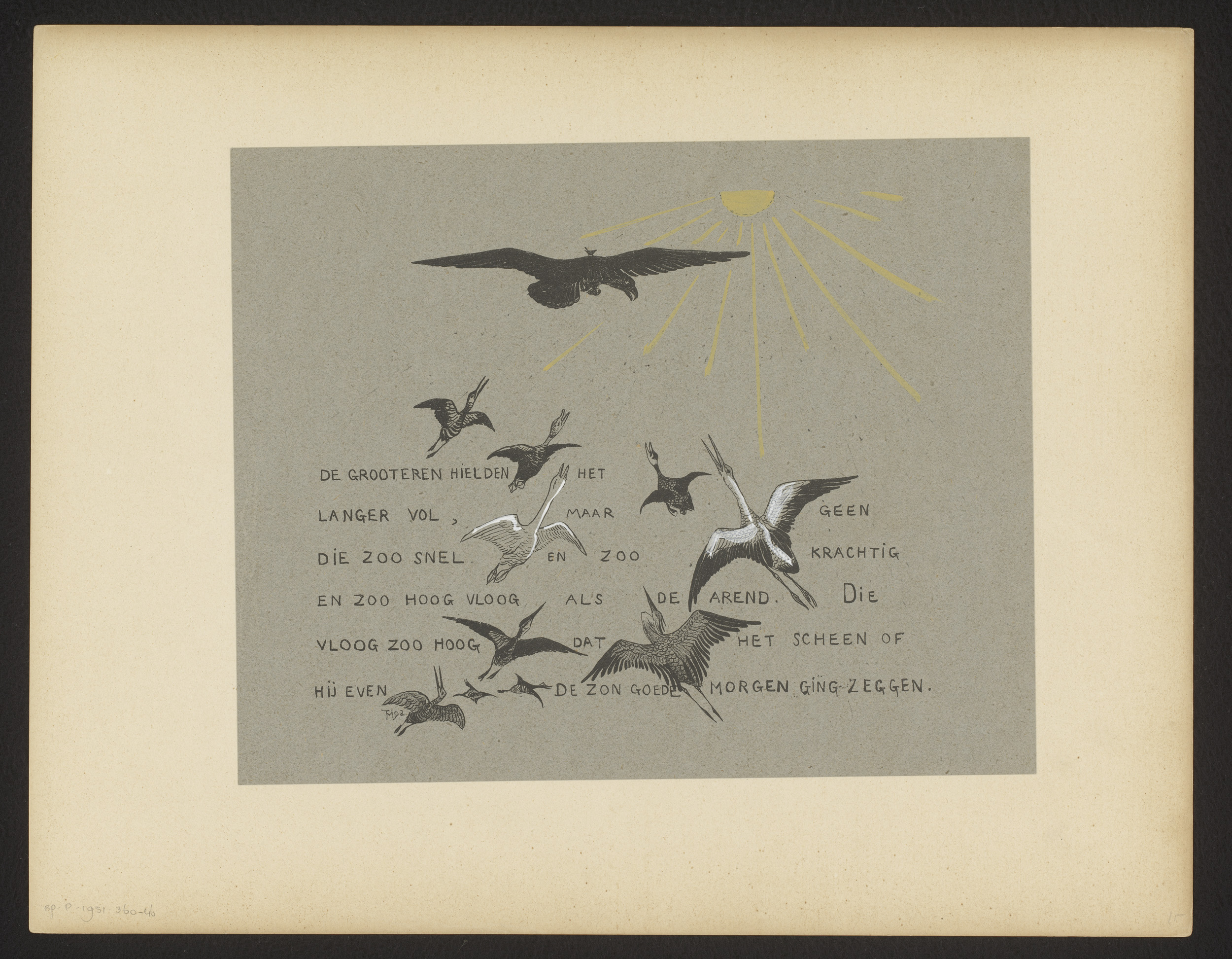 Tekstblad met onder andere pauw, uilen, reiger en ro...