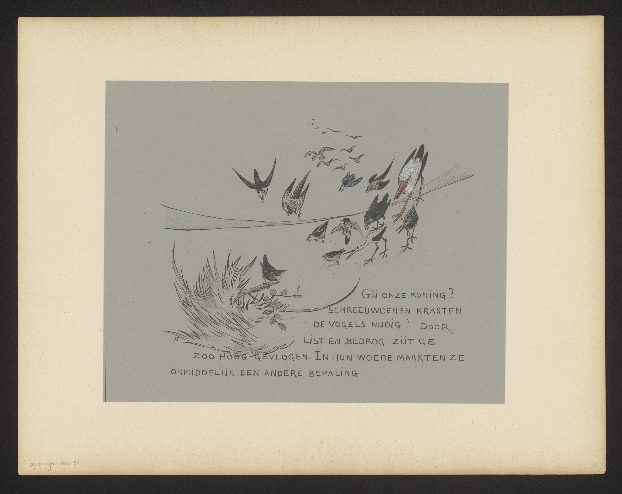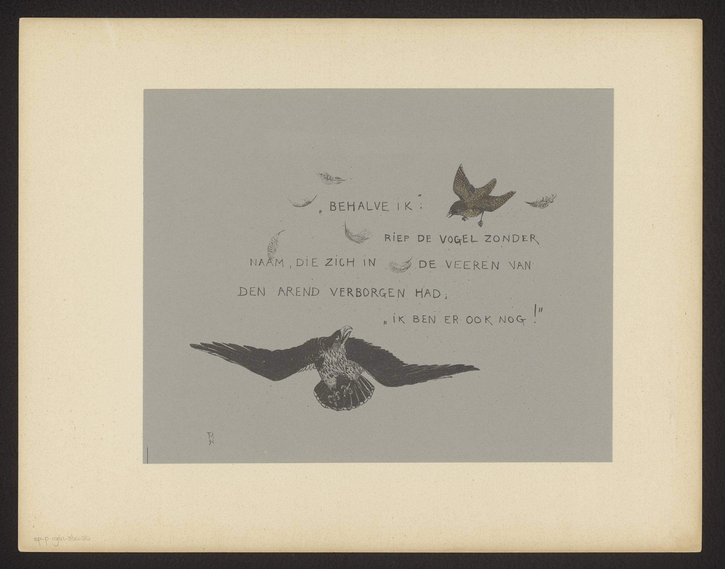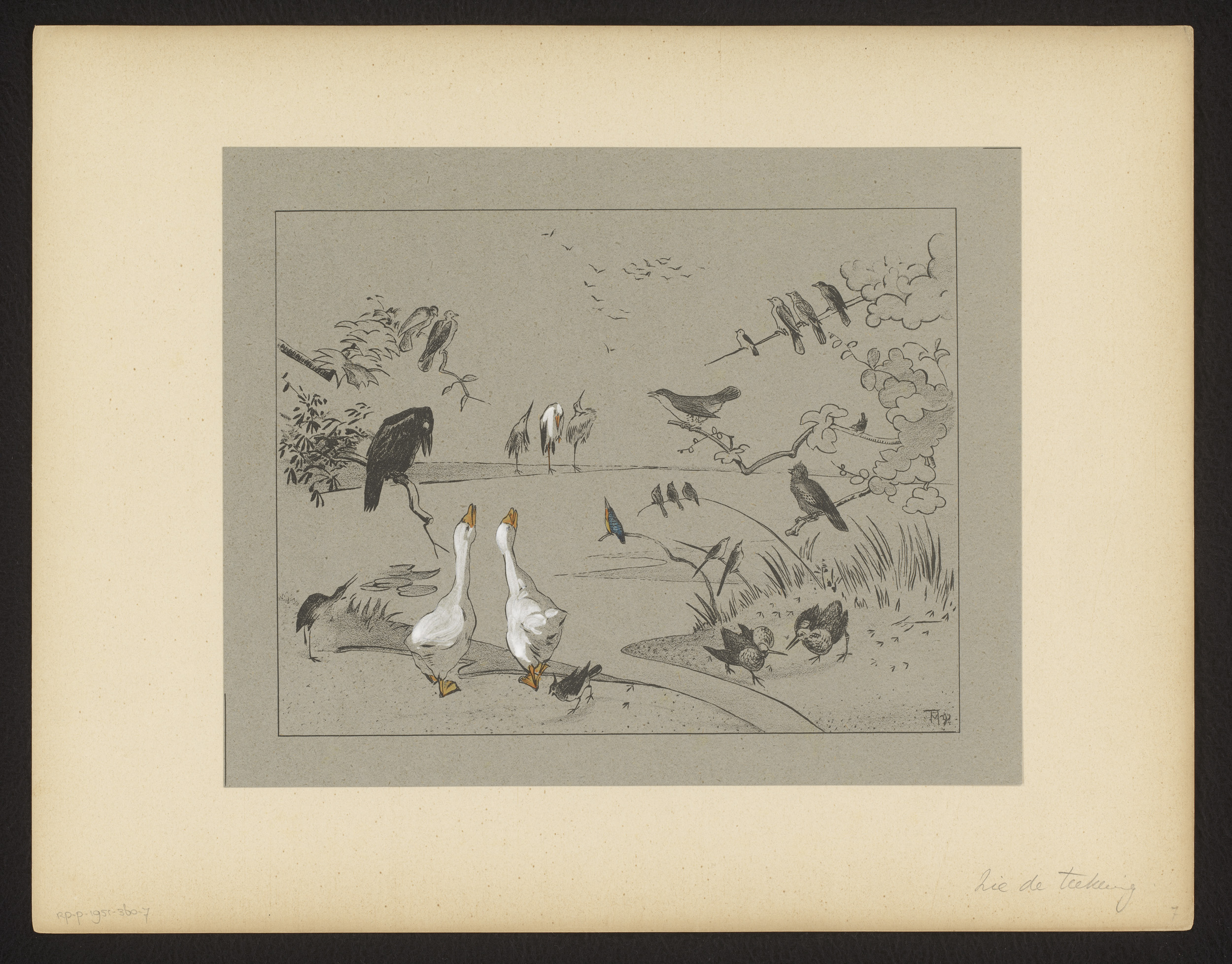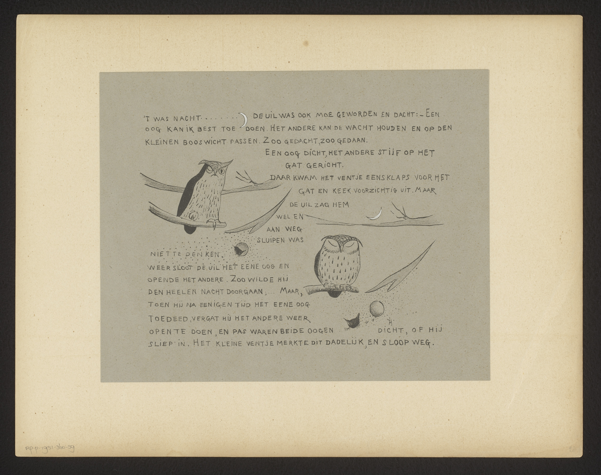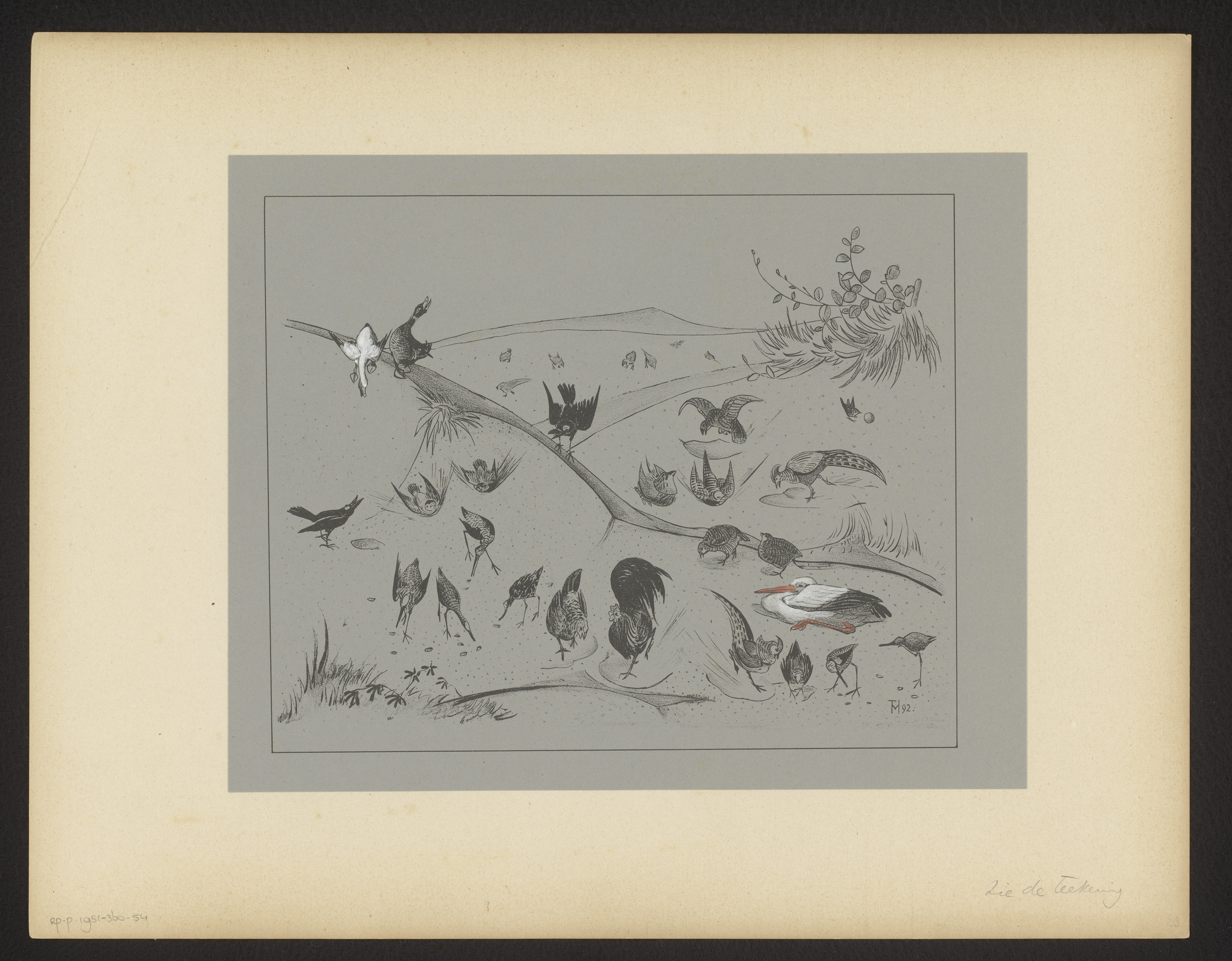 Tekstblad met onder andere pauw, uilen, reiger en ro...