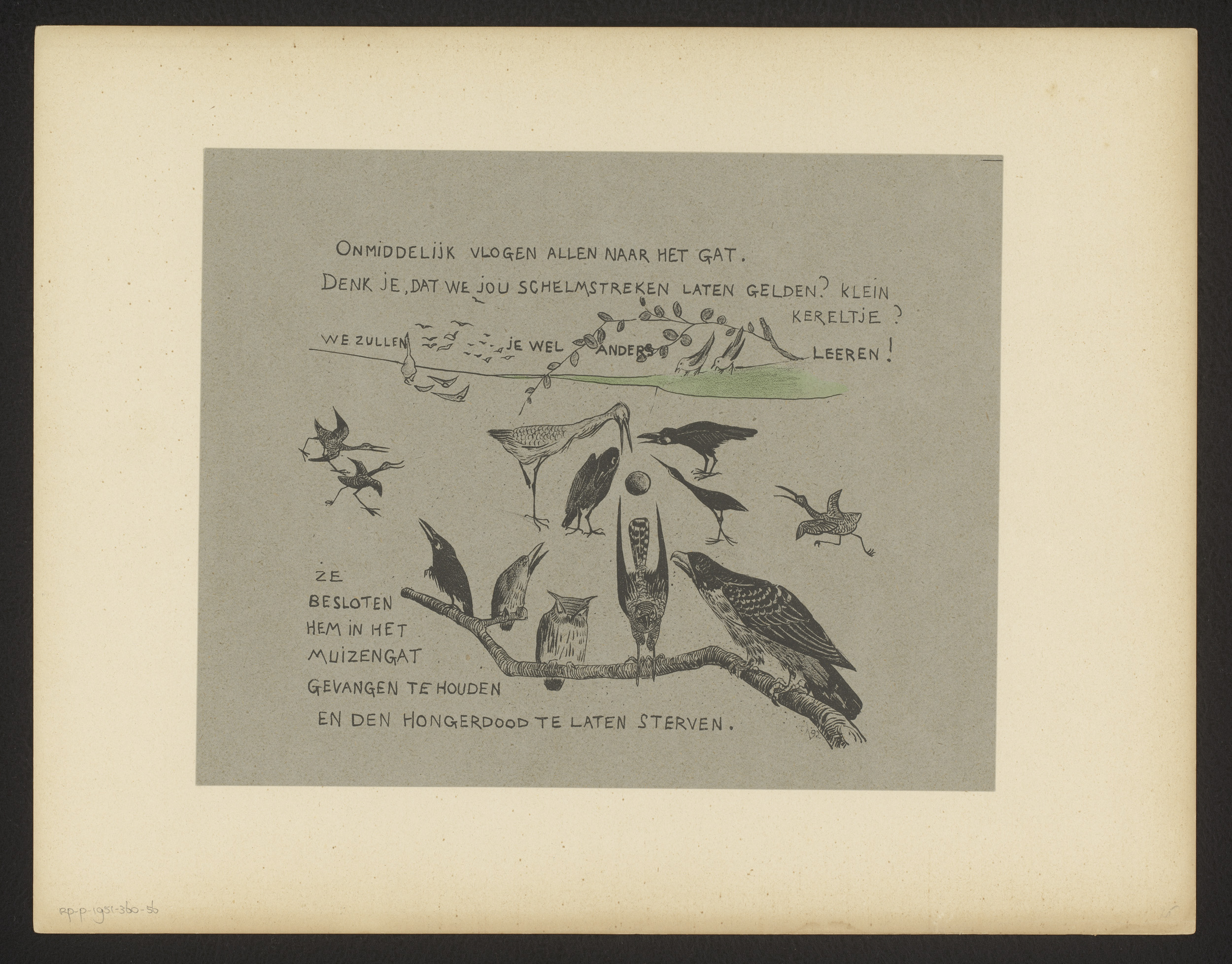 Tekstblad met diverse vogelsoorten bij het muizenhol...