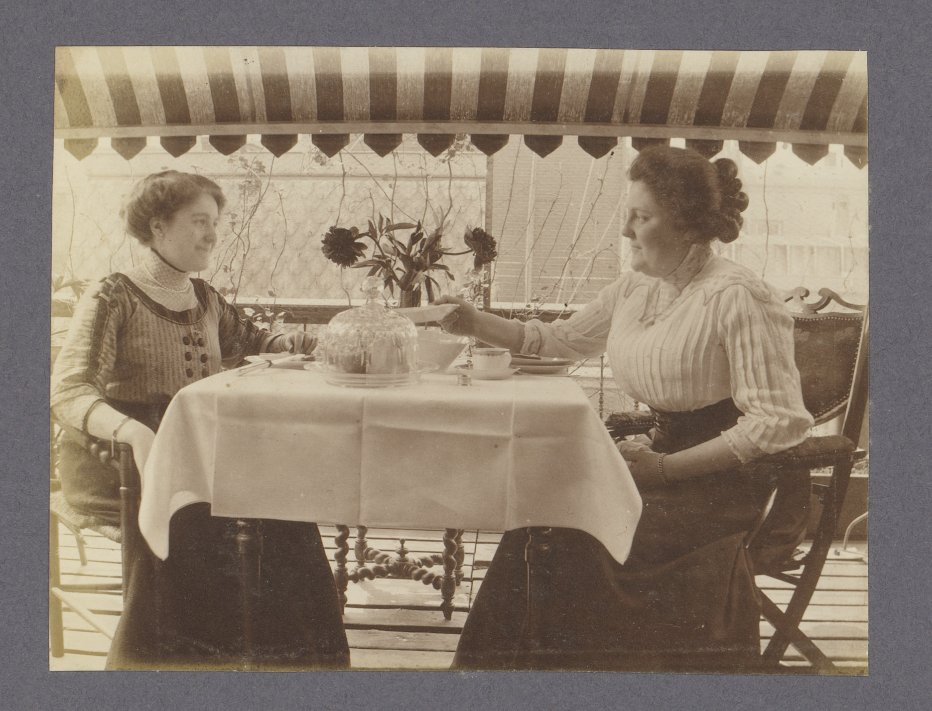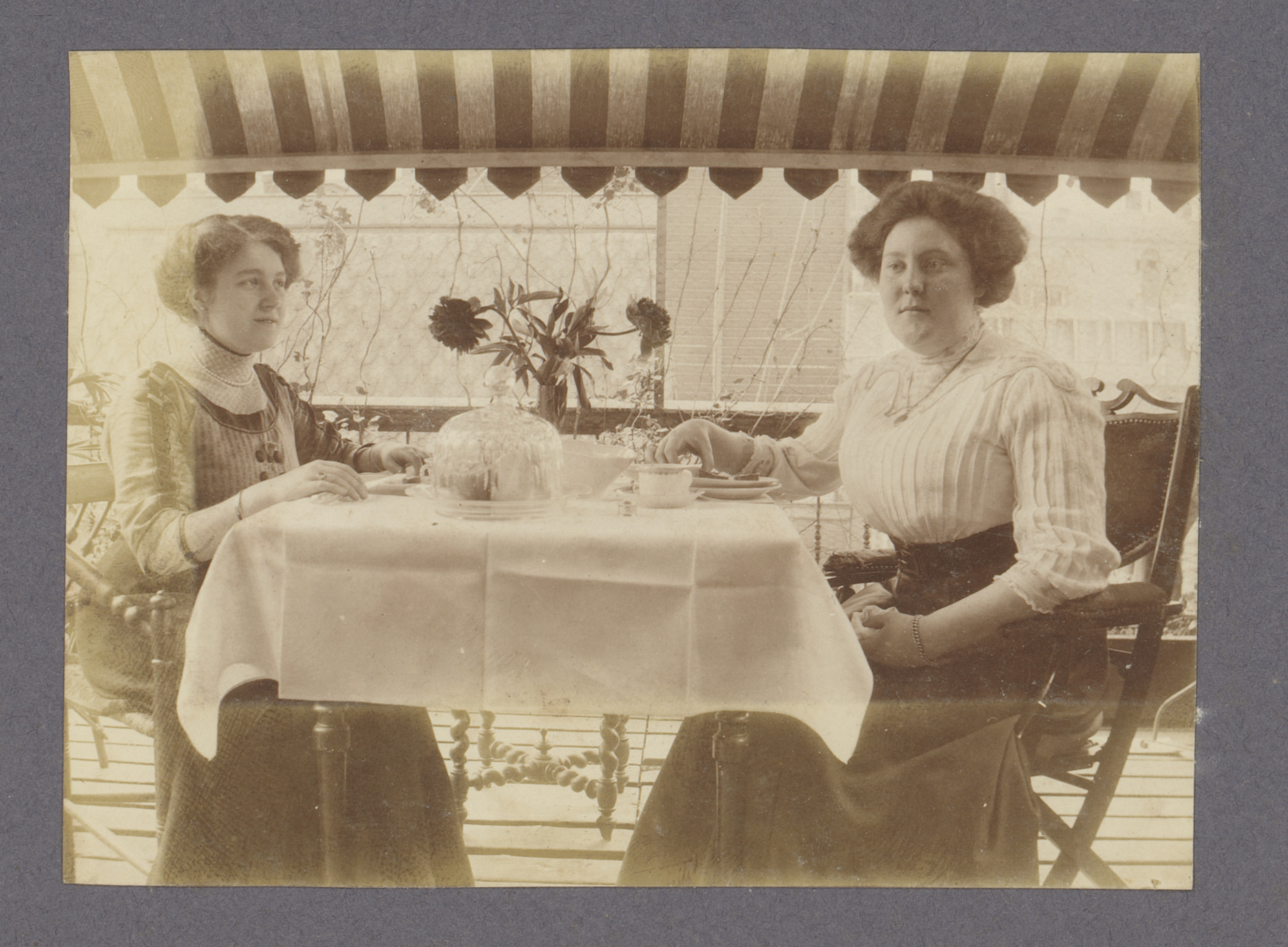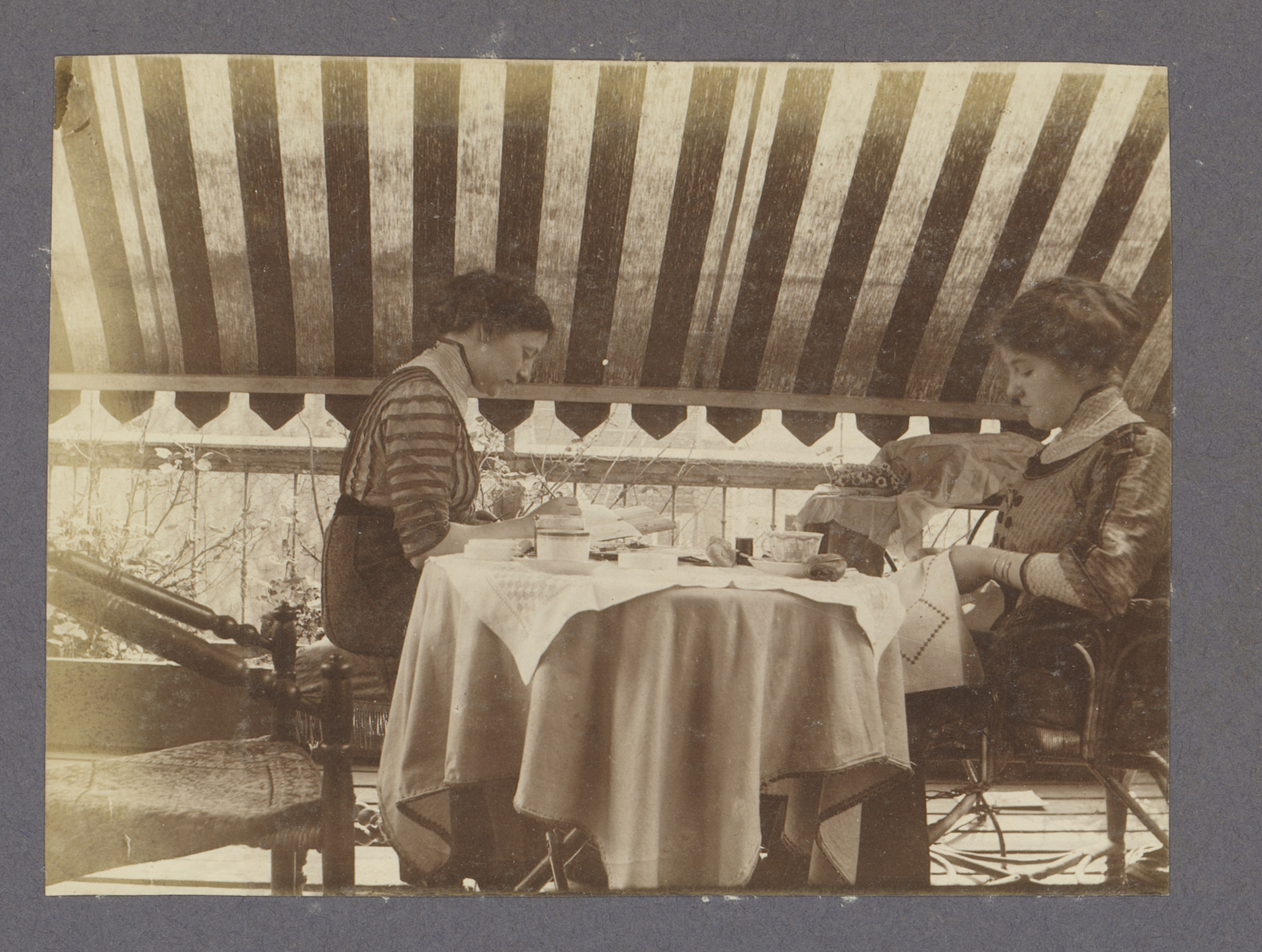 Twee vrouwen met borduurwerk op een terras aan tafel