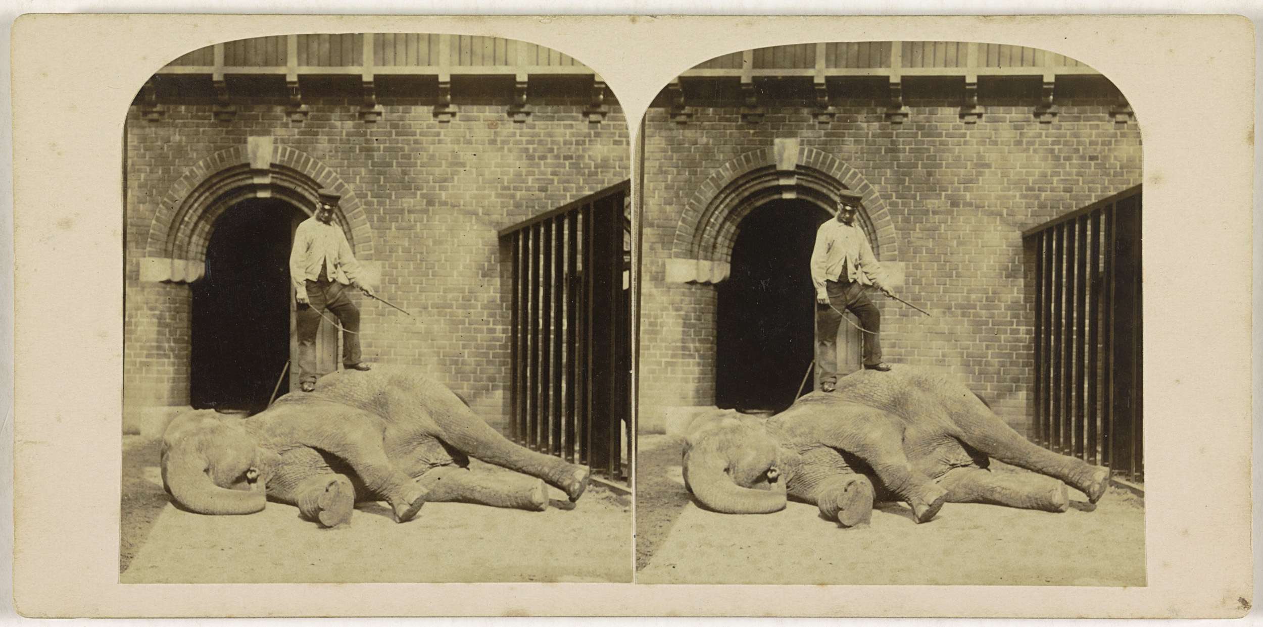 Man staand op olifant in dierentuin (Artis?), Nederland