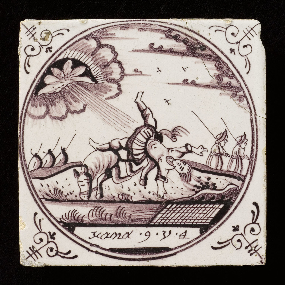 Tegel van keramiek met tinglazuur, voorstellende: De...