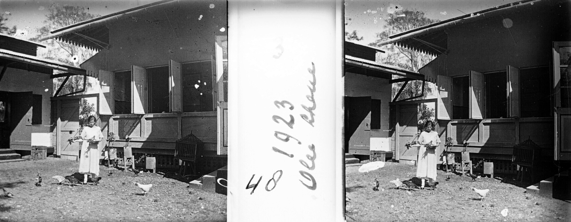 Gretchen Japing voert de duiven en kippen achter het...
