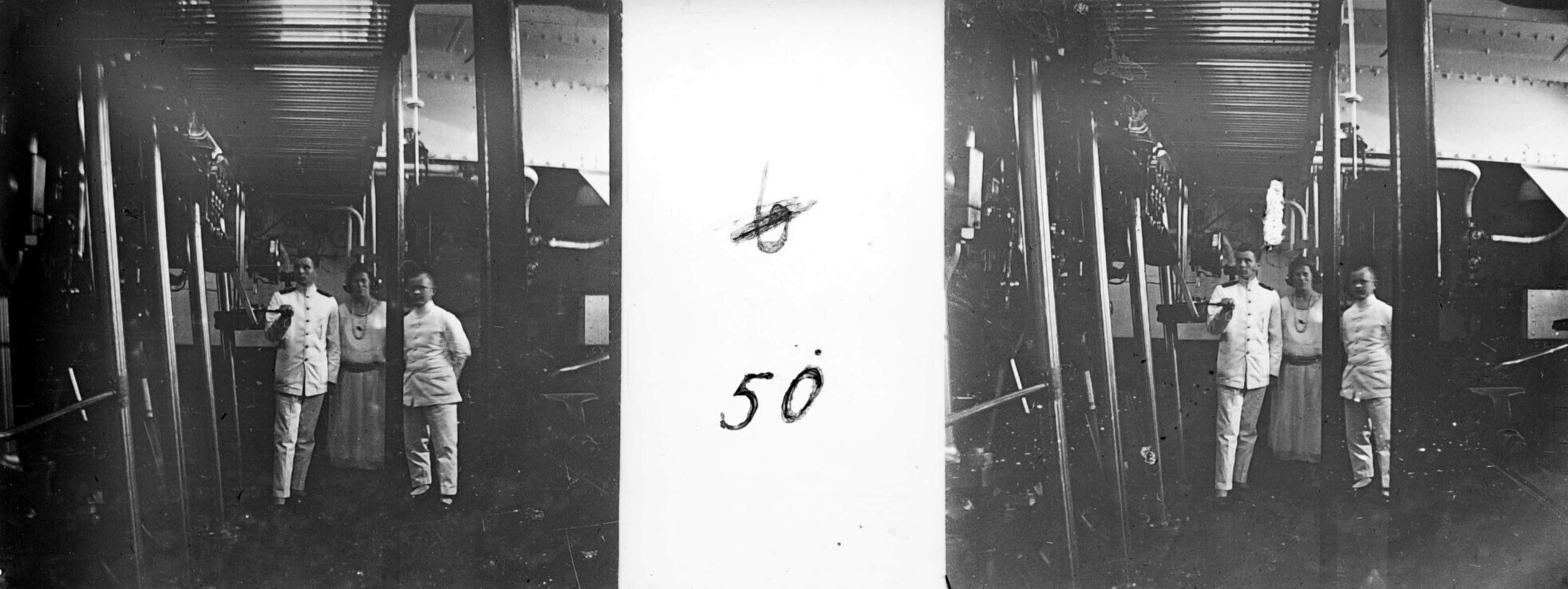 Gretchen Japing met bemanningsleden in de machinekam...