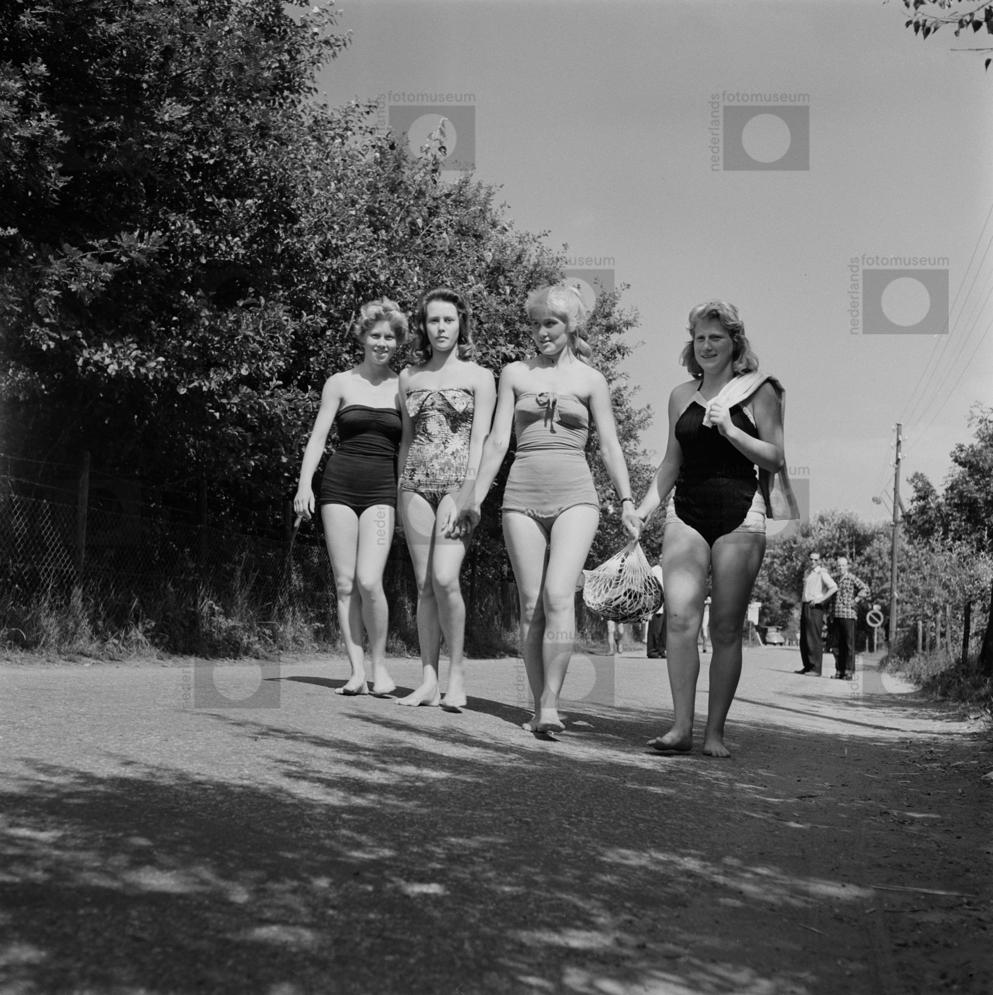 Vier jonge vrouwen lopen in badpak richting strand.