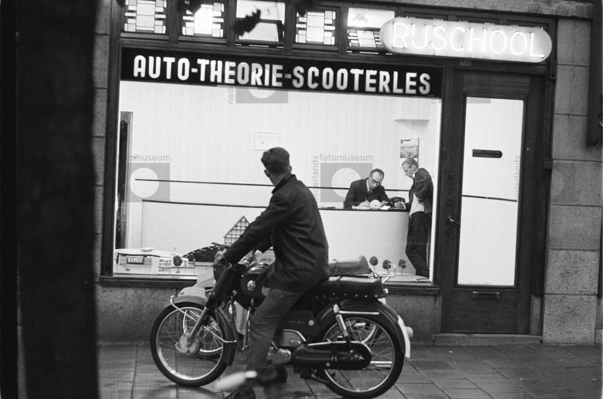 Amsterdam. Jongeman met zijn bromfiets voor de etala...
