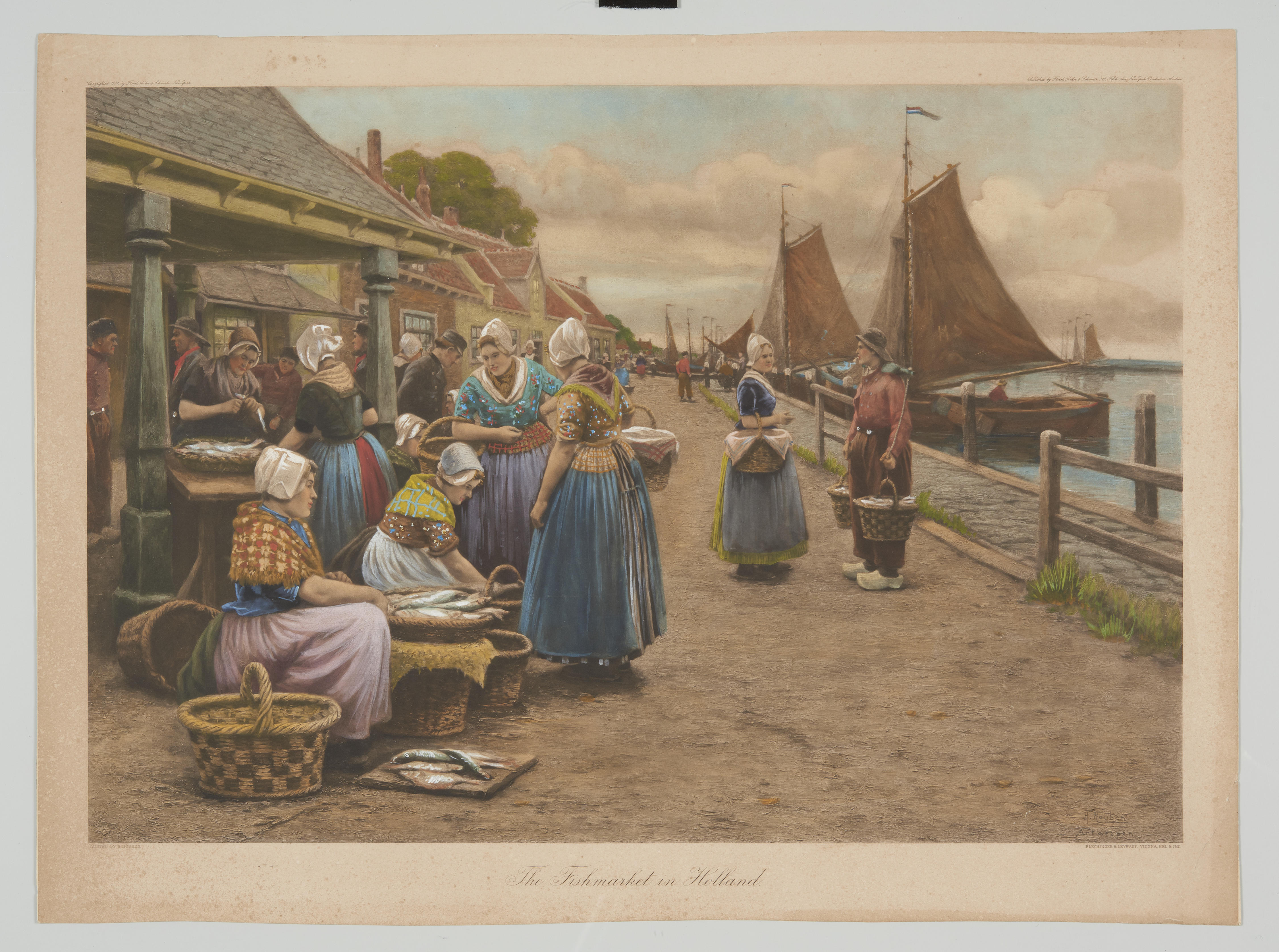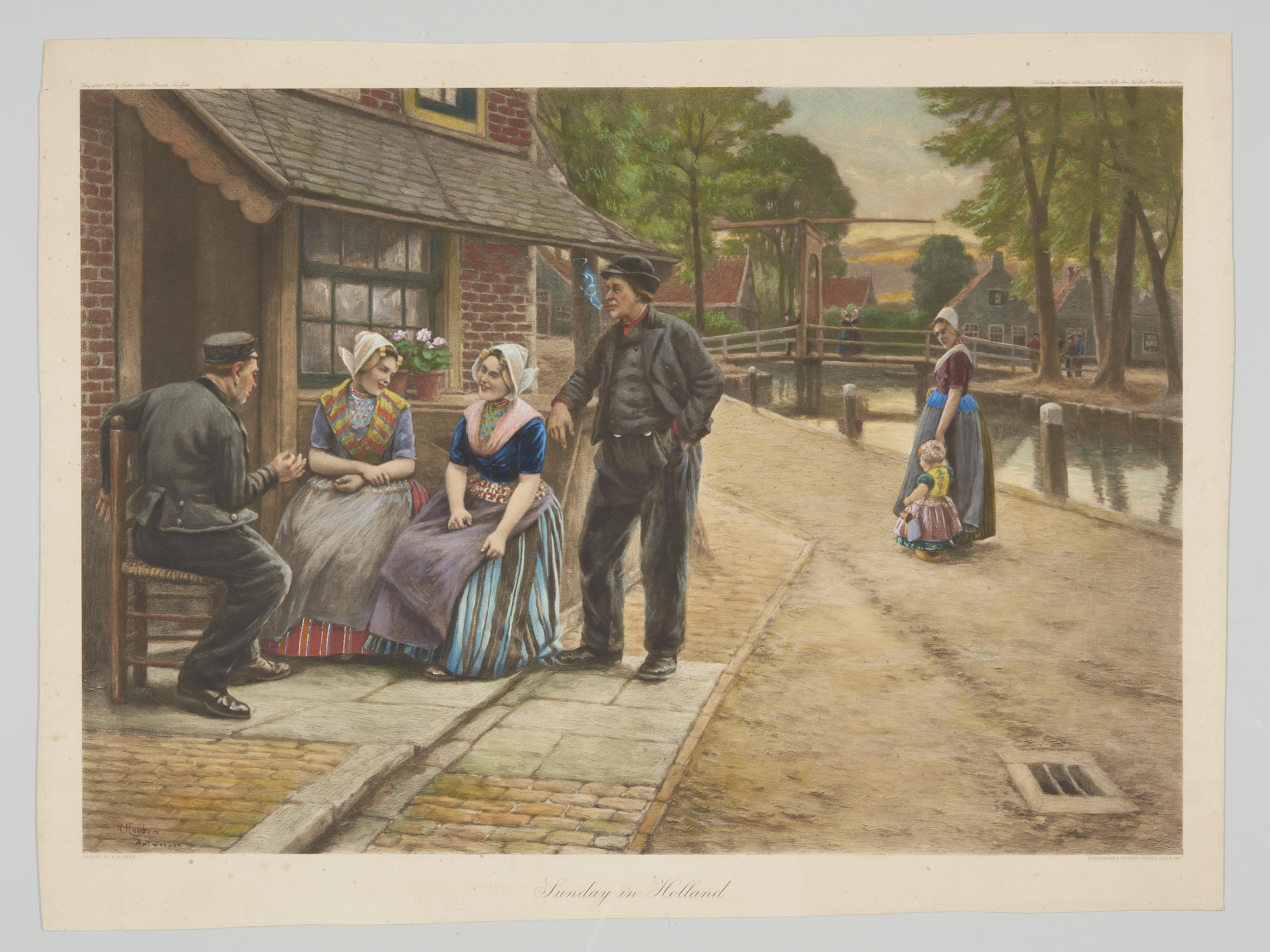 Prent van vrouwen en mannen in pseudo-Zeeuwse streek...