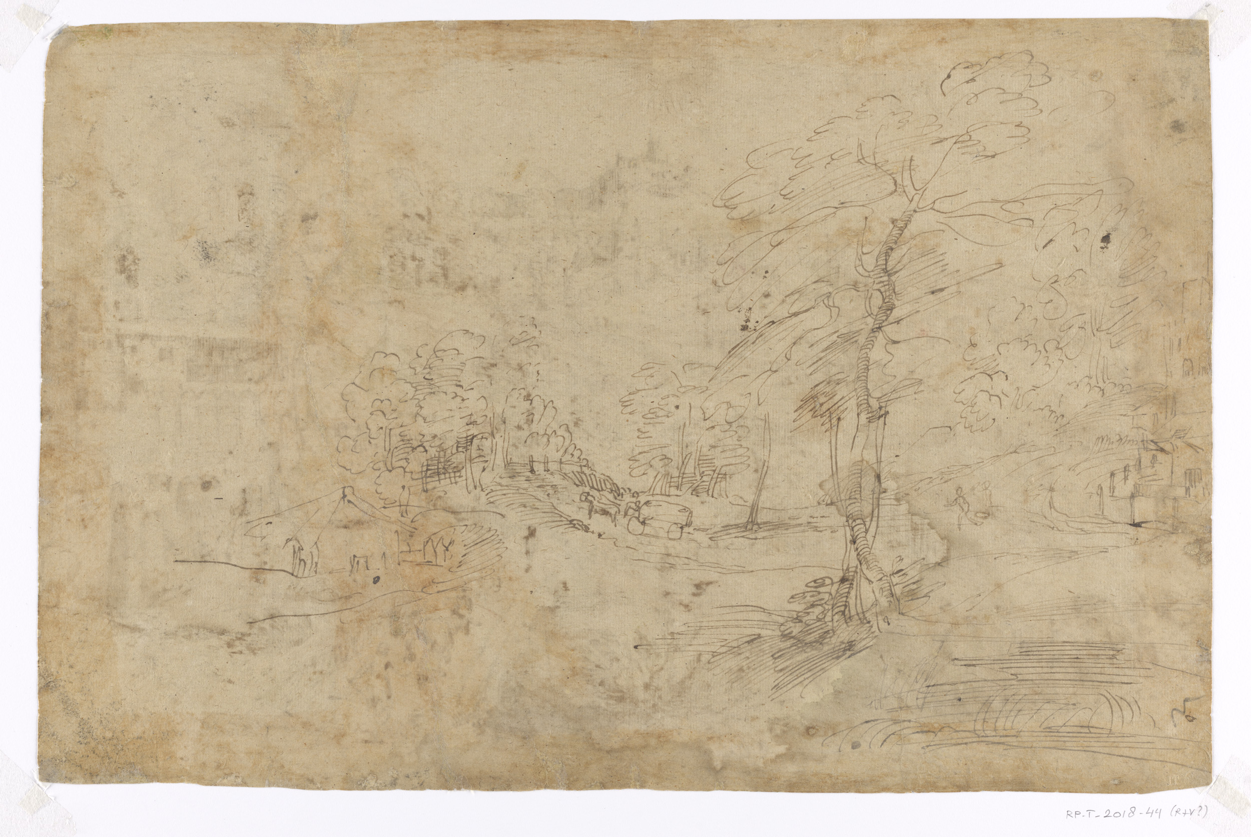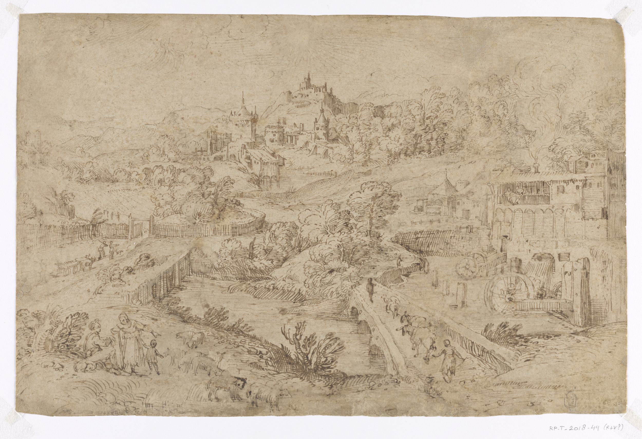 A Hillside Landscape Sketch with Figures and Buildings
