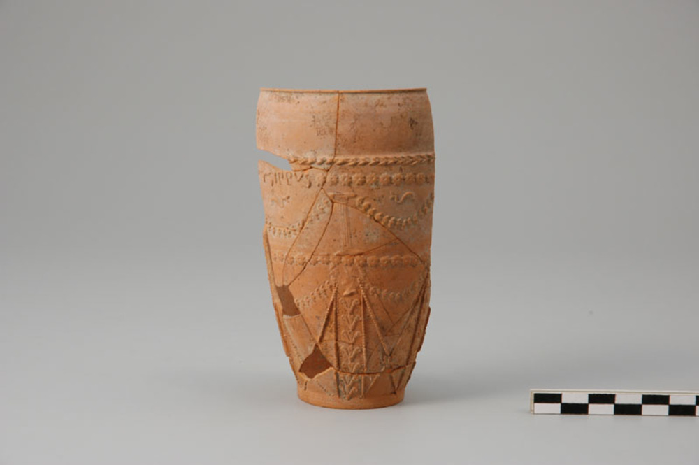 Beker (Aco-beker) van oranje aardewerk uit de Romein...