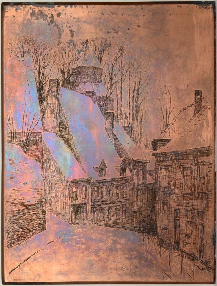 Drukplaat van de ets Vleeshouwerstraat met Sint Nico...
