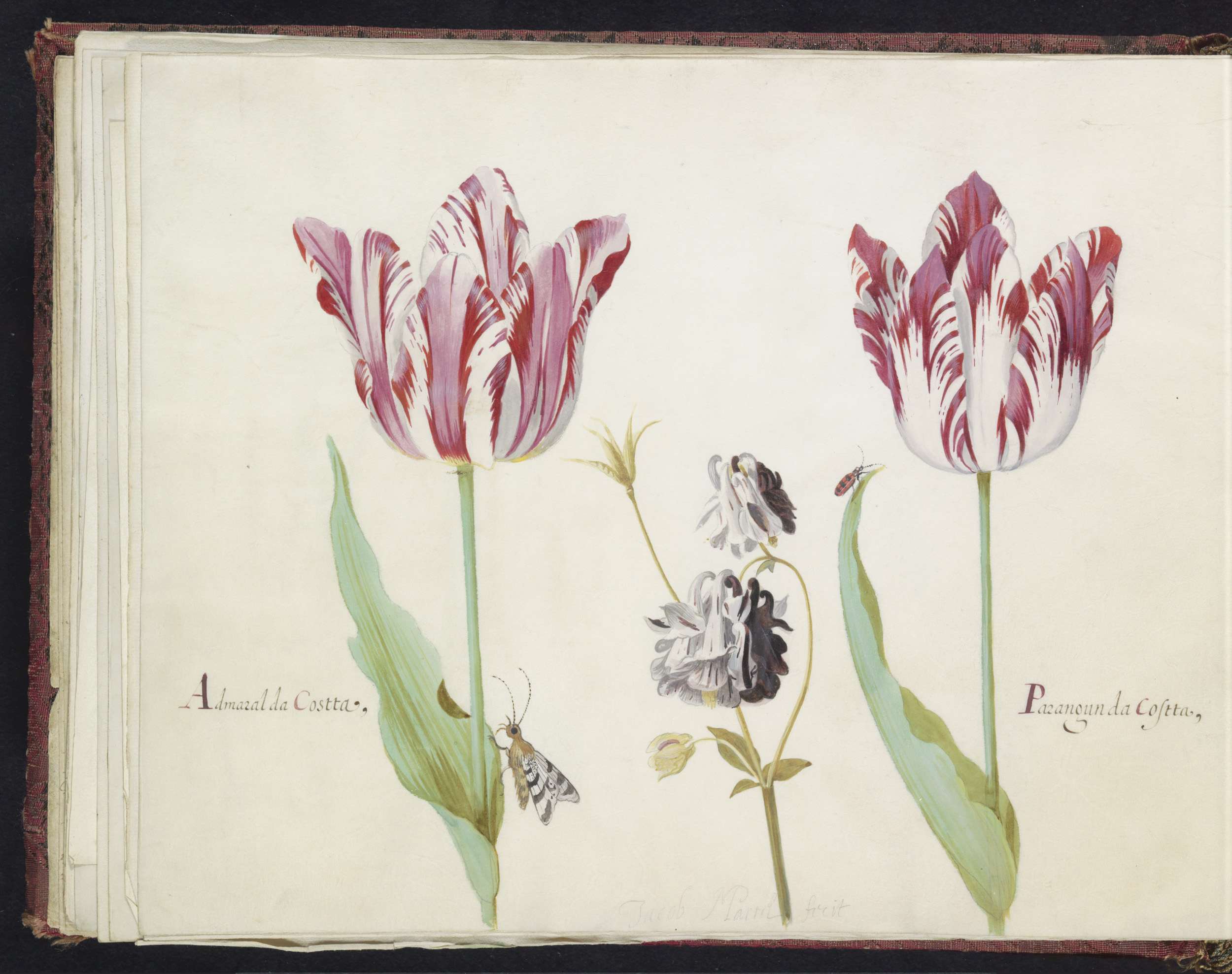 Twee tulpen met akelei, nachtvlinder en kever