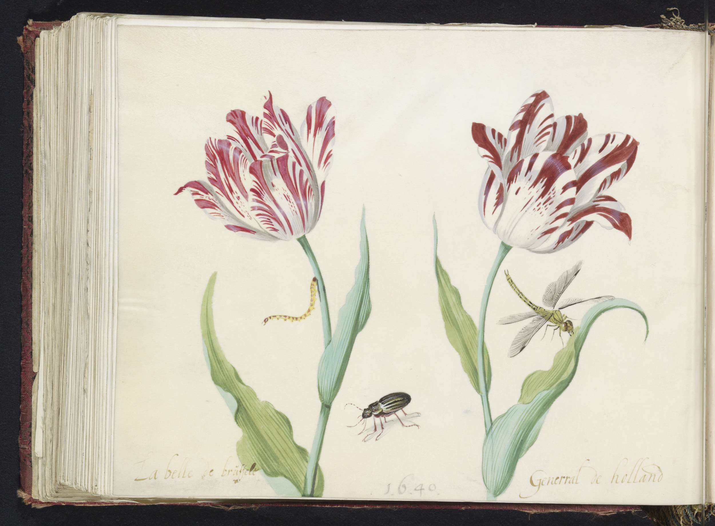 Twee tulpen met kever, rups en libelle