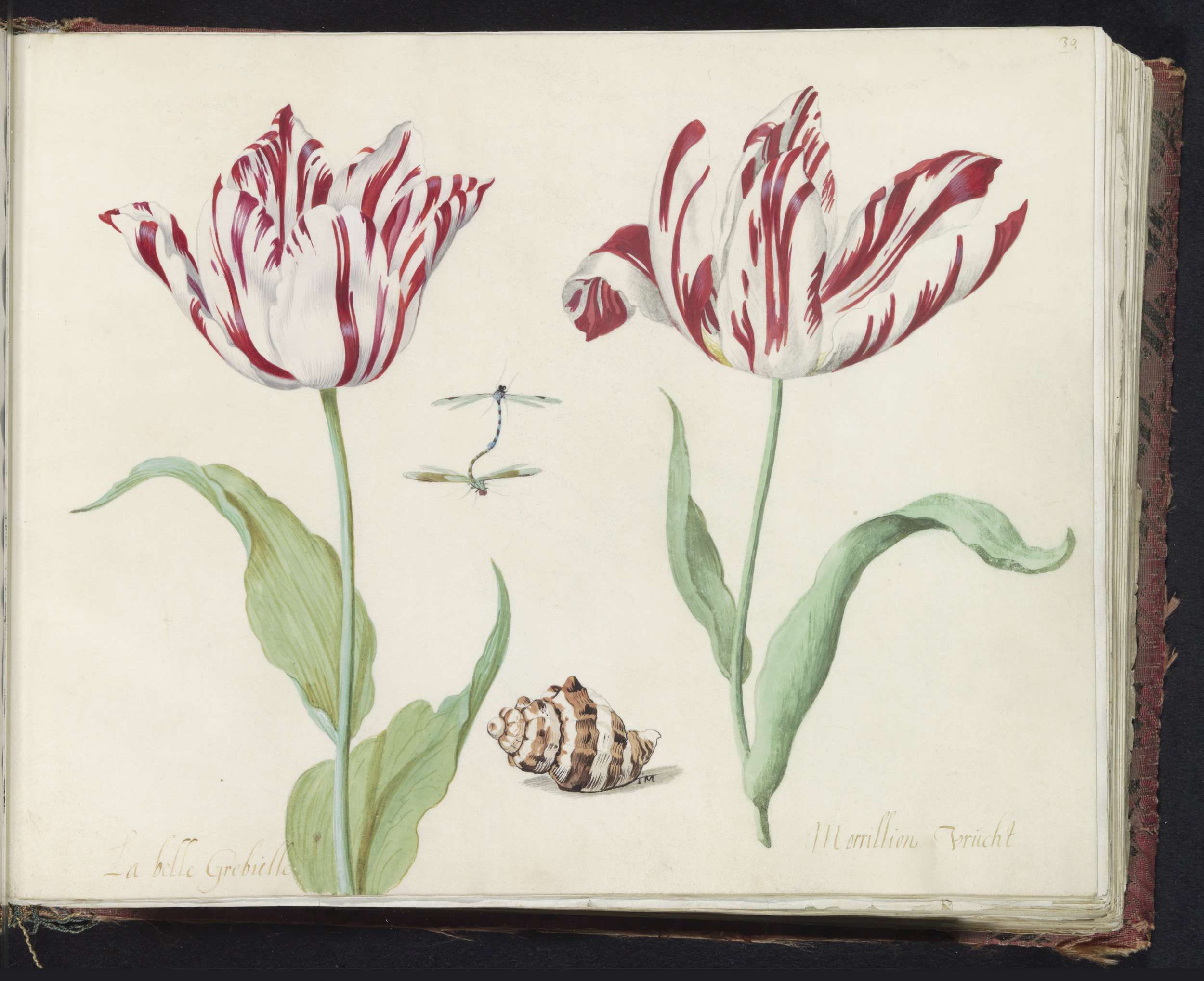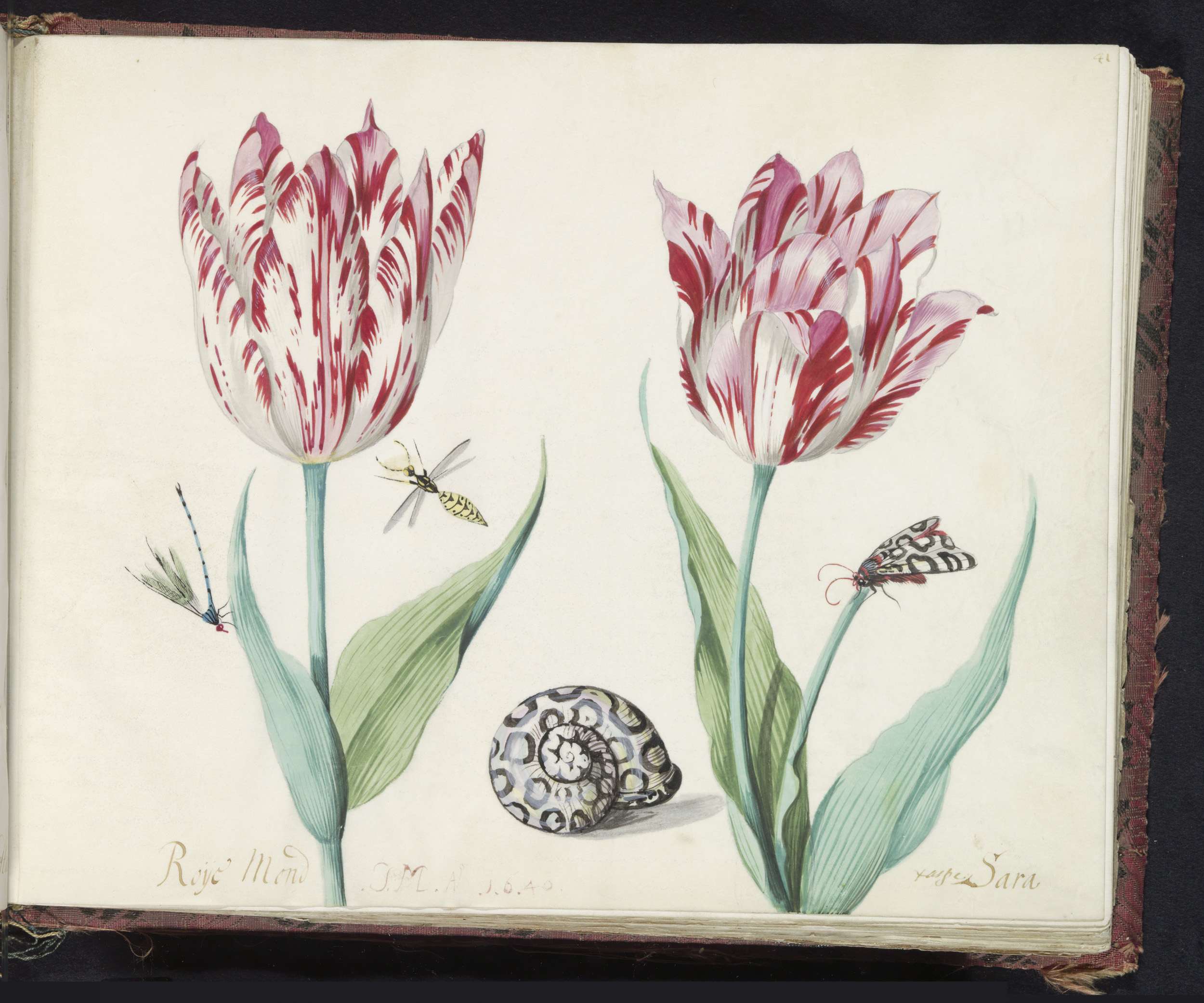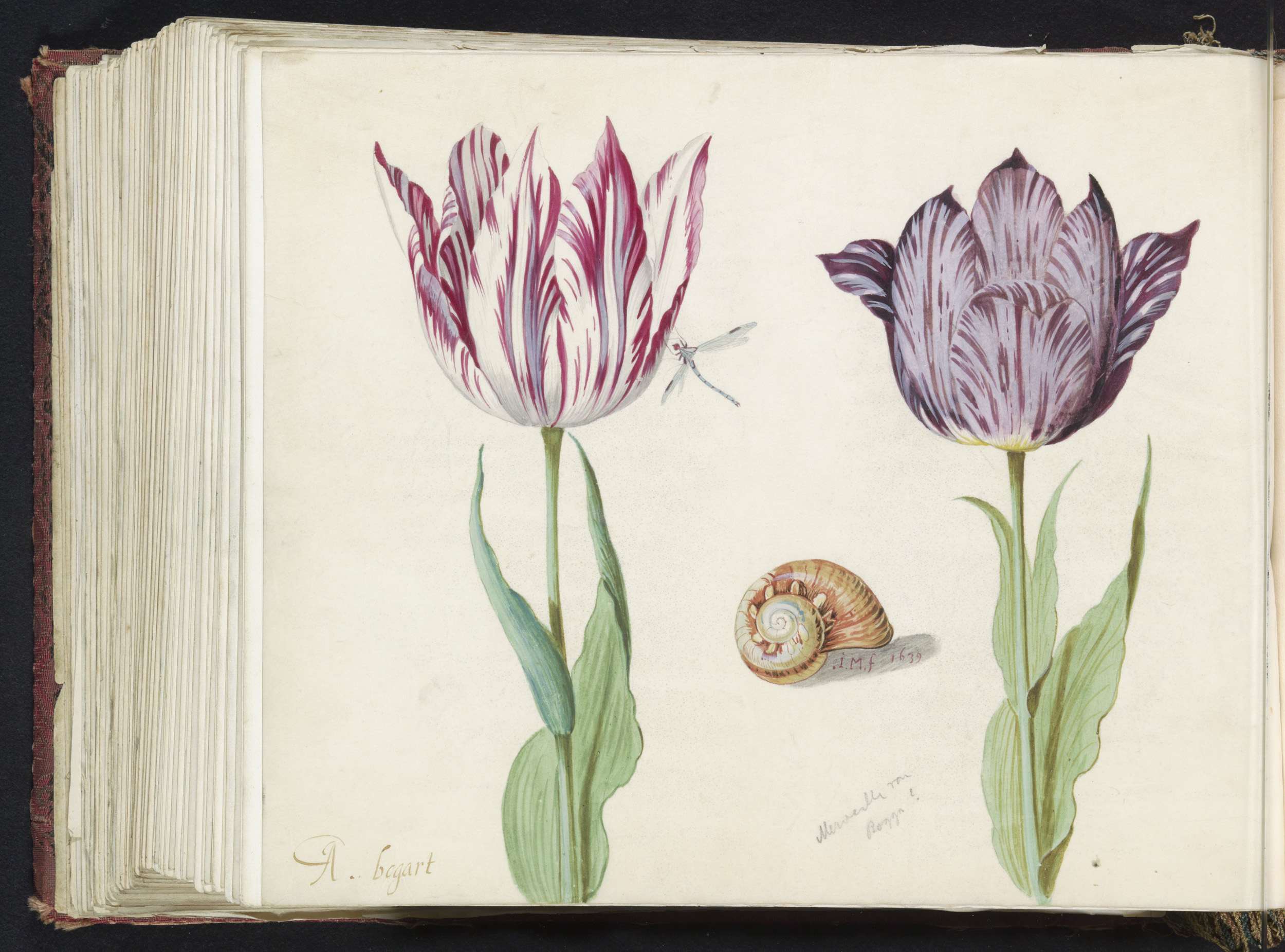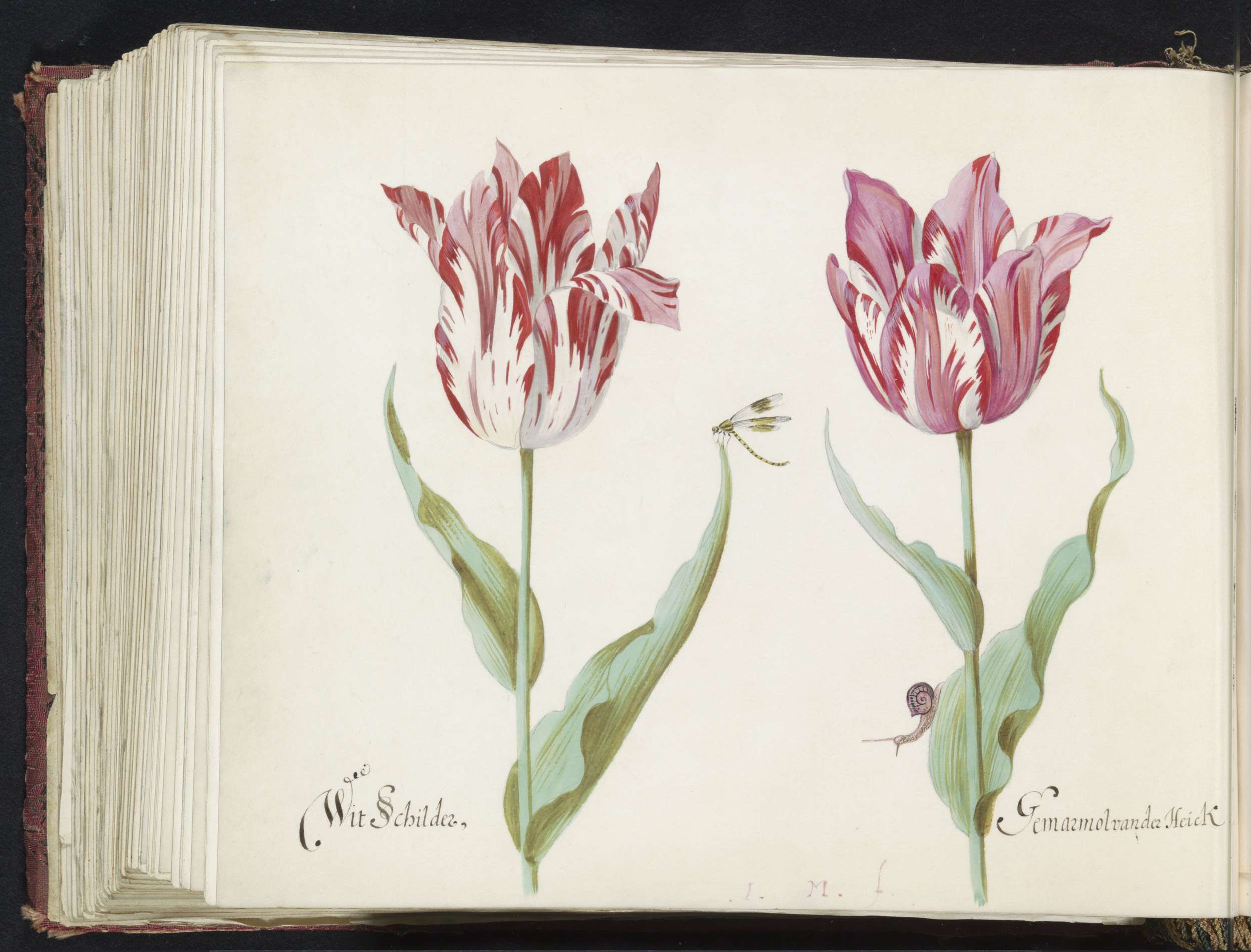 Twee tulpen met slakkenhuis en waterjuffer