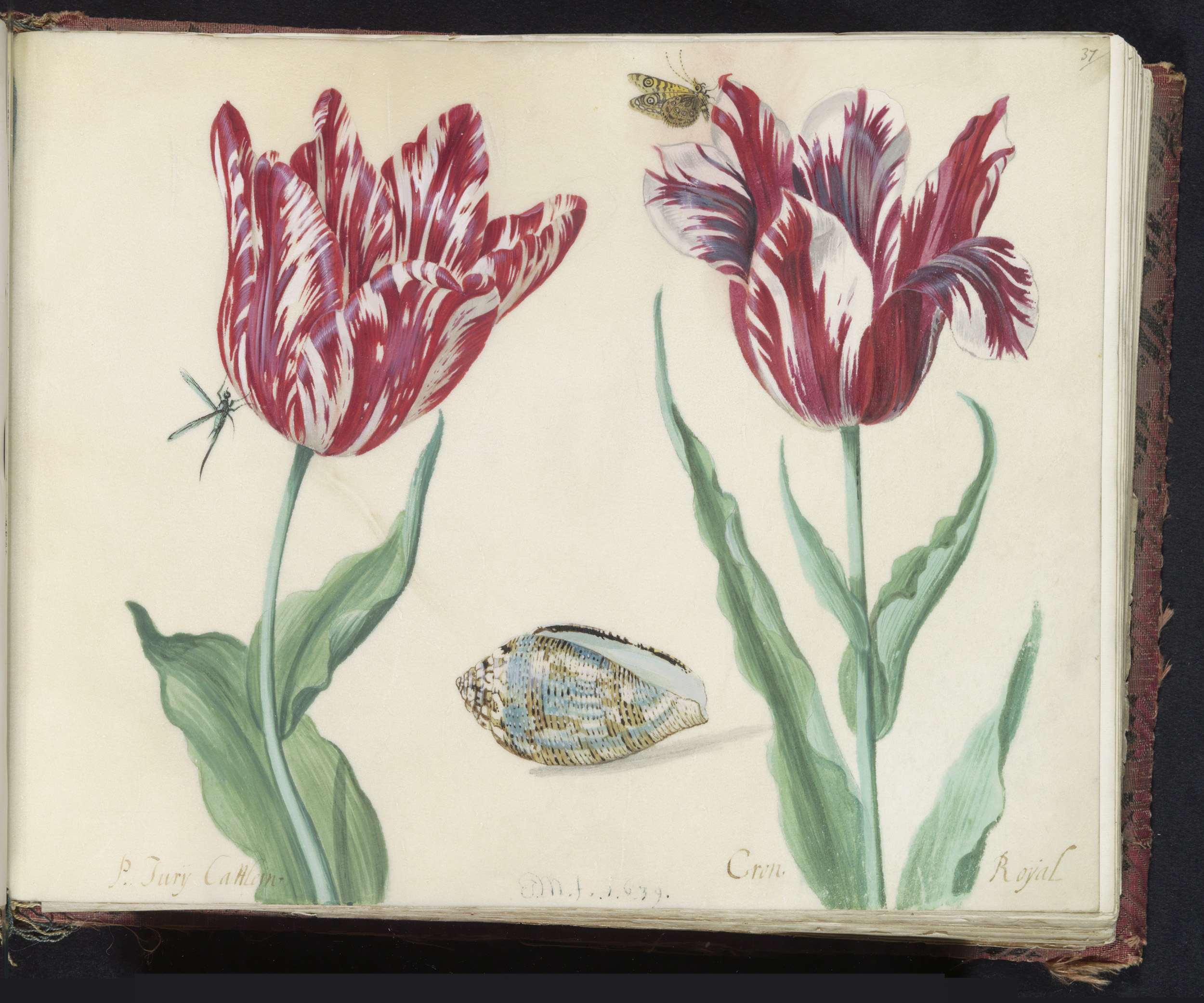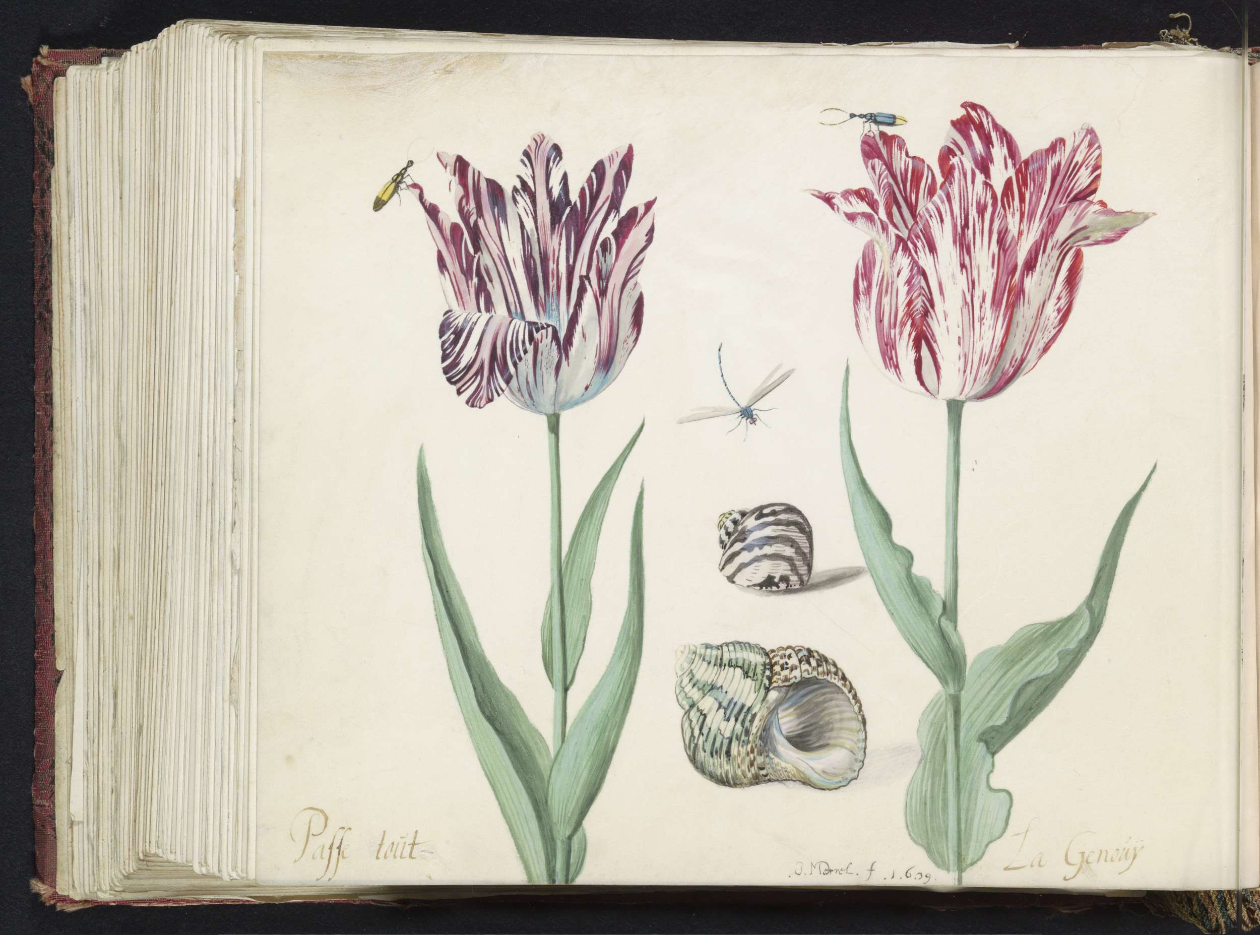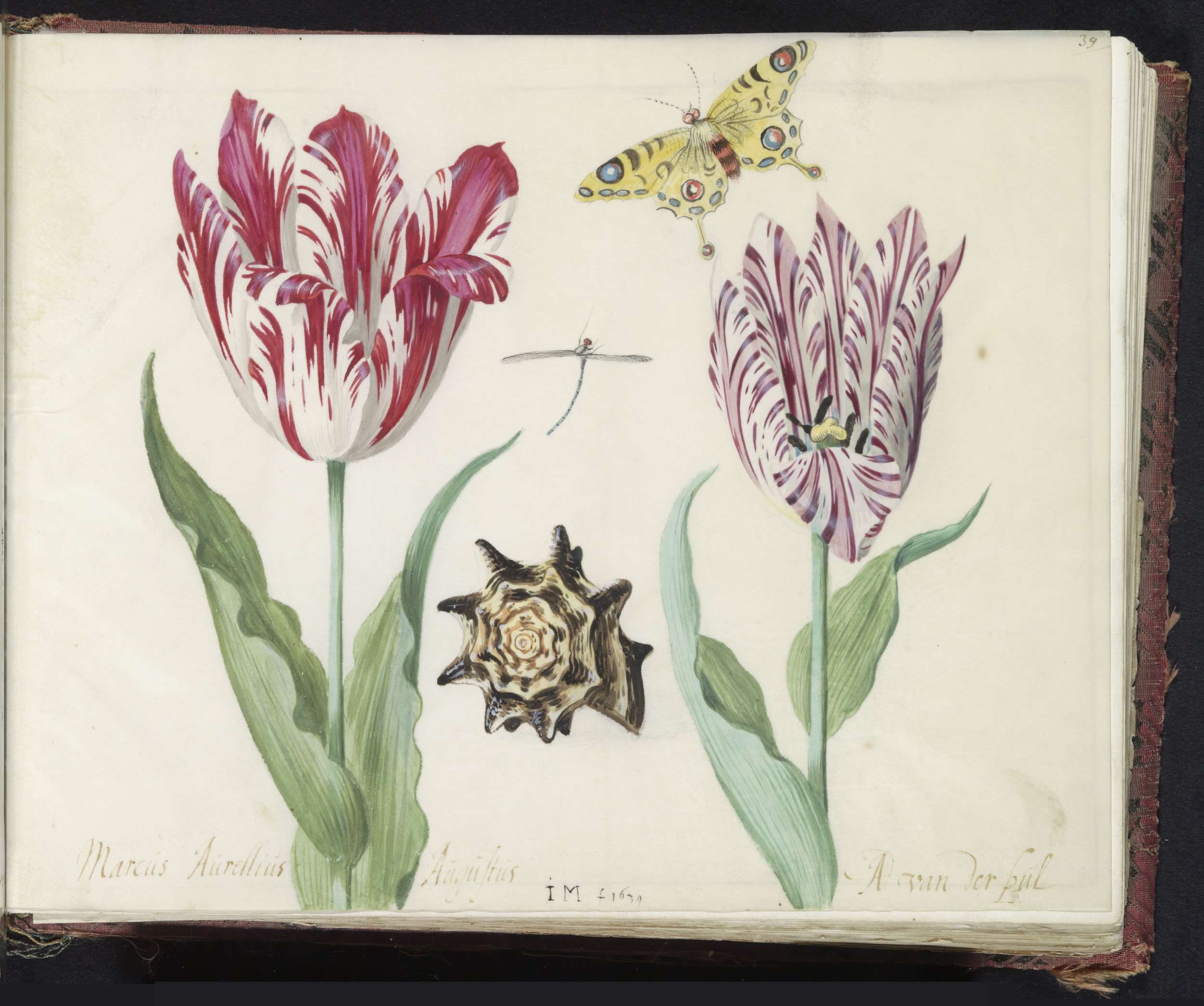 Twee tulpen met schelp, waterjuffer en vlinder