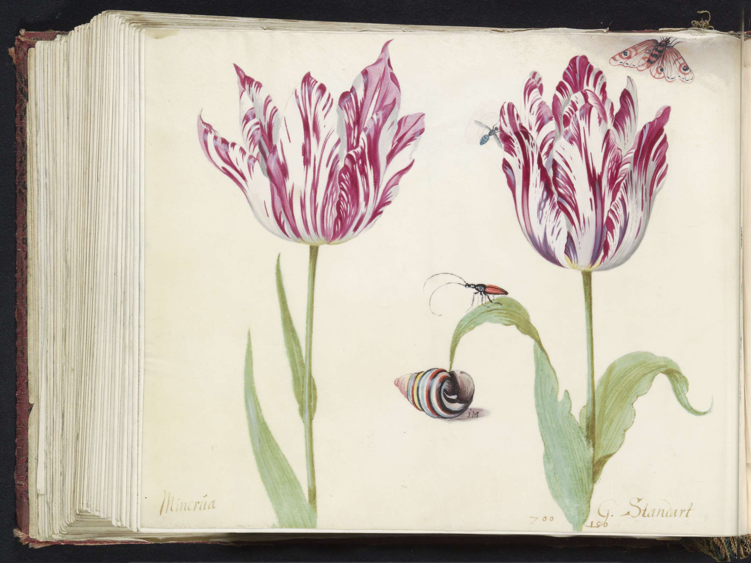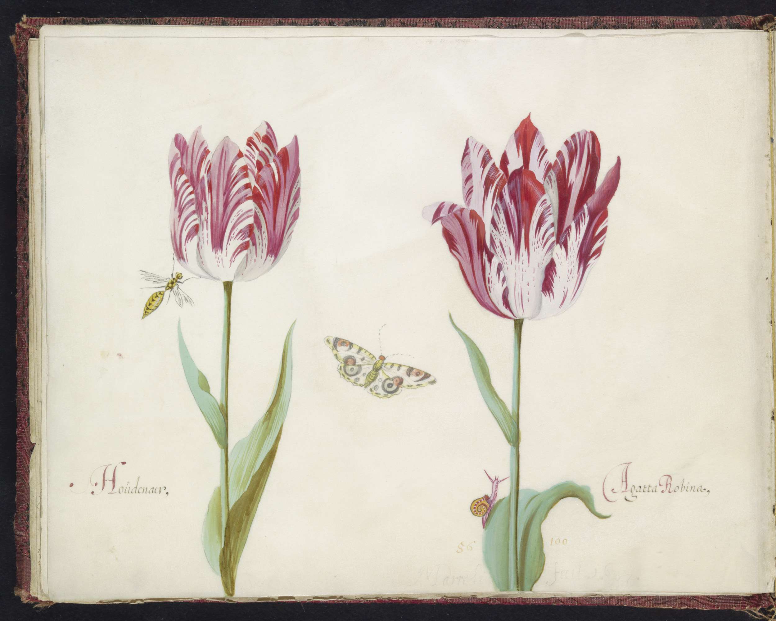 Twee tulpen met slak, nachtvlinder en twee insecten