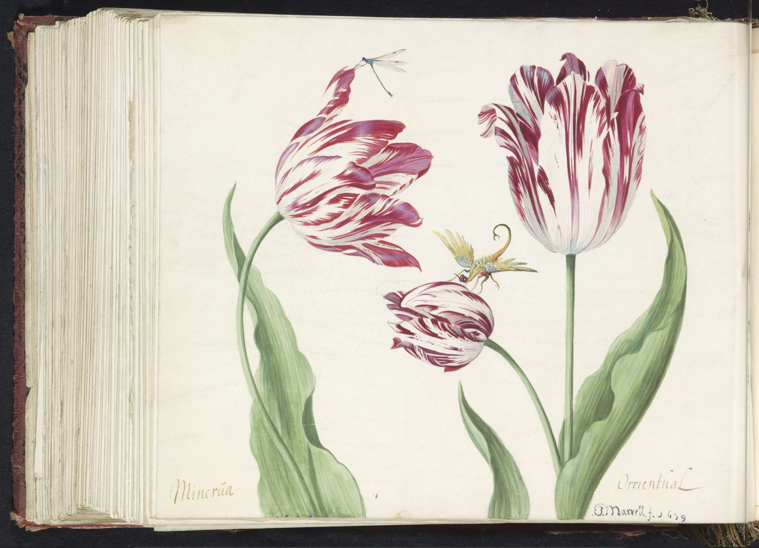 Drie tulpen met waterjuffer en een ander insect