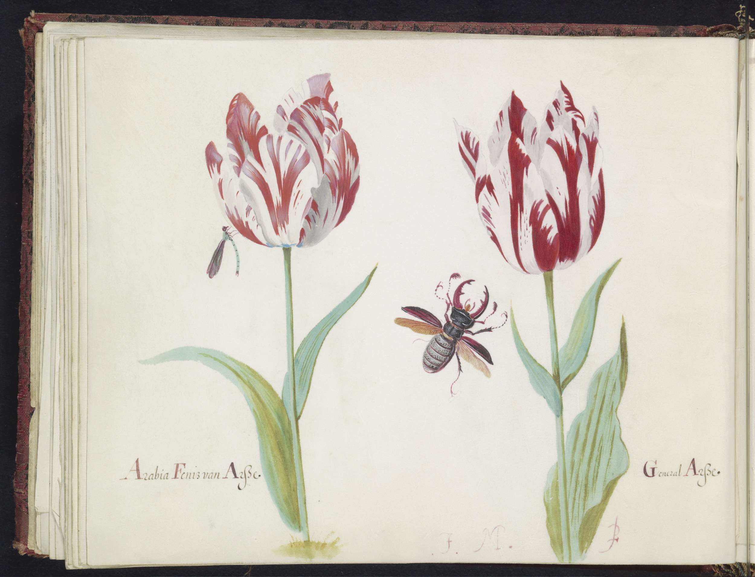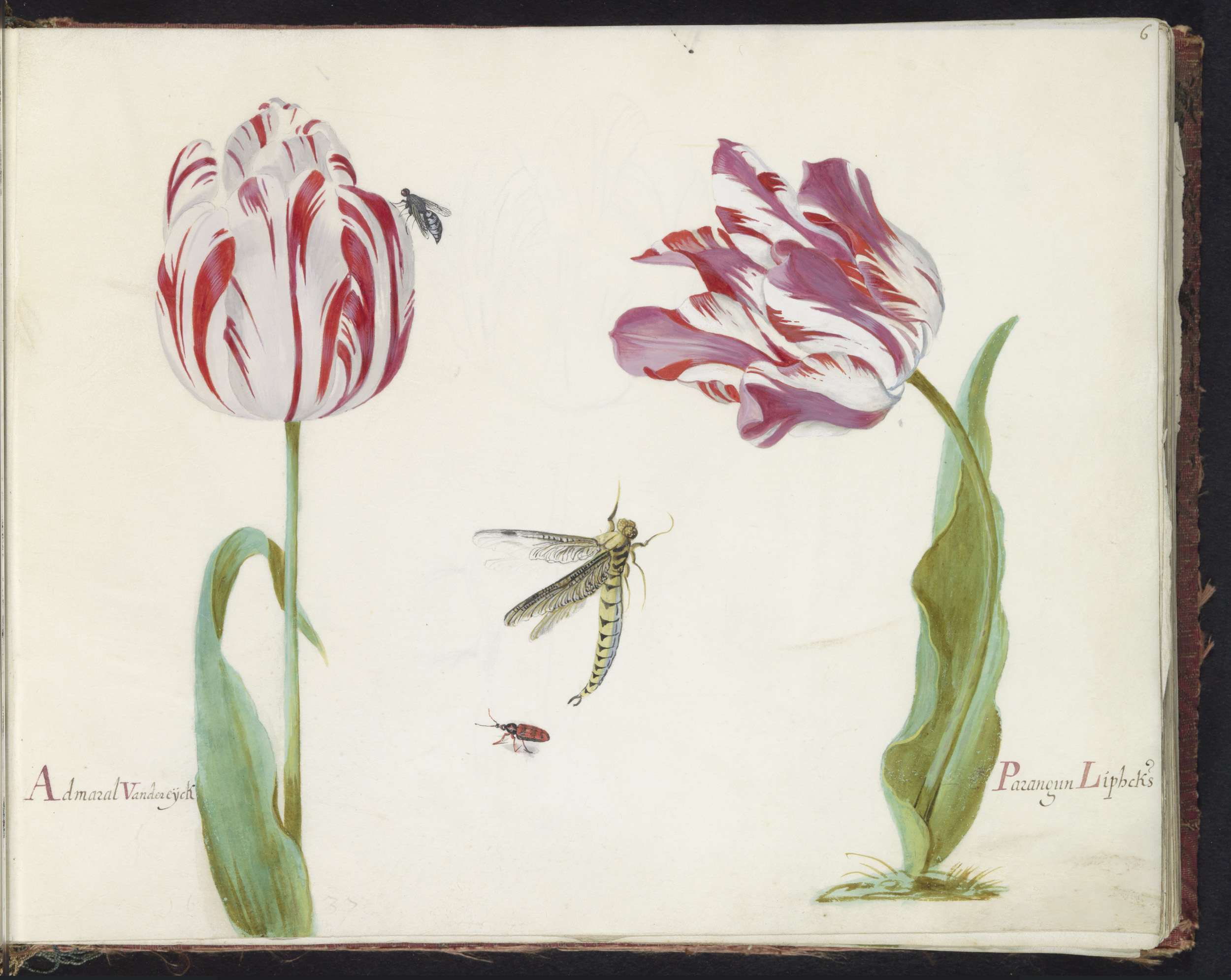 Twee tulpen met vlieg, libelle en kever
