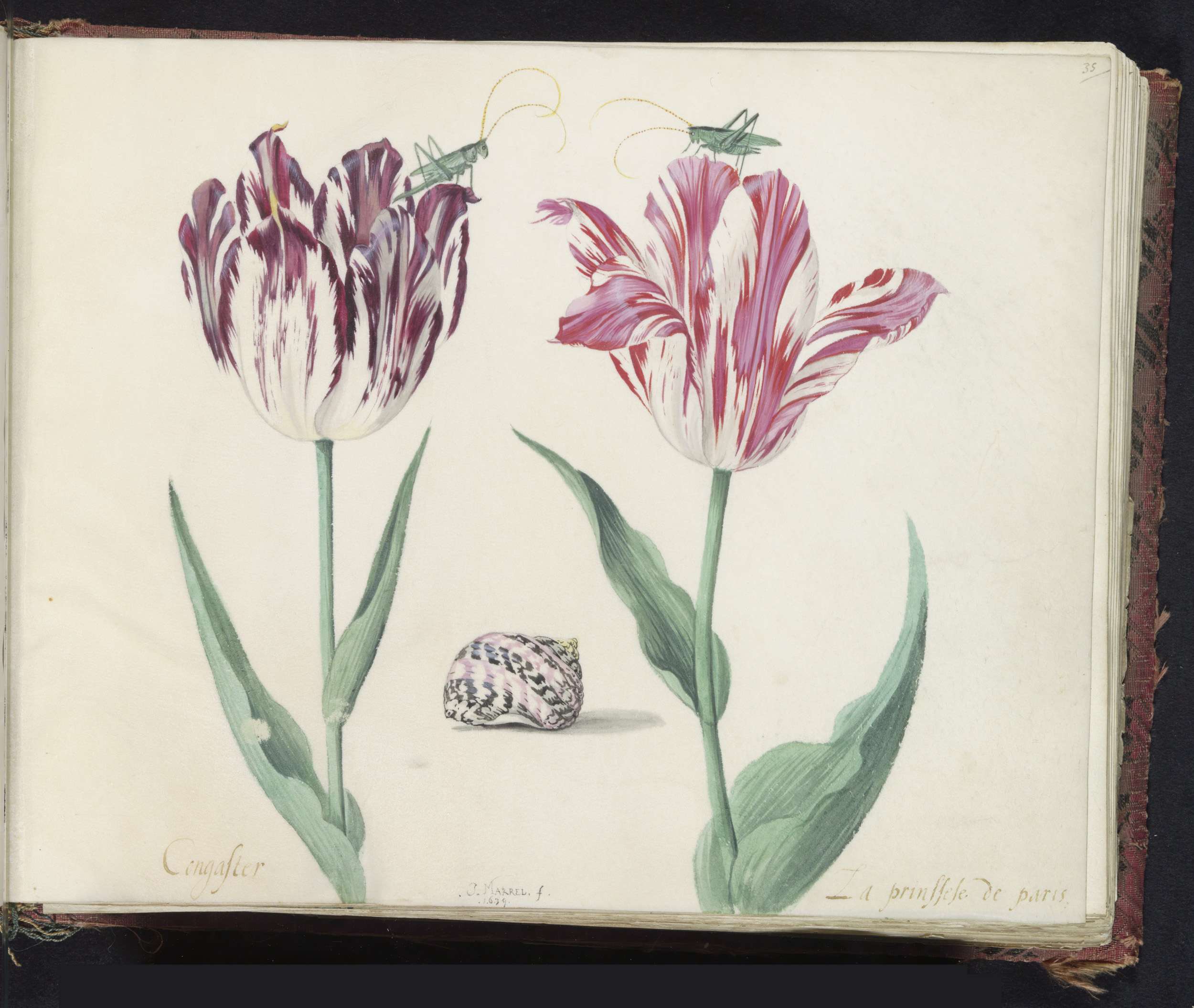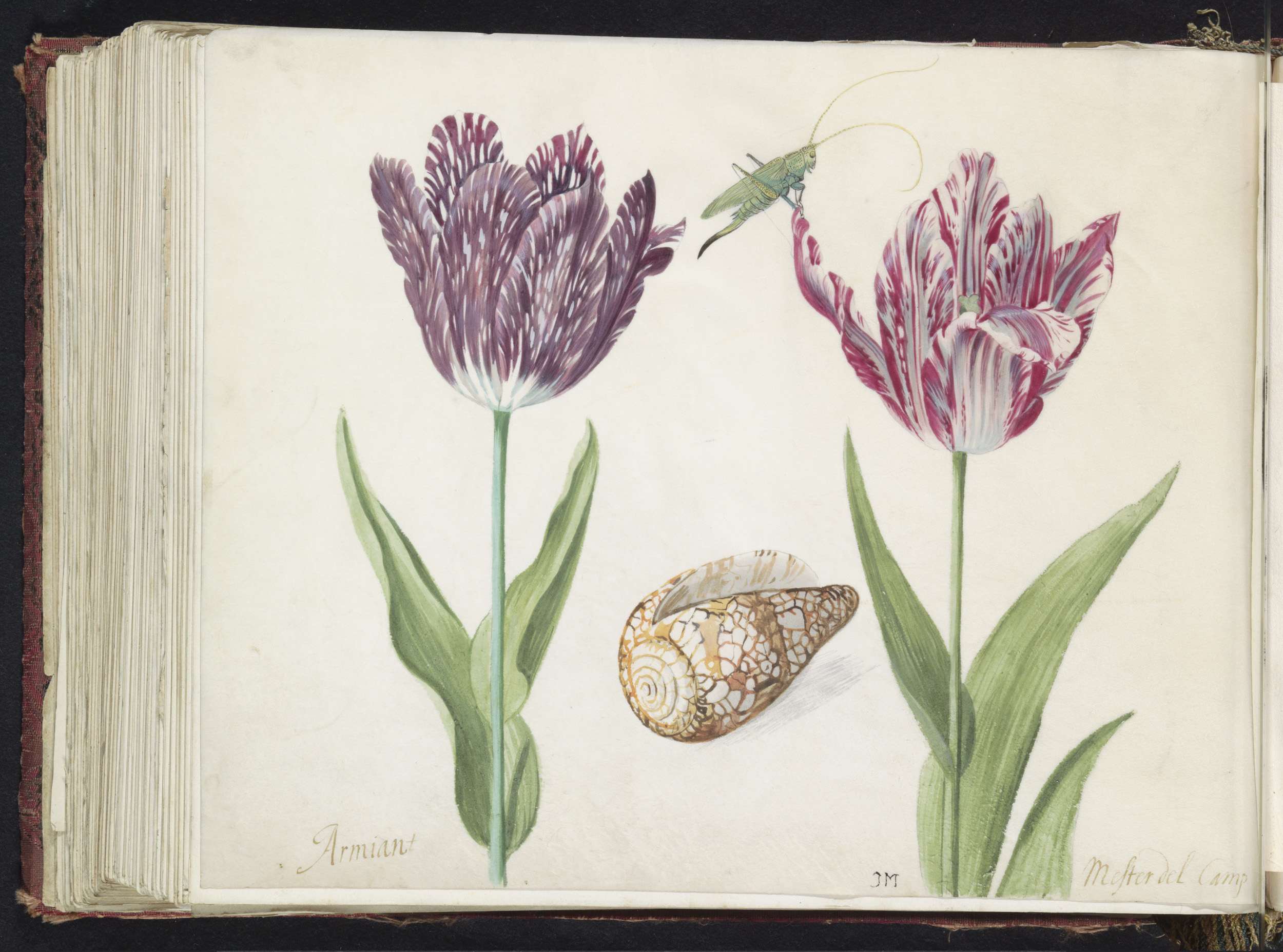 Twee tulpen met schelp en sprinkhaan